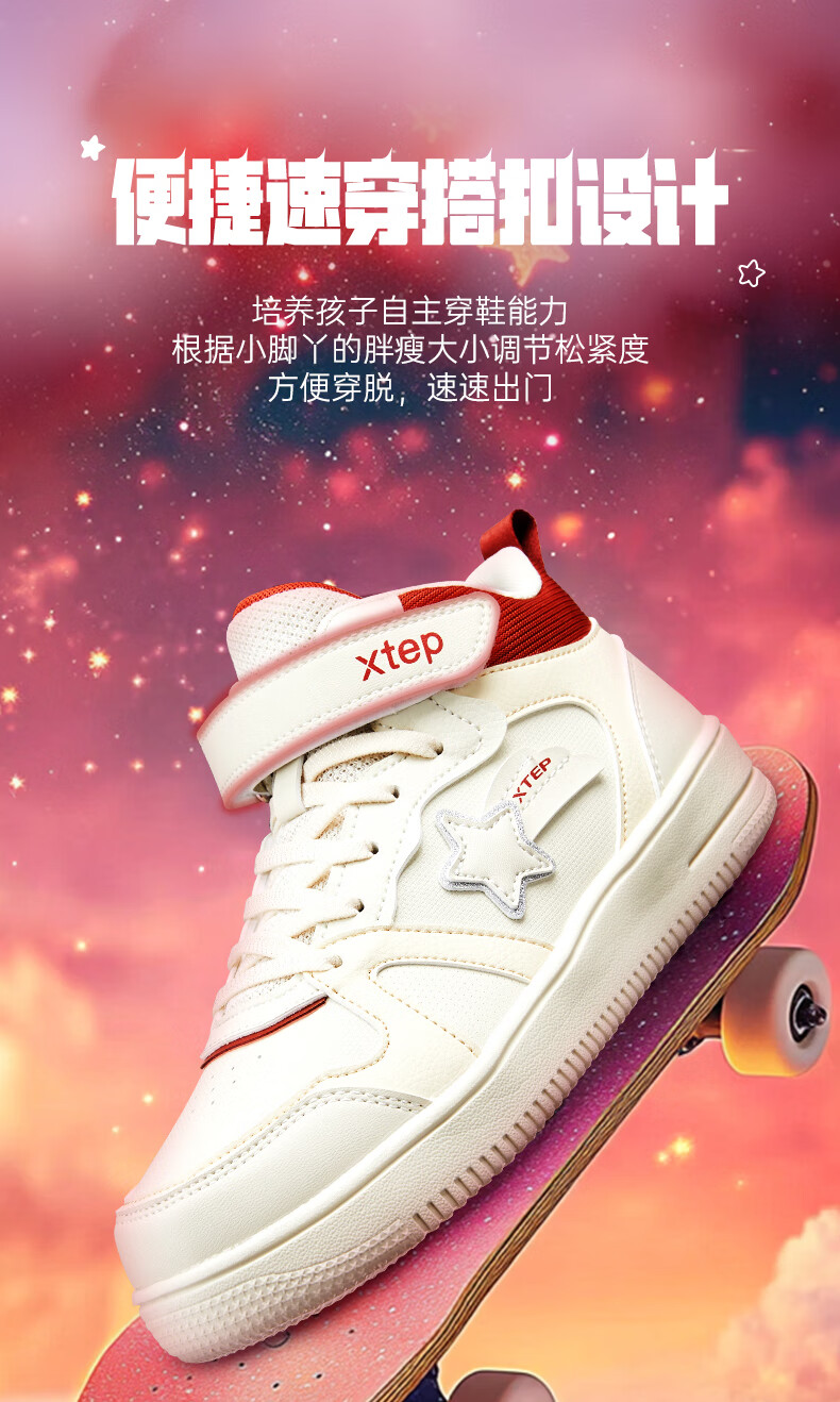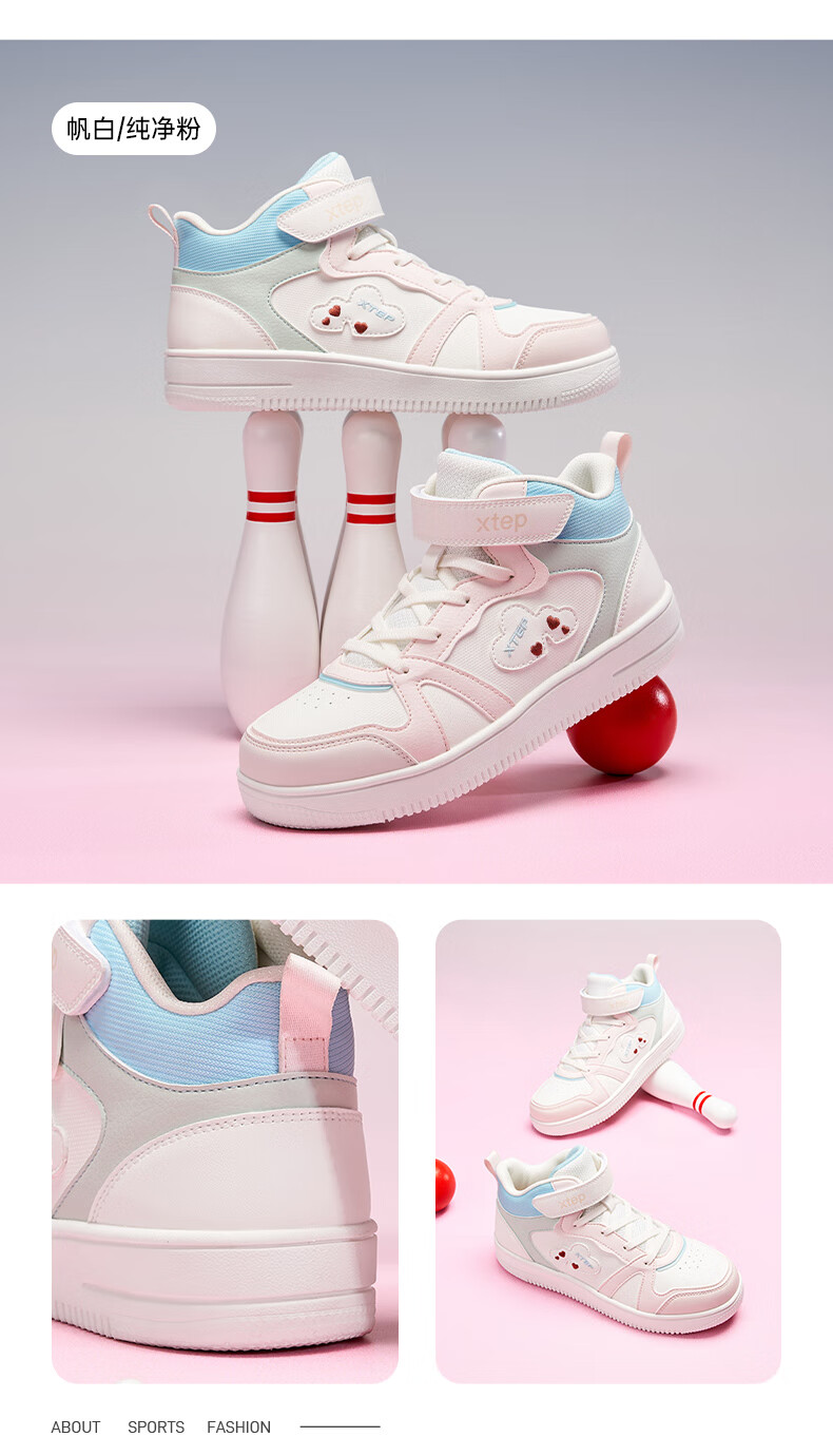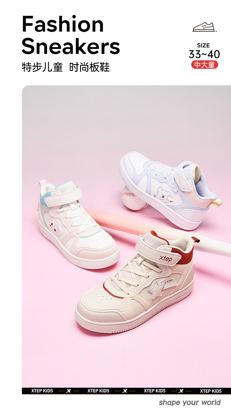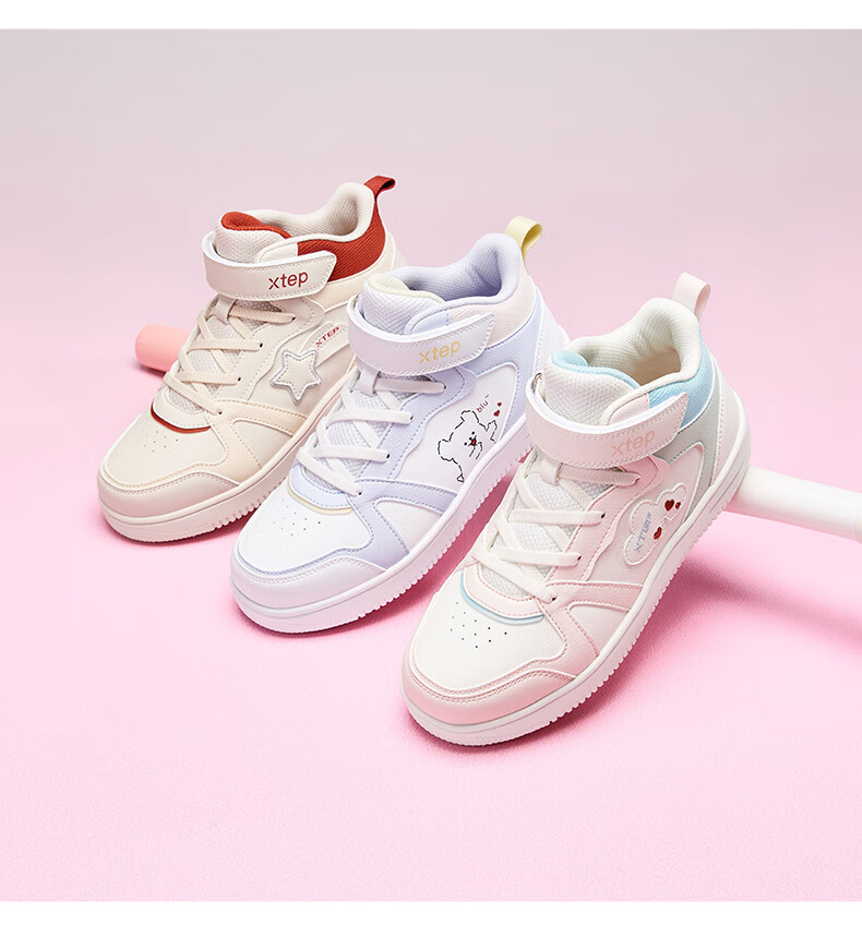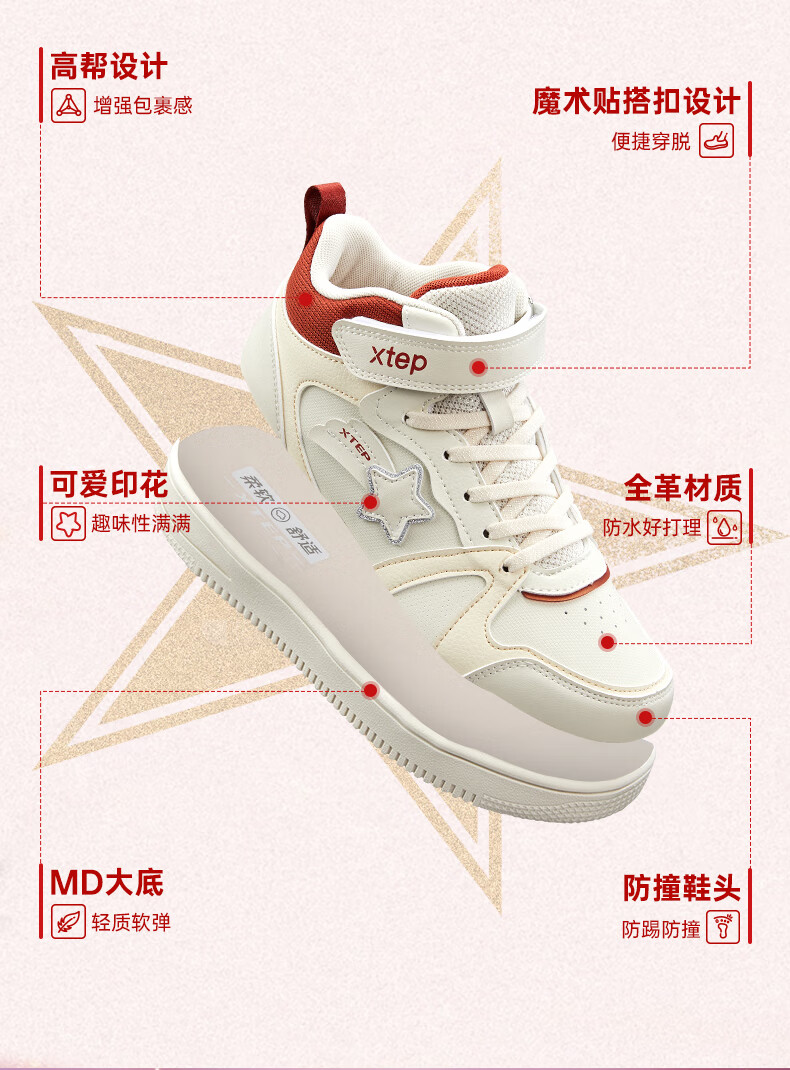 特步童鞋儿童板鞋女童中大童革面新年款耐磨拼色鞋萌趣装饰魔术贴板鞋 帆白/纯净粉 36