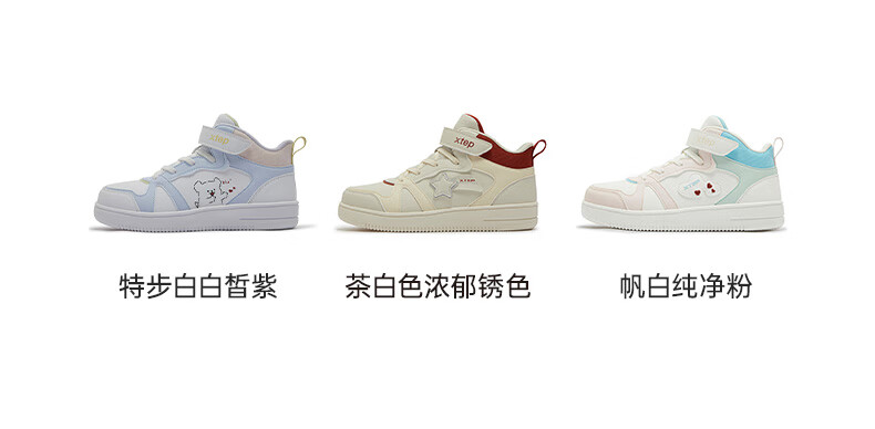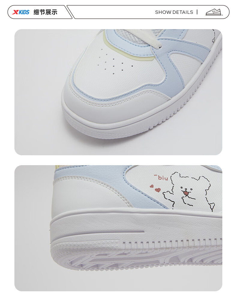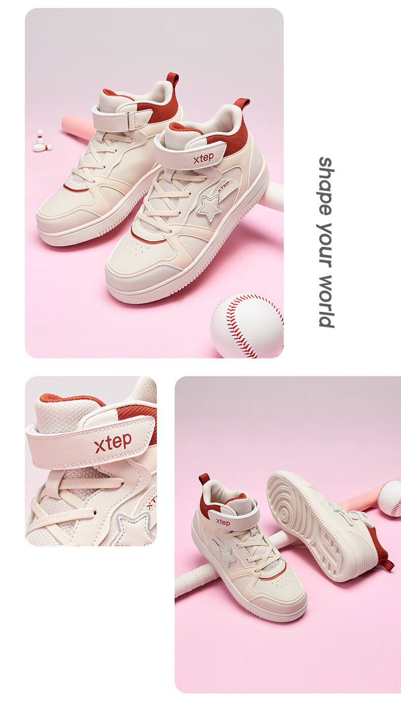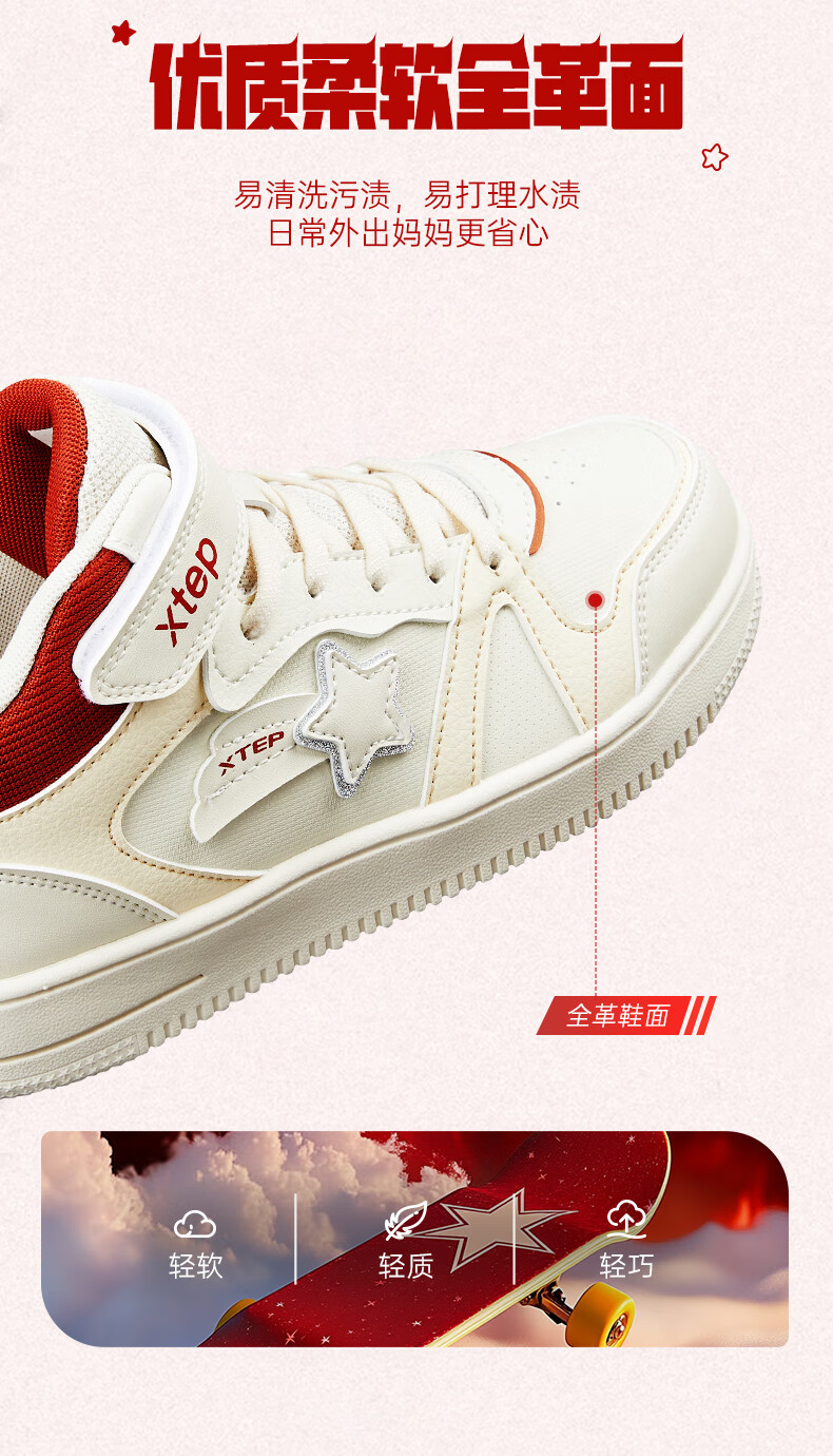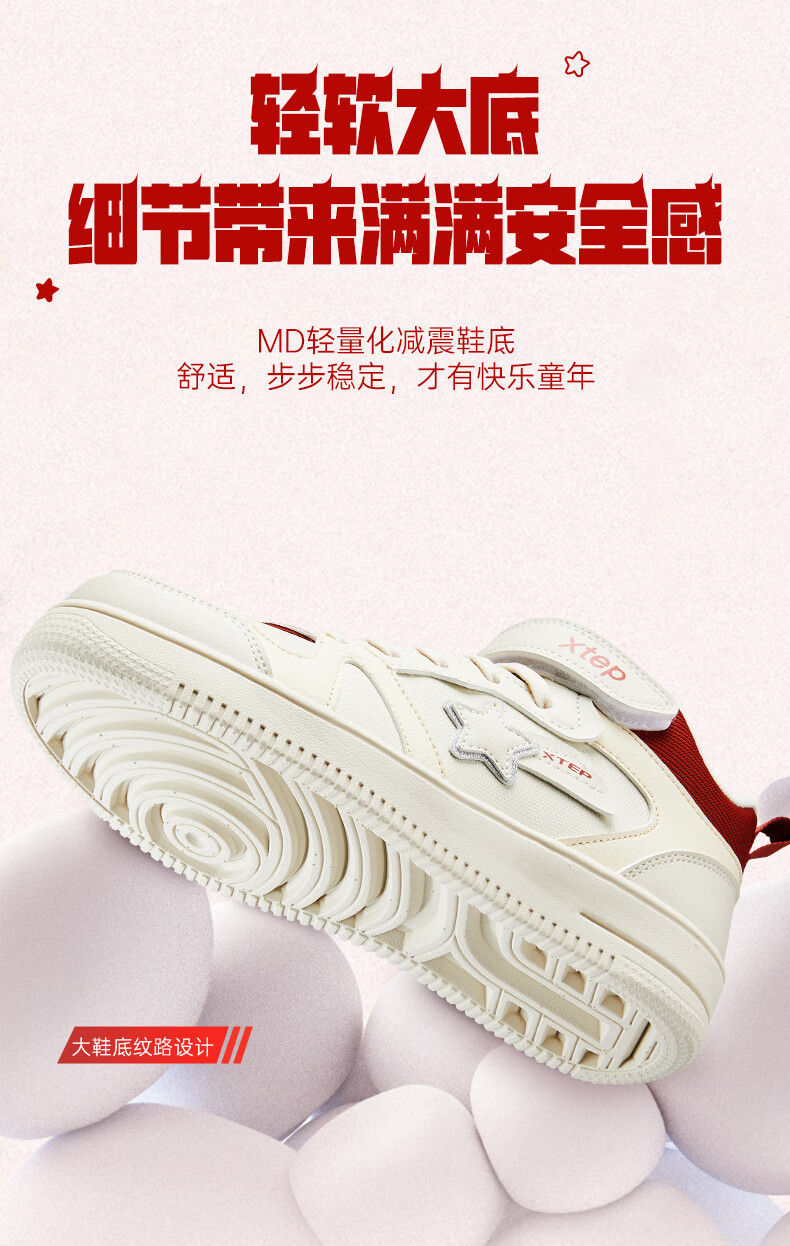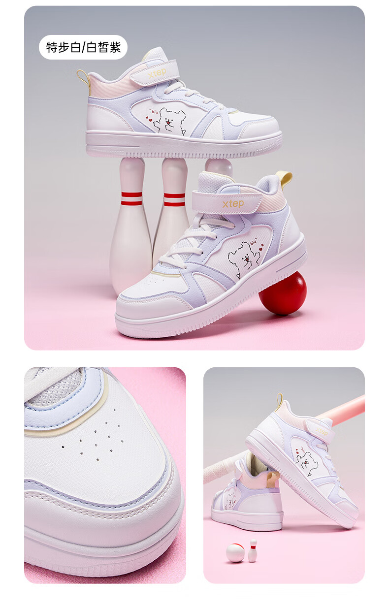 特步童鞋儿童板鞋女童中大童革面新年款耐磨拼色鞋萌趣装饰魔术贴板鞋 帆白/纯净粉 36