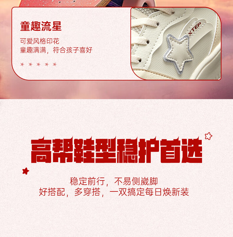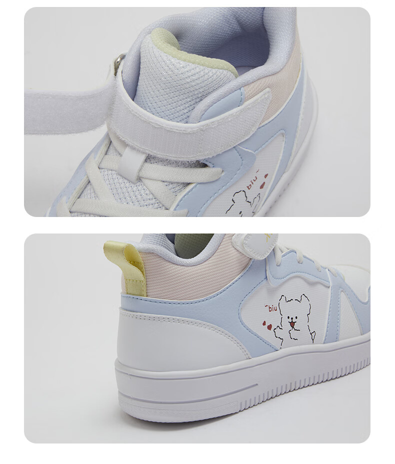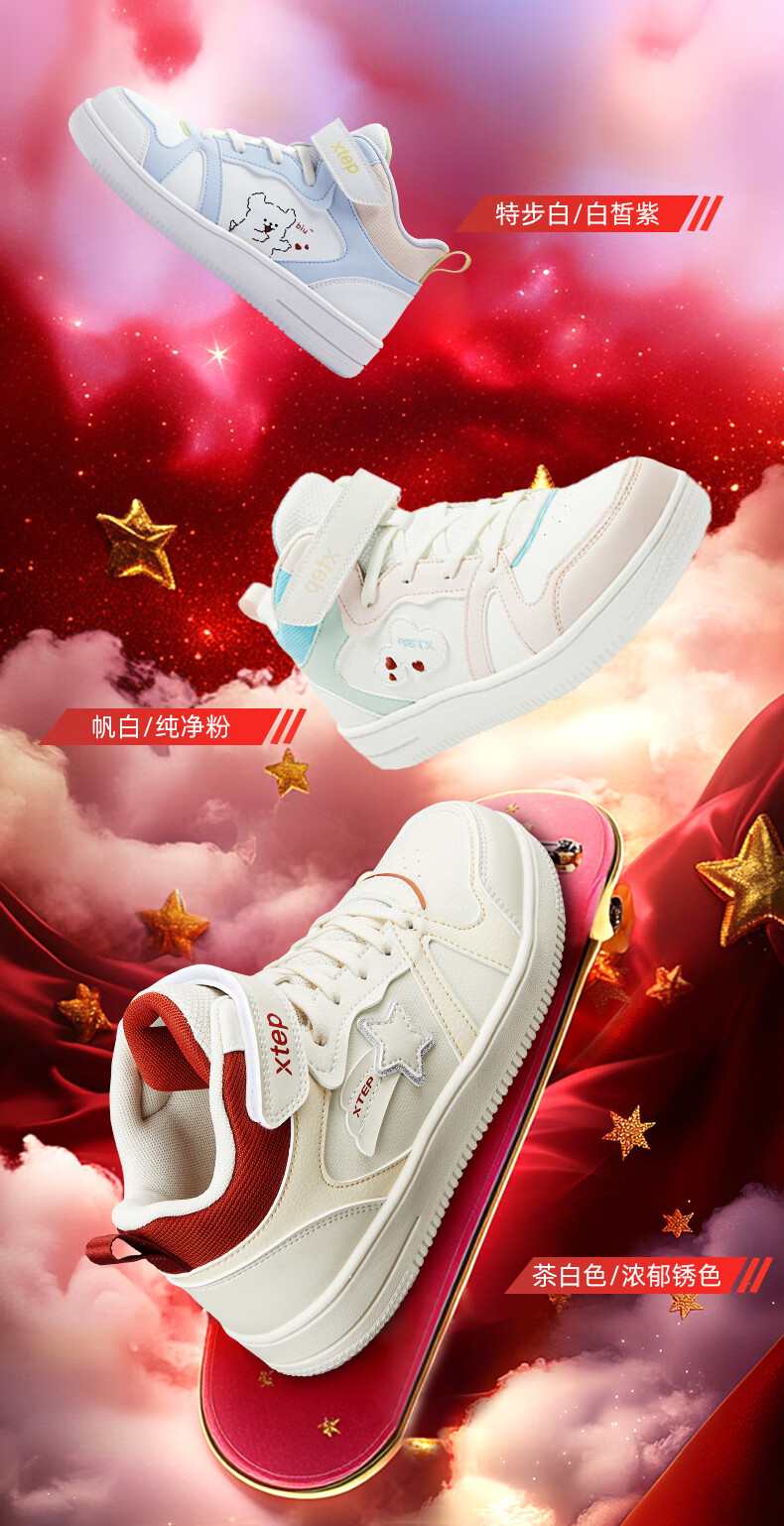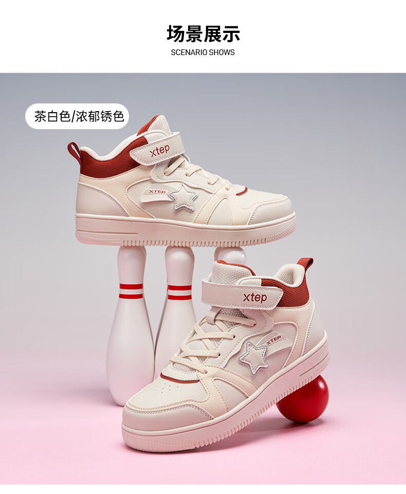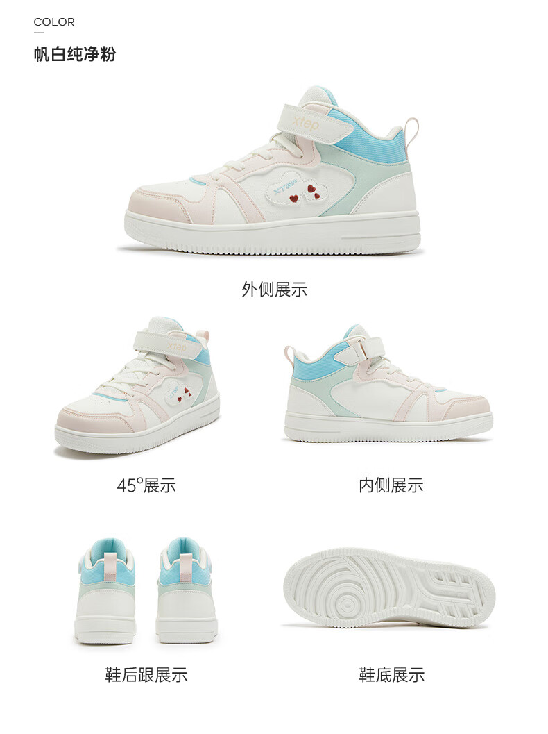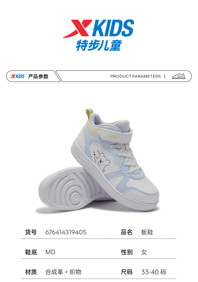 特步童鞋儿童板鞋女童中大童革面新年款耐磨拼色鞋萌趣装饰魔术贴板鞋 帆白/纯净粉 36