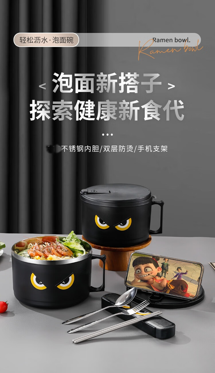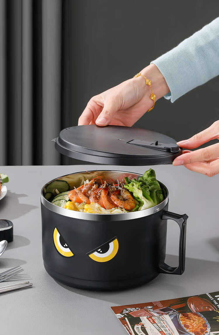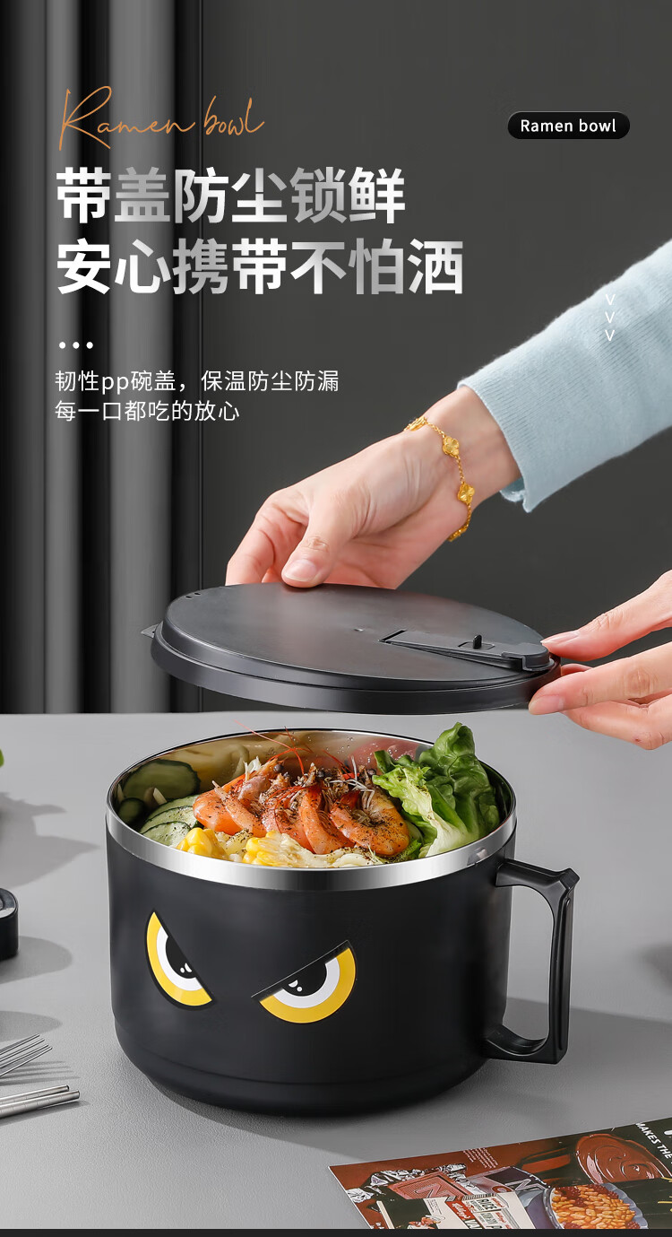 不锈钢泡面碗学生饭碗带盖滤水宿舍便当盒饭盒快餐杯保鲜盒泡面碗 猫眼款【大号】赠餐具1600ml