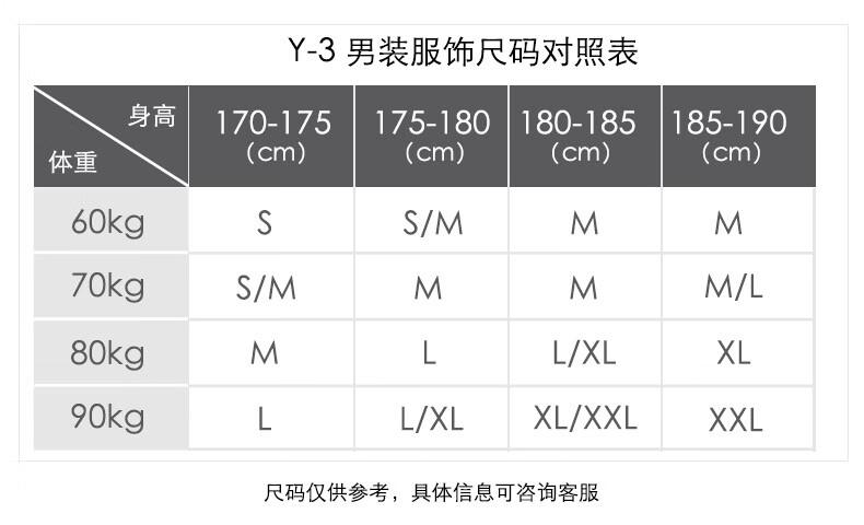 China (cm) 165 / 88-90 170 / 96-98 175 / 108-110 180 / 118-122 185 / 126-130
