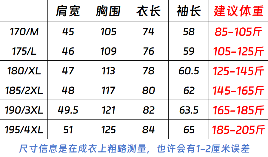 China (cm) 165 / 88-90 170 / 96-98 175 / 108-110 180 / 118-122 185 / 126-130