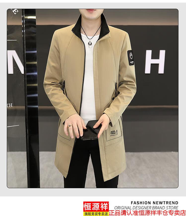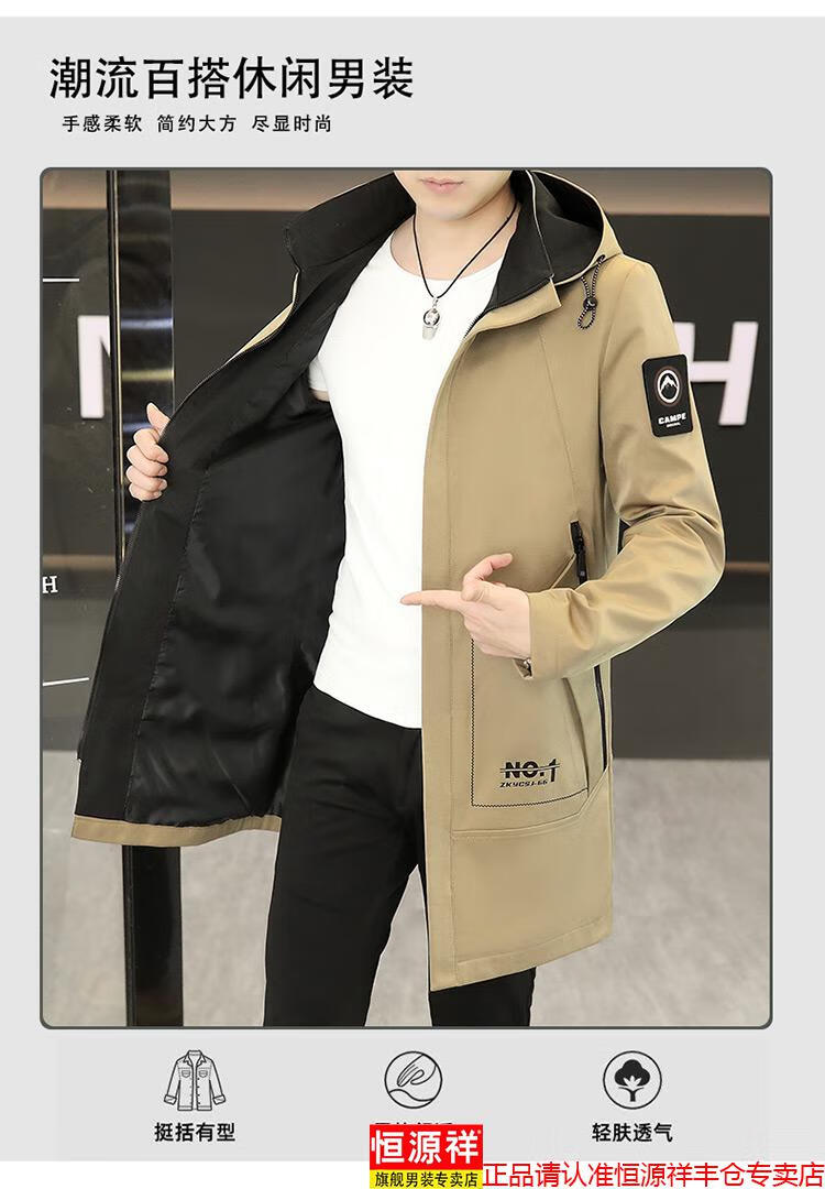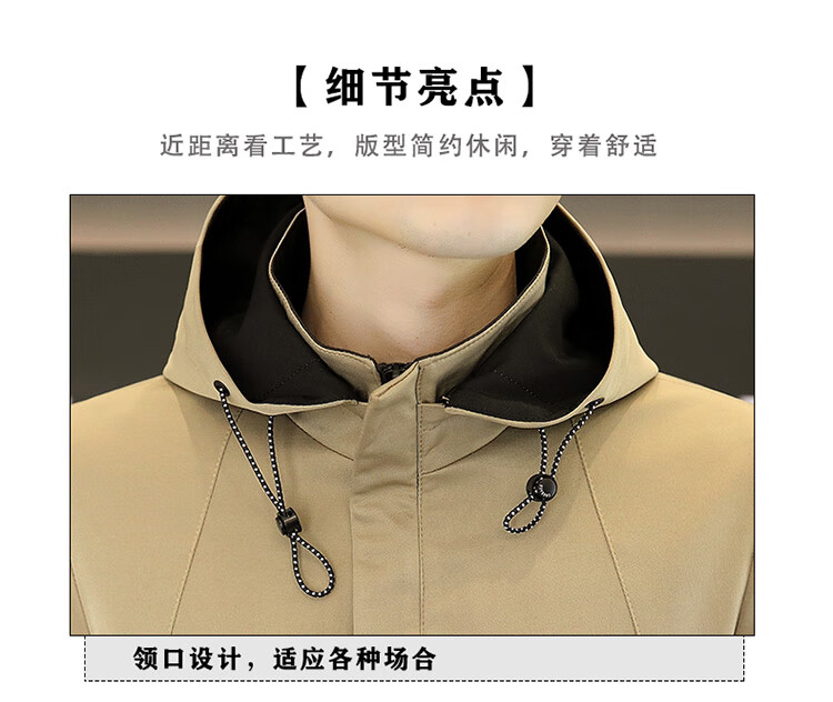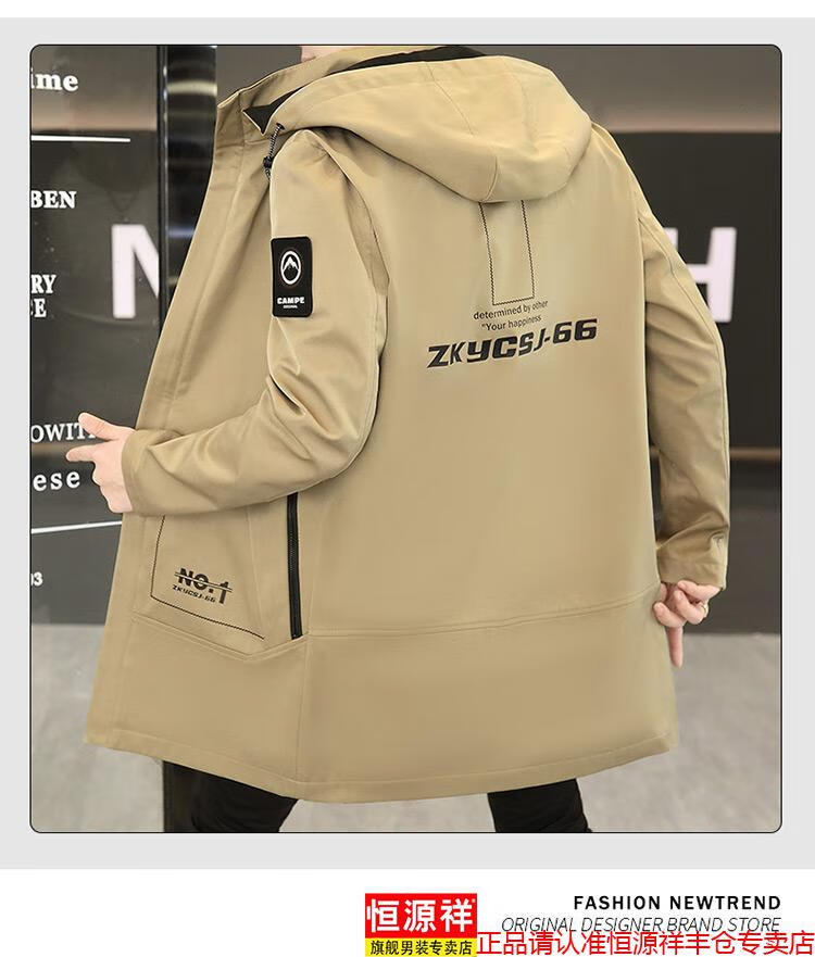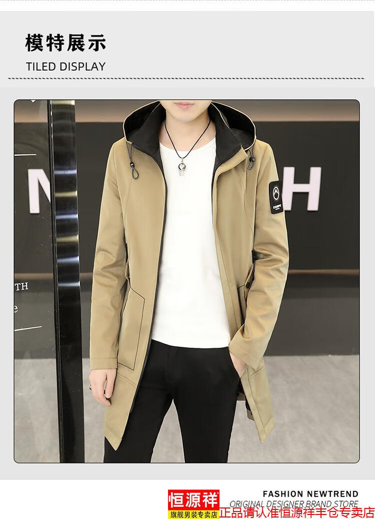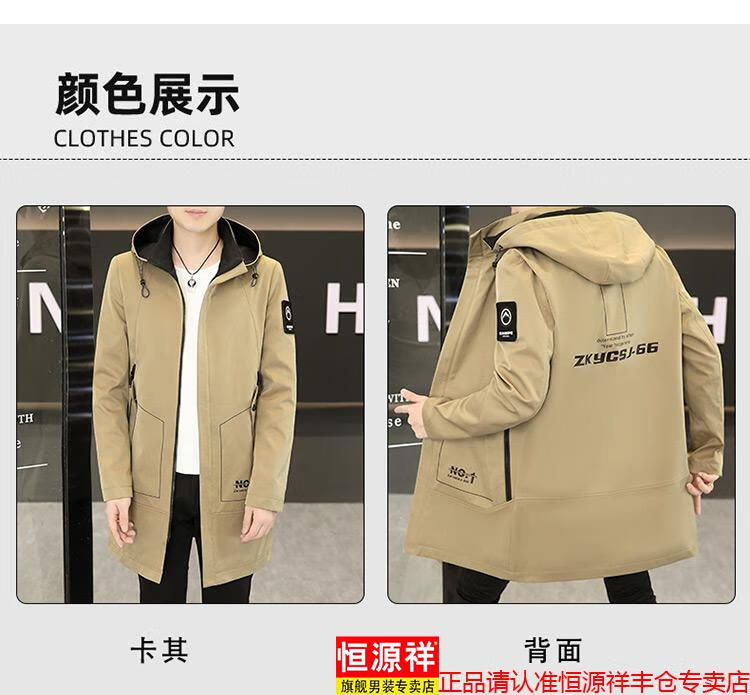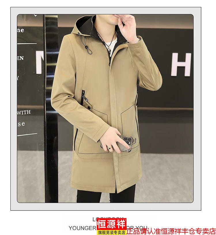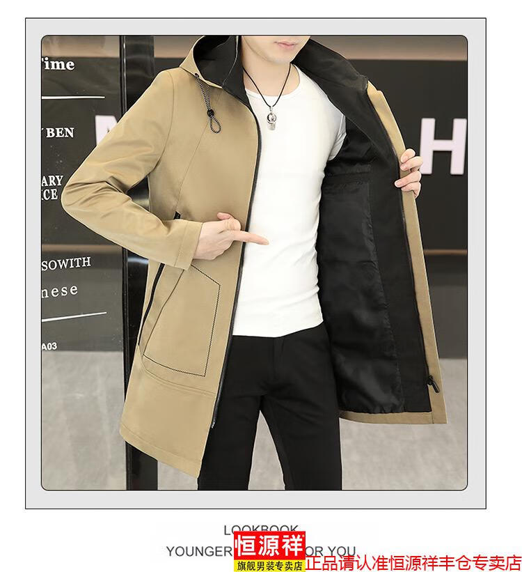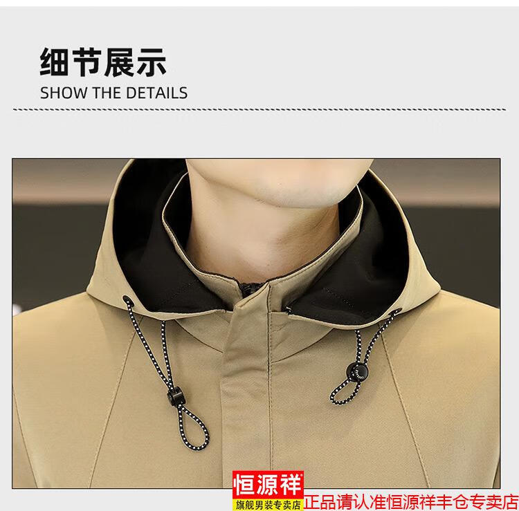 恒源祥春秋季中长款可卸帽风衣男士韩版潮流百搭夹克外套大码男装上衣服 卡其色 M 建议92到103斤