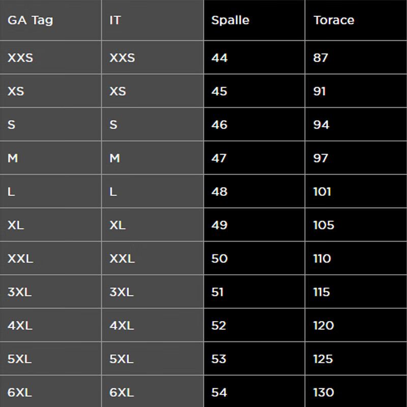 China (cm) 165 / 88-90 170 / 96-98 175 / 108-110 180 / 118-122 185 / 126-130