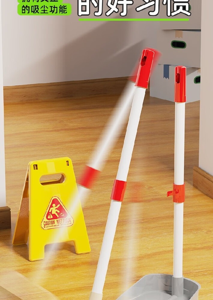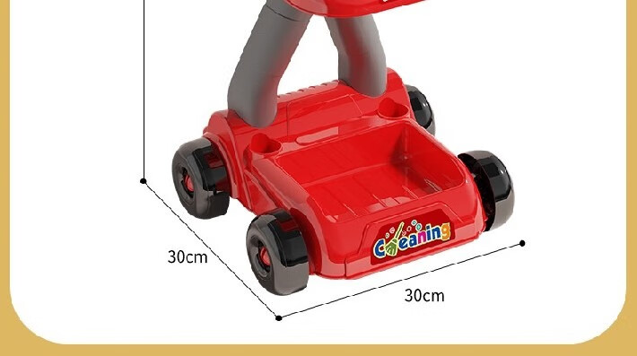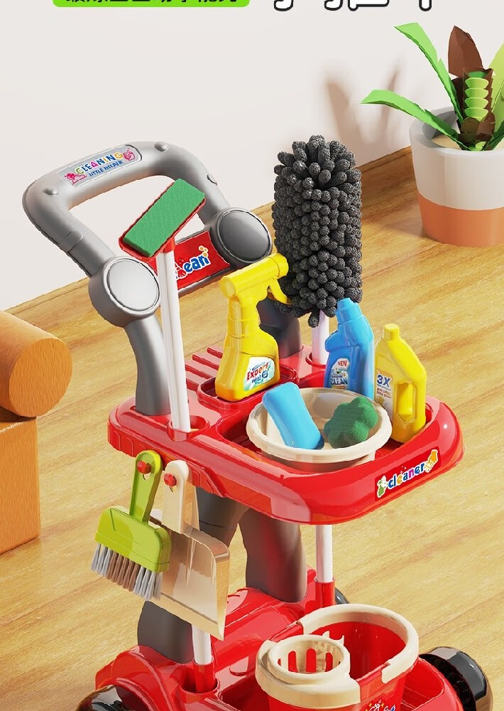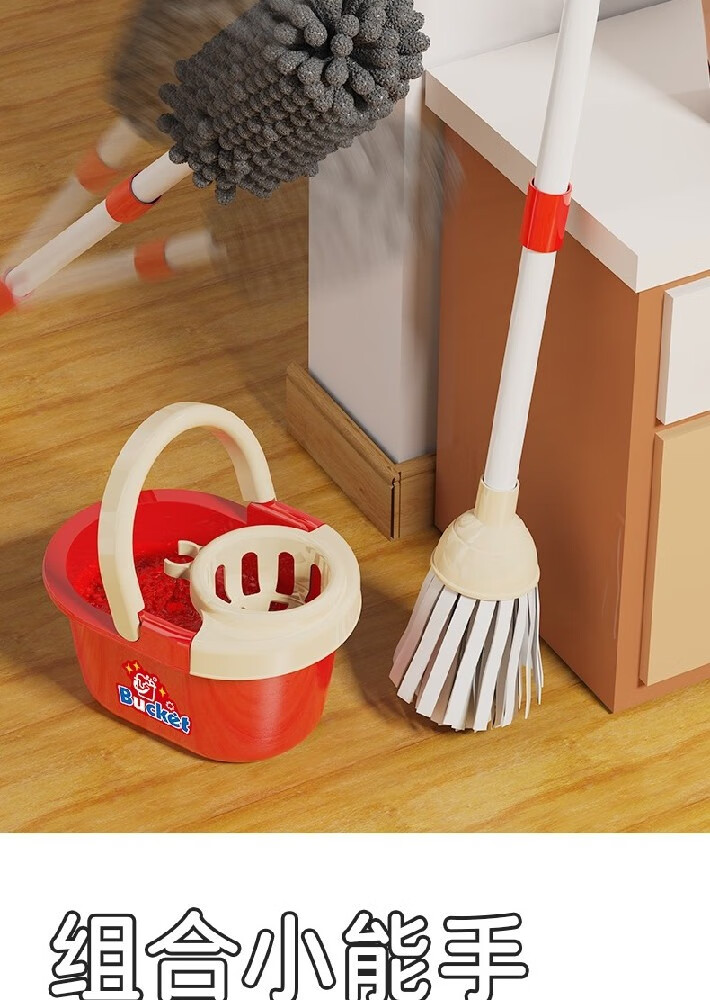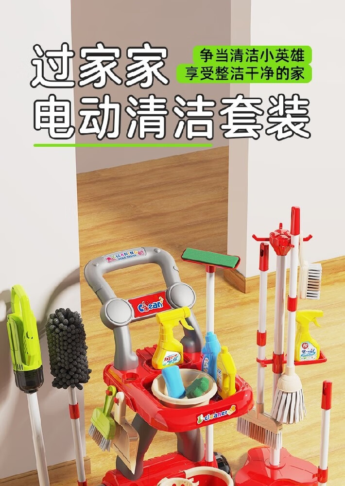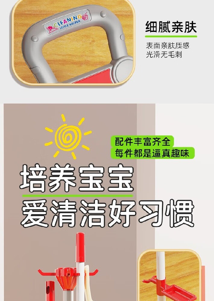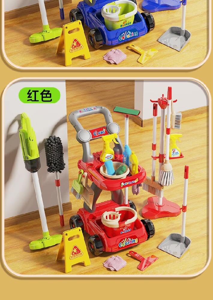 儿童过家家早教拖把扫把簸箕套装宝宝家用小拖布迷你扫帚扫地工具 清洁推车19件+电动吸尘器 礼盒红 六一儿童节礼物