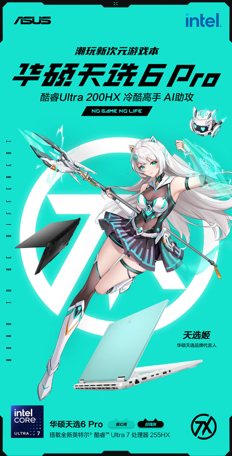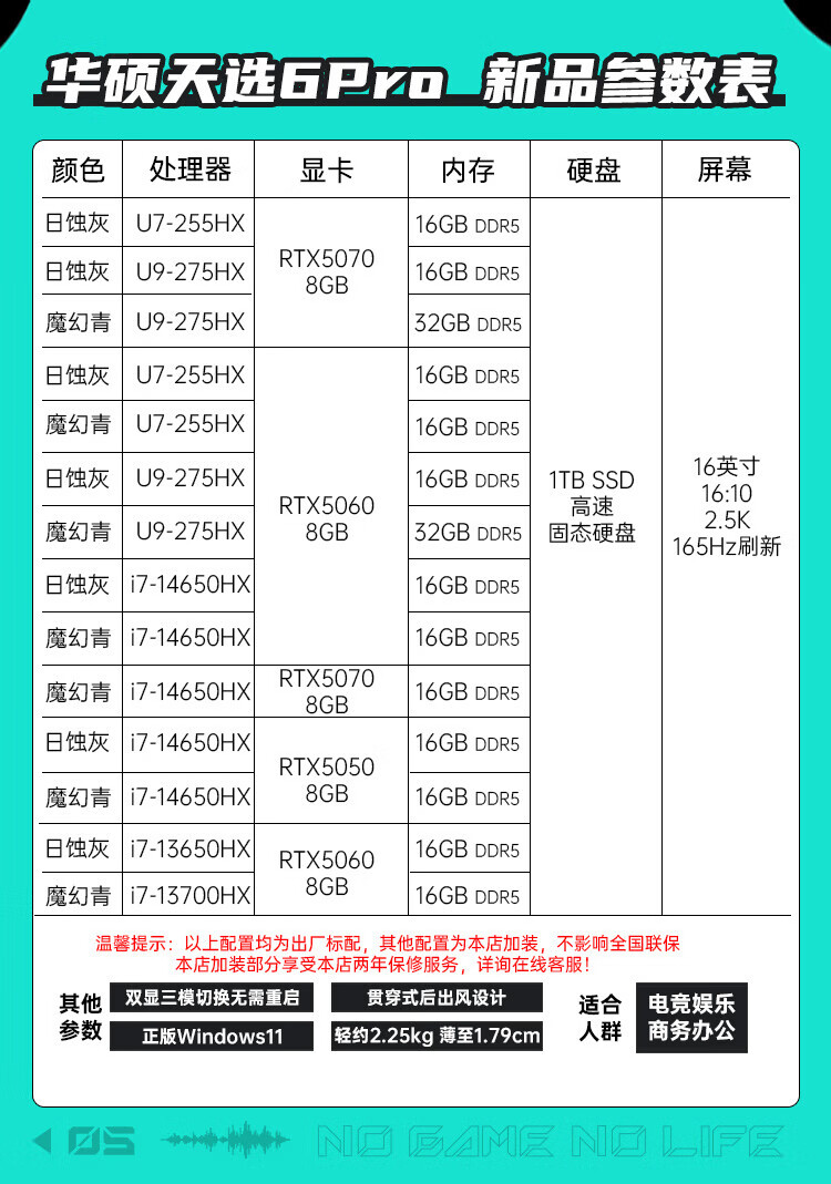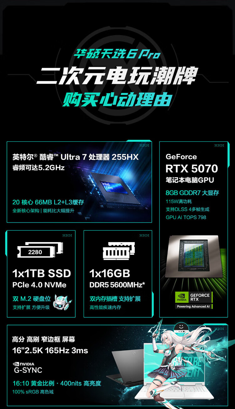 华硕天选6 Pro 酷睿版【国家补贴】16英寸电竞游戏本笔记本电脑 酷睿U7-255HX/RTX5060/日蚀灰 16G内存/1T高速固态硬盘 2.5K 165Hz 16:10高色域电竞屏