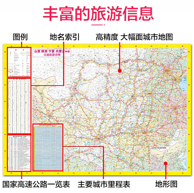 2024 Shanxi, Shaanxi, Ningxia und die Innere Mongolei-Transport- und Tourismuskarte. Wasserdicht und resistent gegen Falten und Reißen. Informationen zu Schnellstraßen, Nationalstraßen, Provinzstraßen und Eisenbahnattraktionen. China-Regionaltransport- und Tourismus-Detaillierte Karte. Selbstfahrender Nordwest-Tourismus. Shanxi, Shaanxi, Ningxia und die Innere Mongolei-Transport- und Tourismuskarte