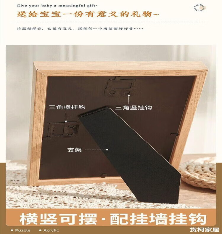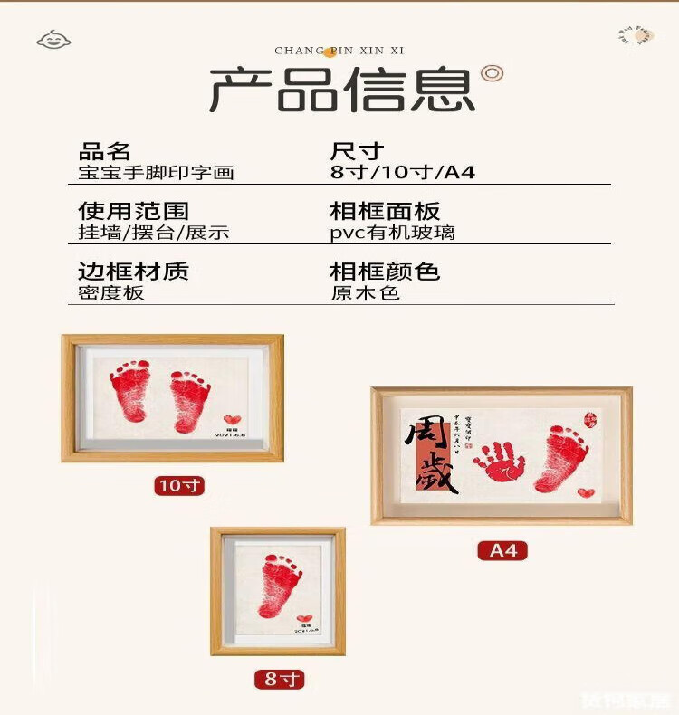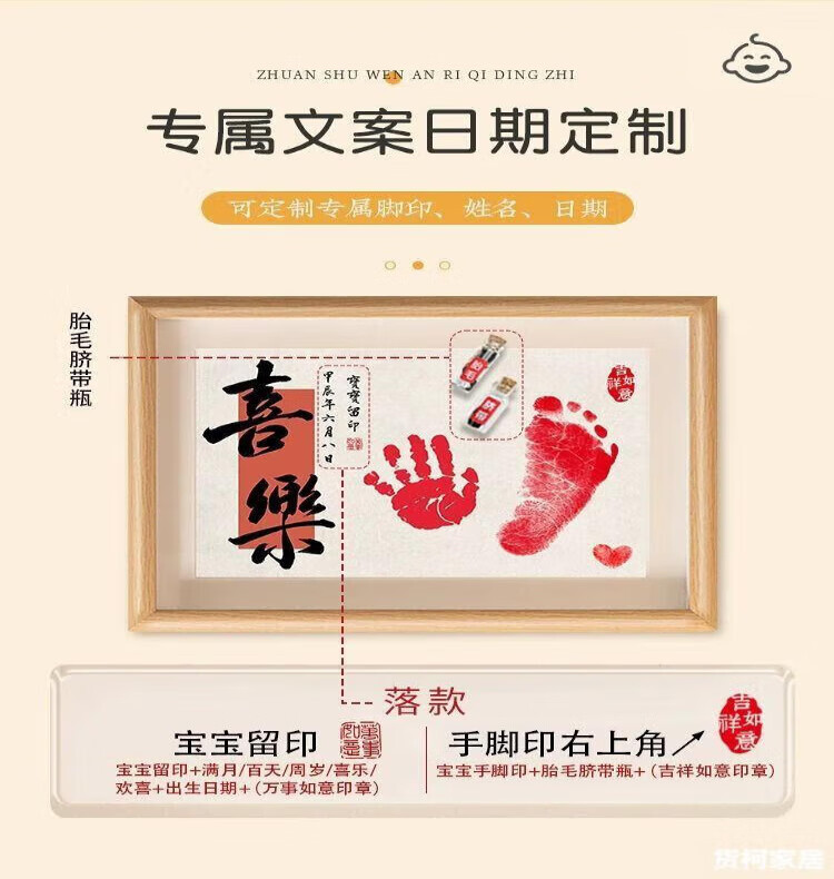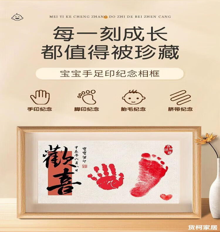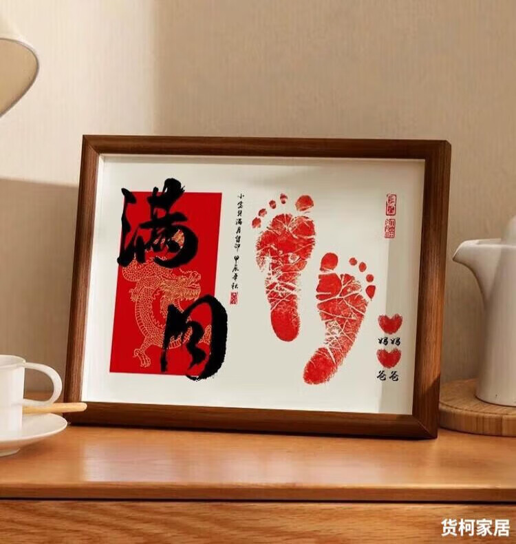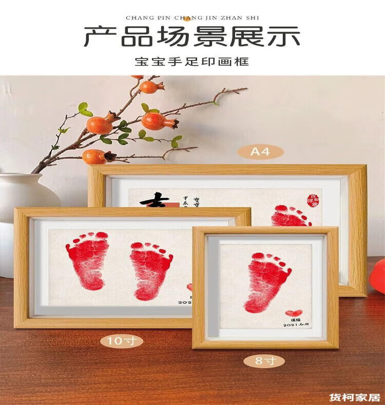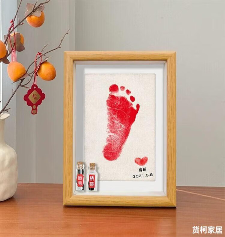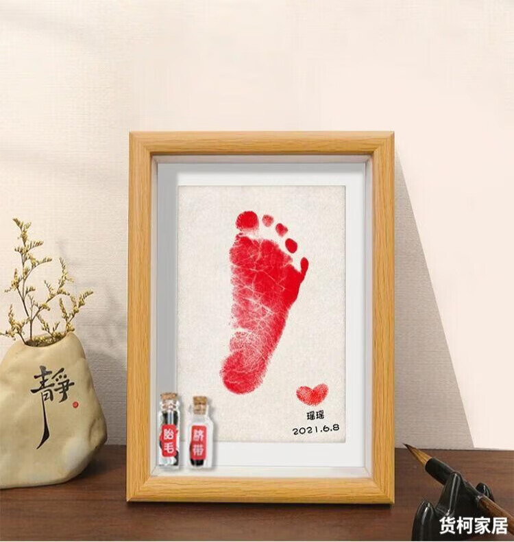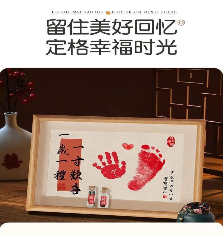 筏芯宝宝百天手足画满月手足脚印周岁纪念婴儿相框纪念品仪式抓周道具 A4(胡桃木色)【福慧绵长】书法手足印