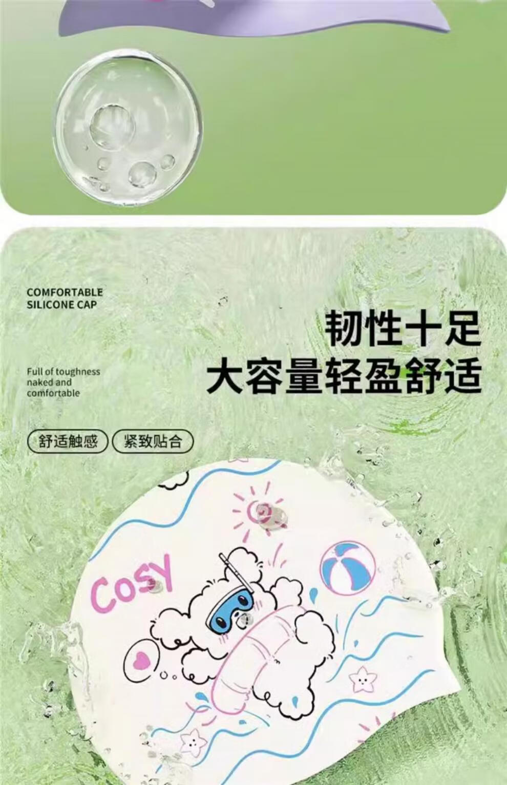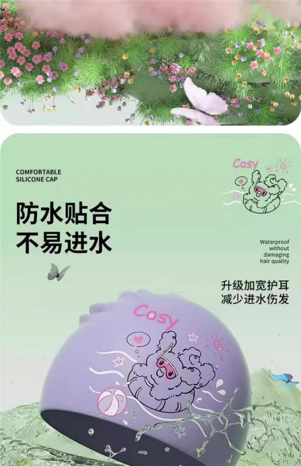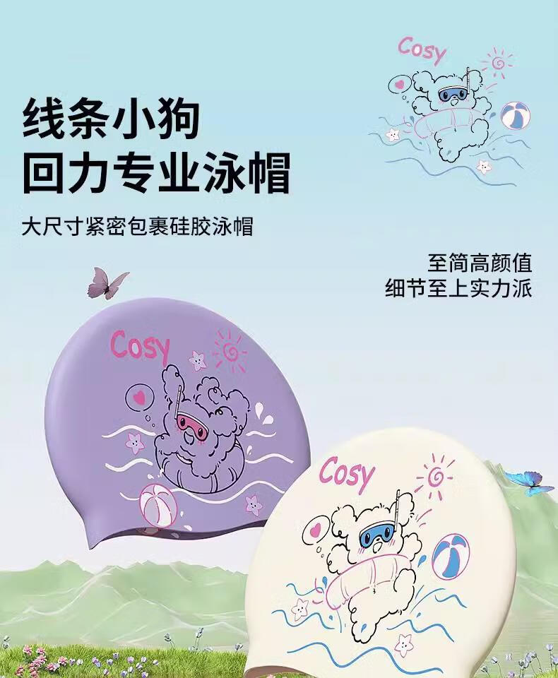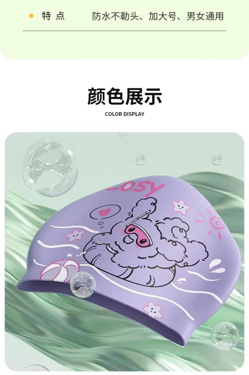 JCZS德国品牌硅胶泳帽女款长发加大头围成人可爱高颜值防水护耳游泳帽 紫色线条狗+粉色泳镜