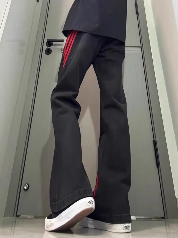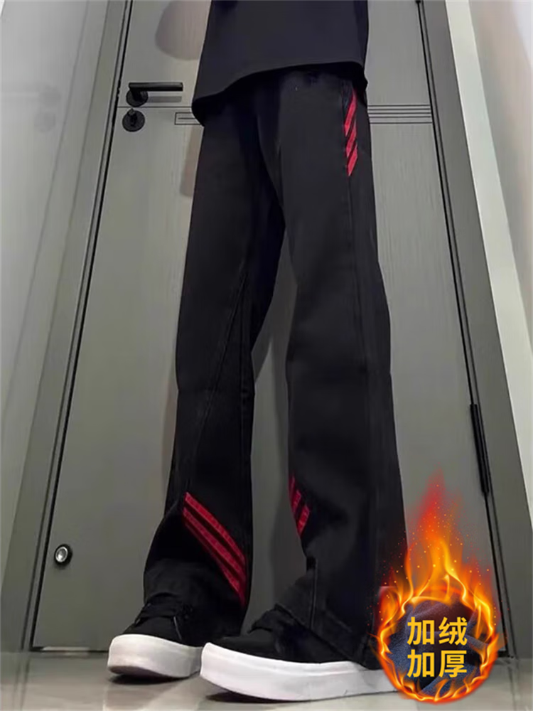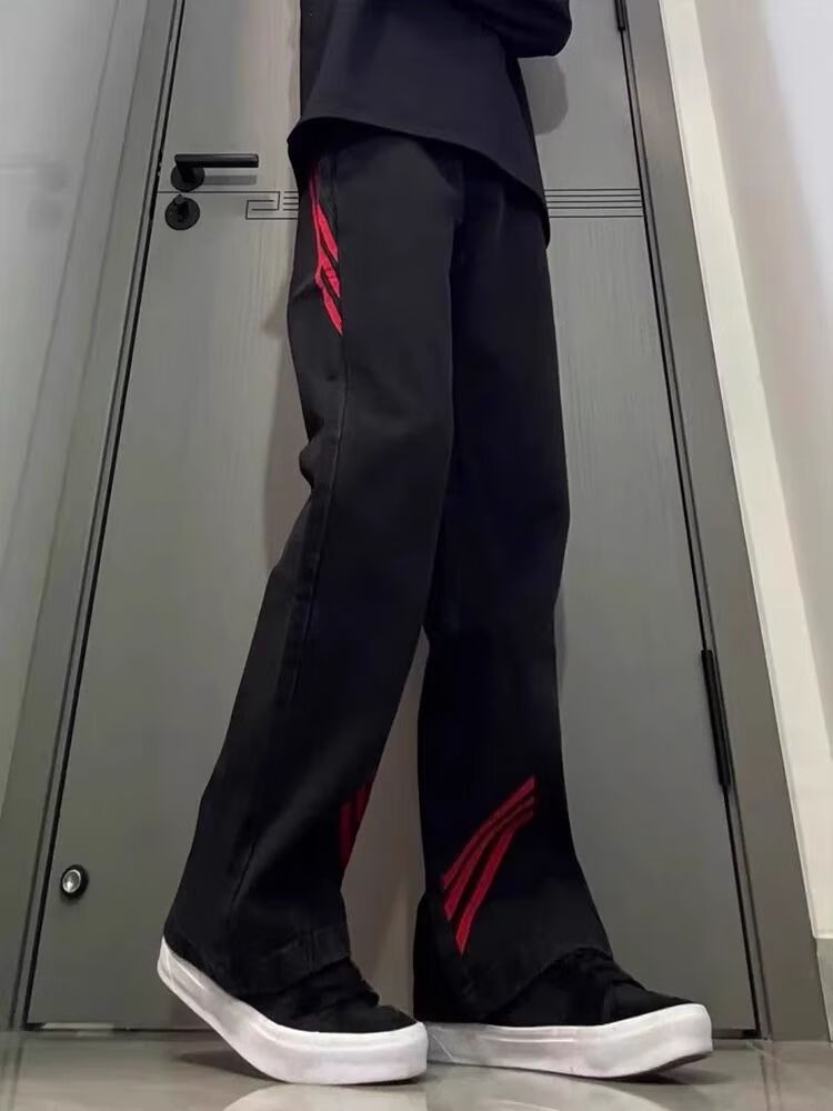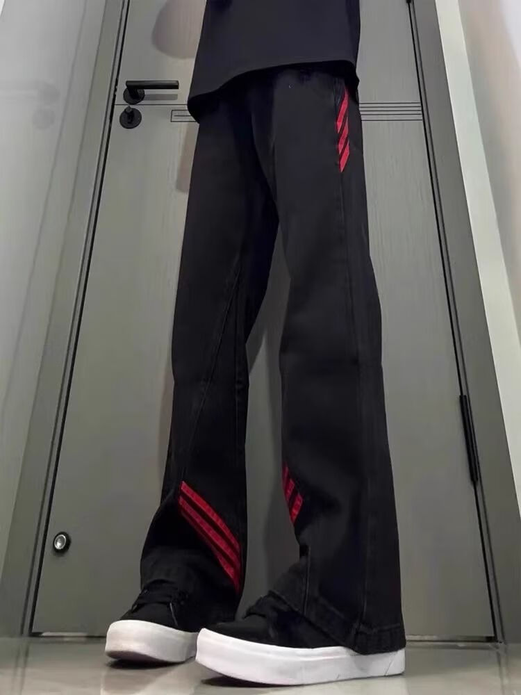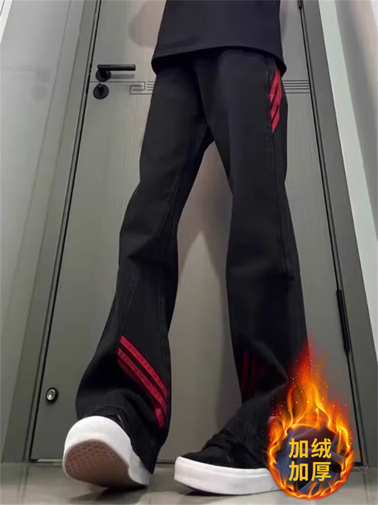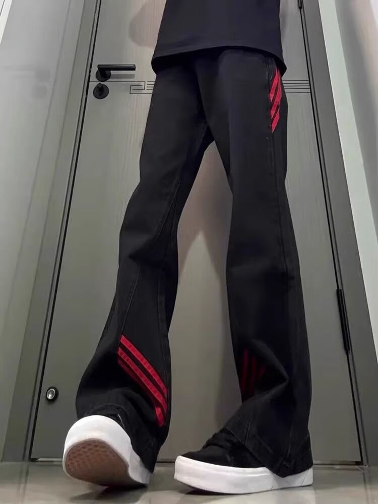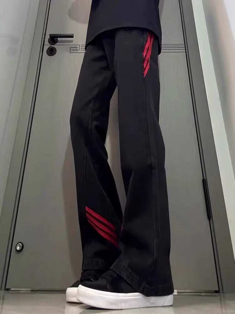 Katuchi red and black contrast stitching bootcut jeans for men in autumn and winter trendy high street design American workwear straight long pants black regular XL