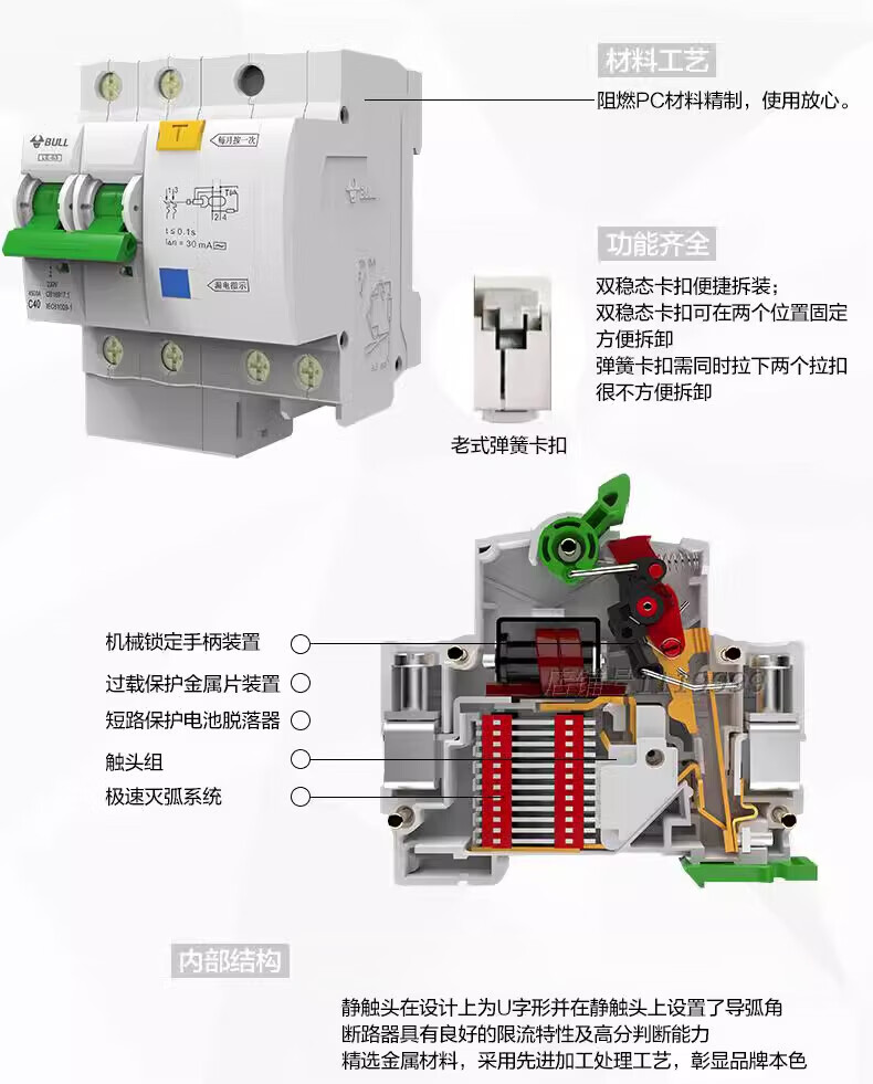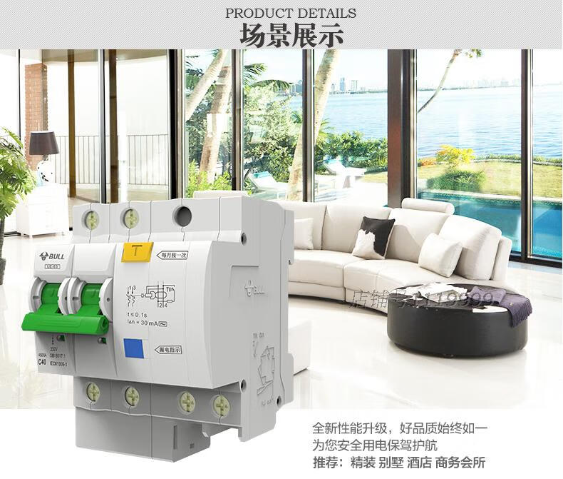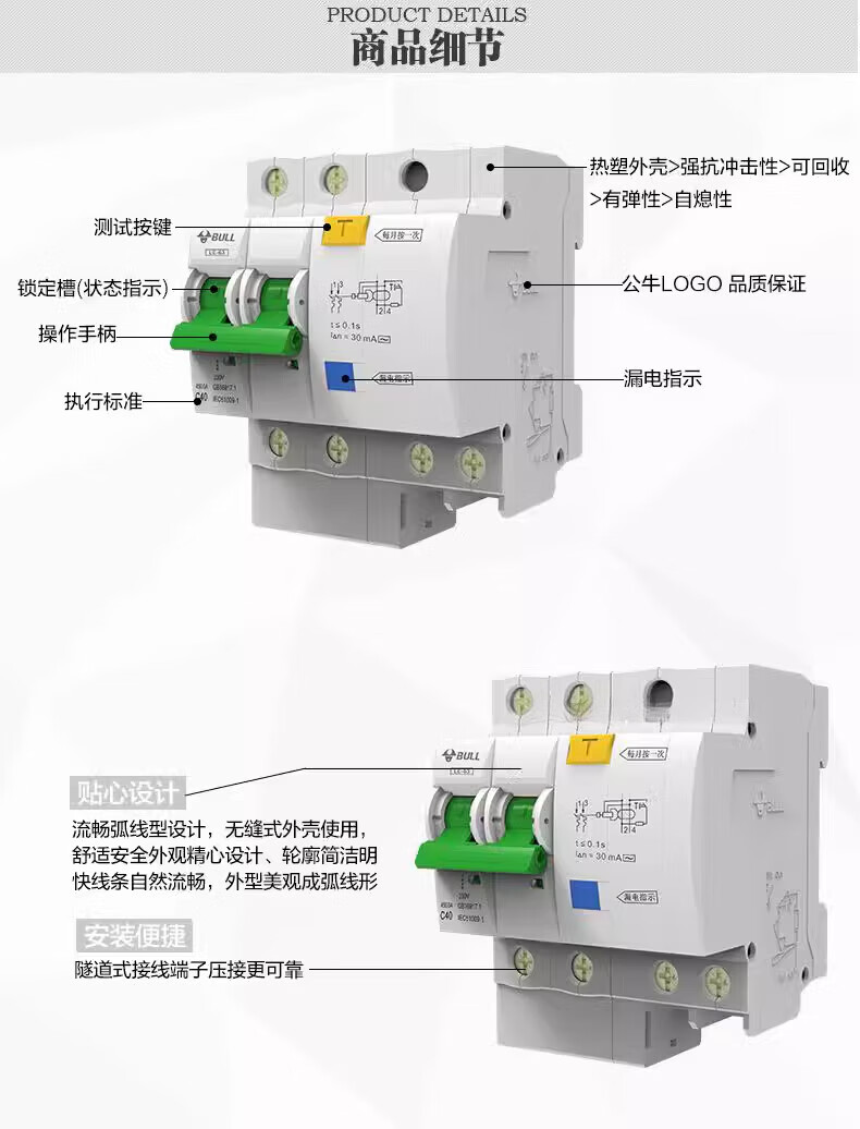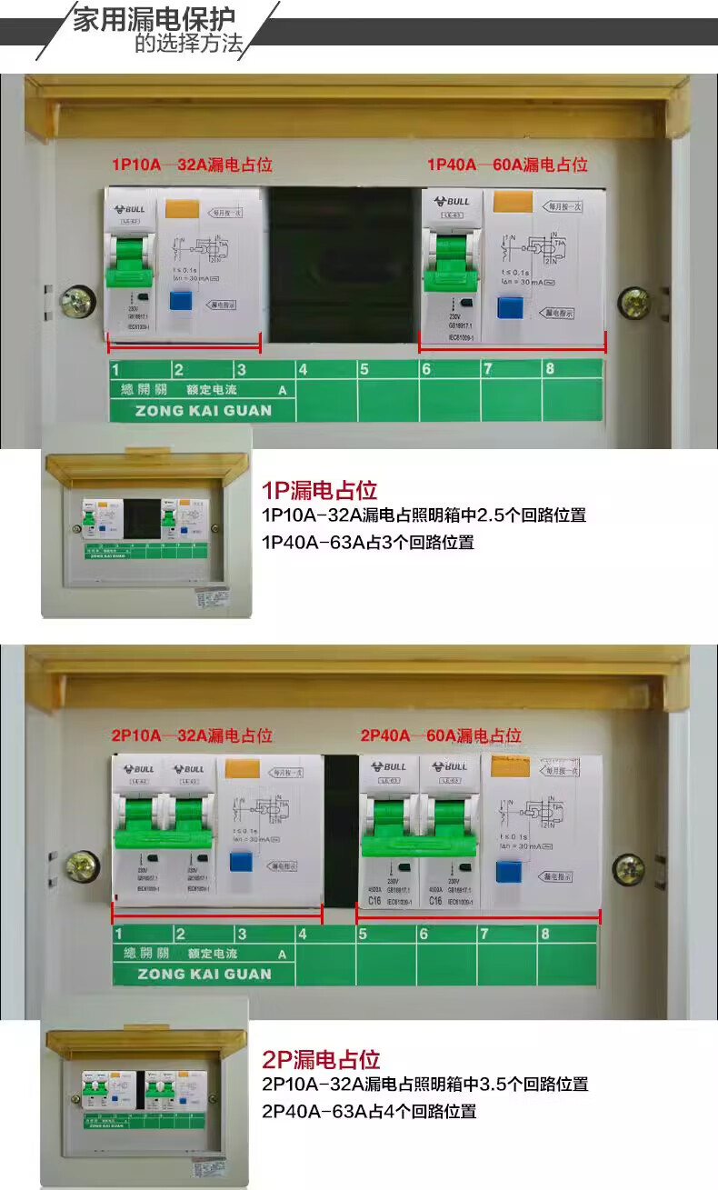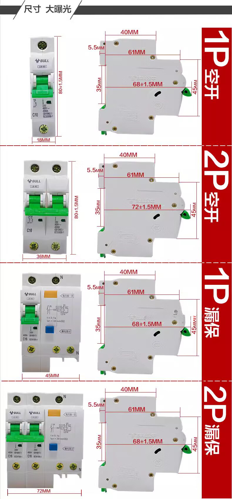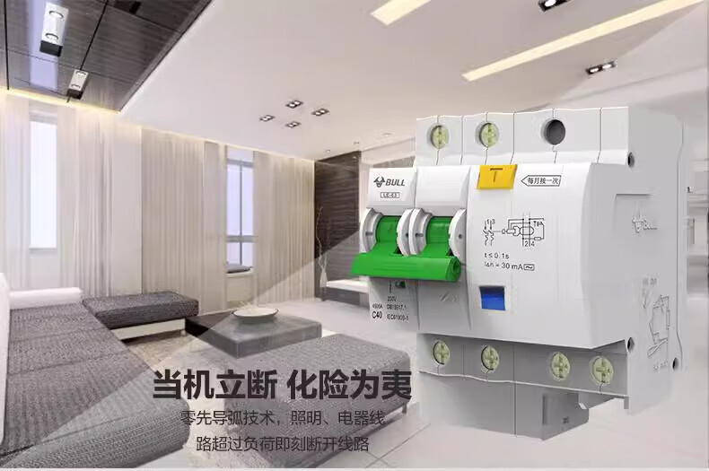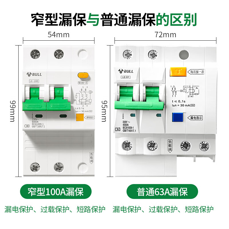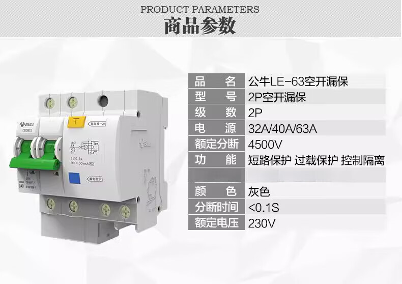 Bull leakage circuit breaker household electric switch air conditioner leakage protection air conditioner overload air switch with leakage protector 2P 63A