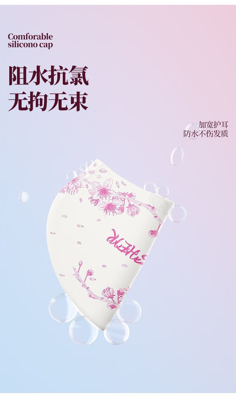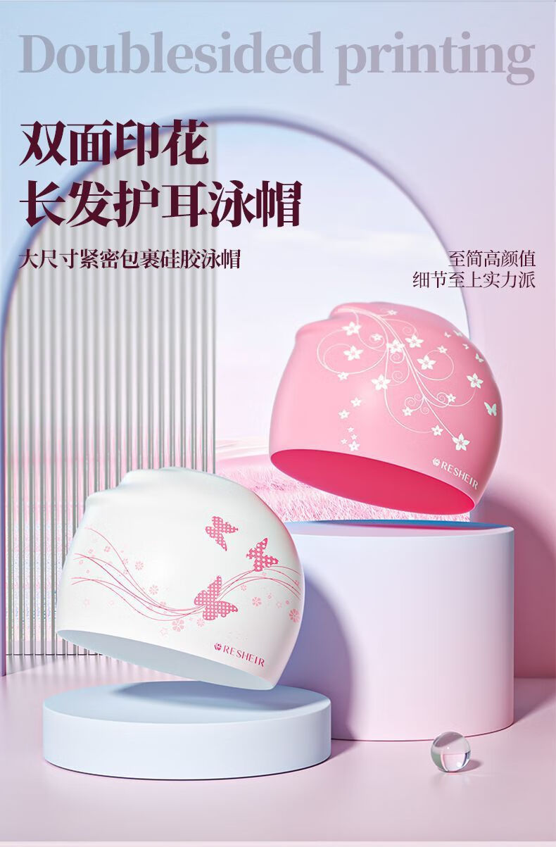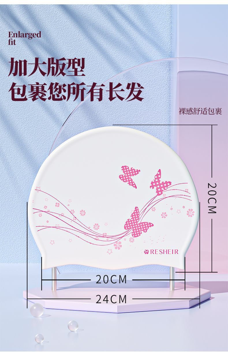 天启世纪泳帽女防水不勒头舒适长发护耳加大时尚新款印花游泳泳镜套装 白粉-蝴蝶飞-长发专用-泳帽+黑透