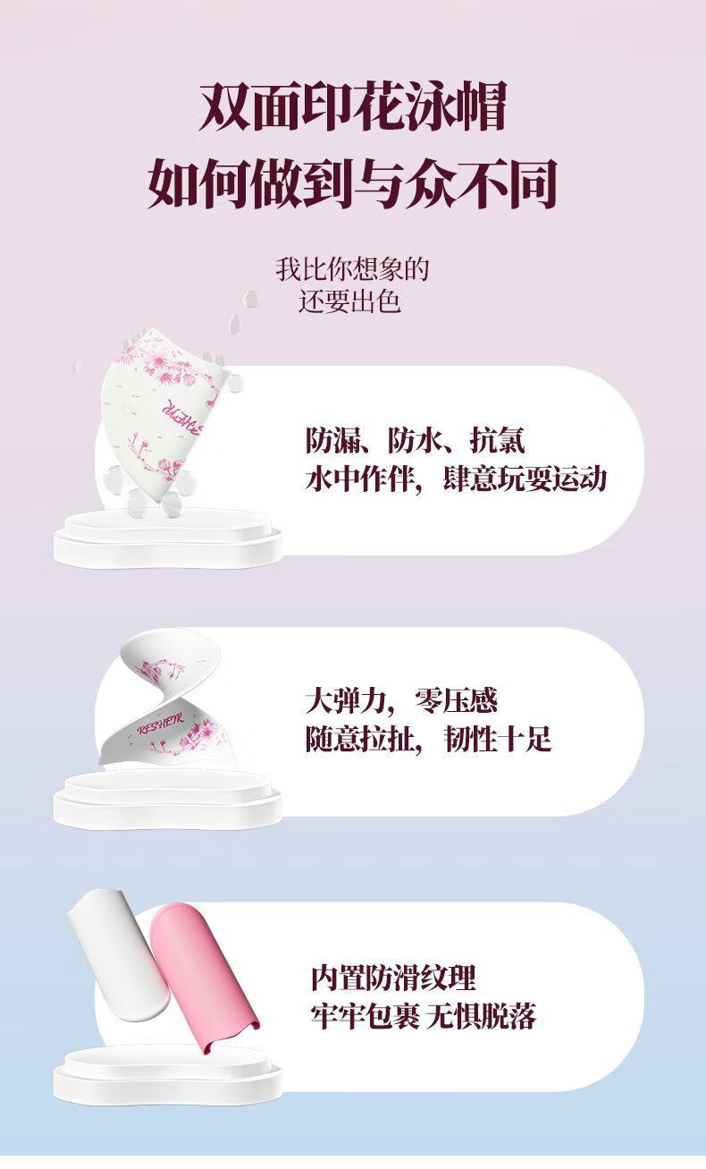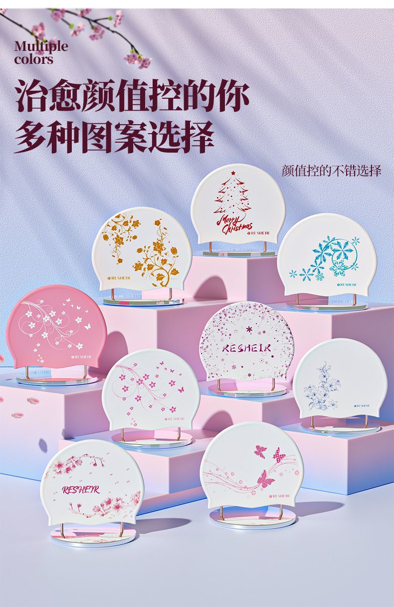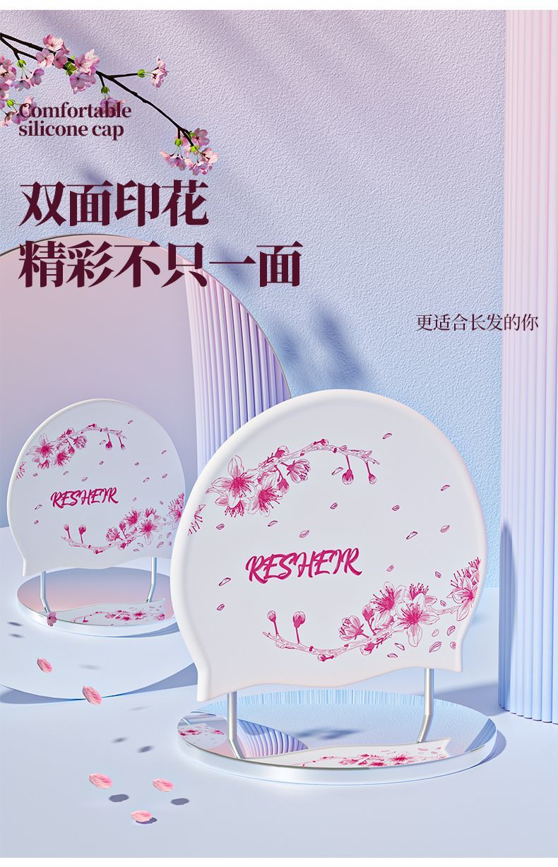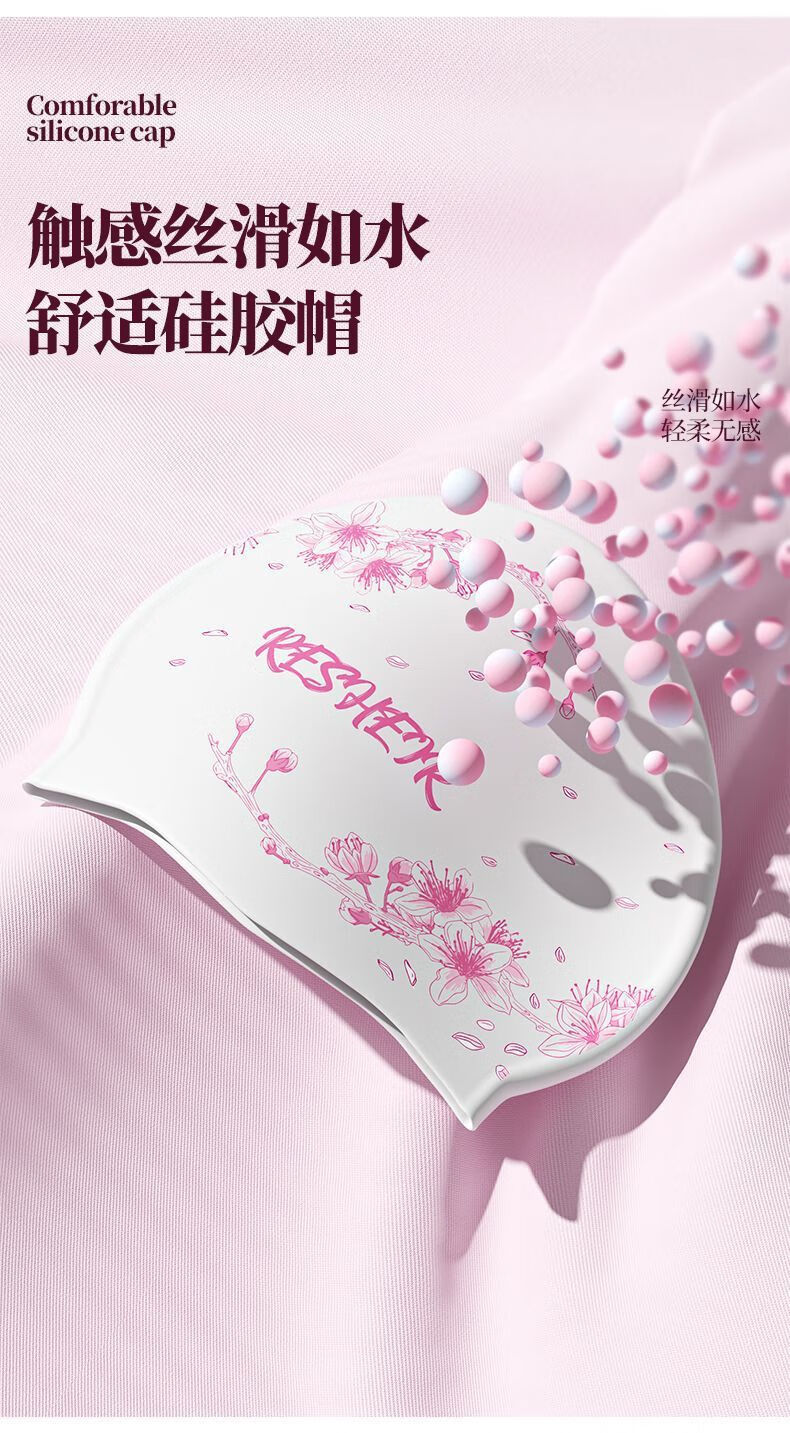 天启世纪泳帽女防水不勒头舒适长发护耳加大时尚新款印花游泳泳镜套装 白粉-蝴蝶飞-长发专用-泳帽+黑透
