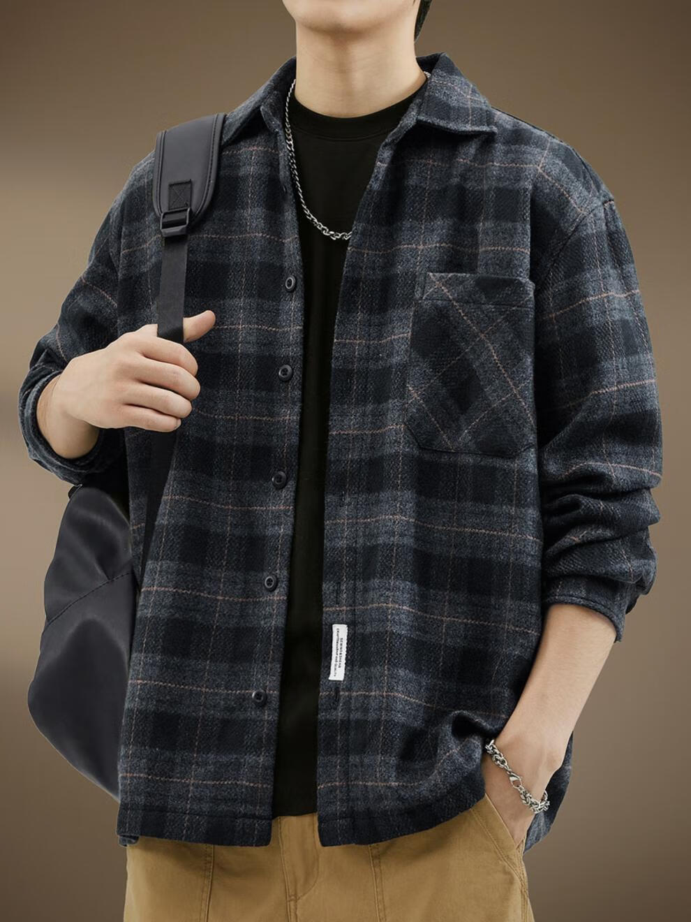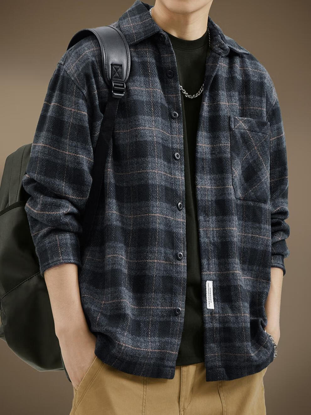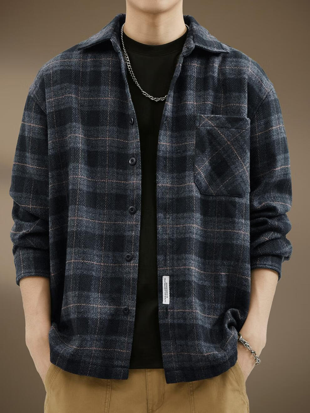 Yazhen high-end Japanese retro brushed plaid long-sleeved shirt men's spring and autumn casual loose heavyweight work shirt outer coffee color XL