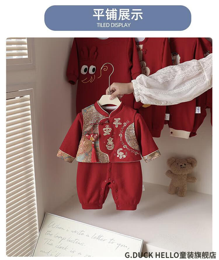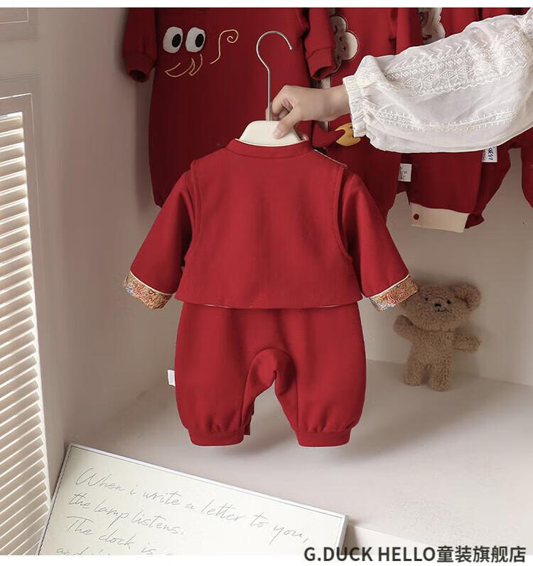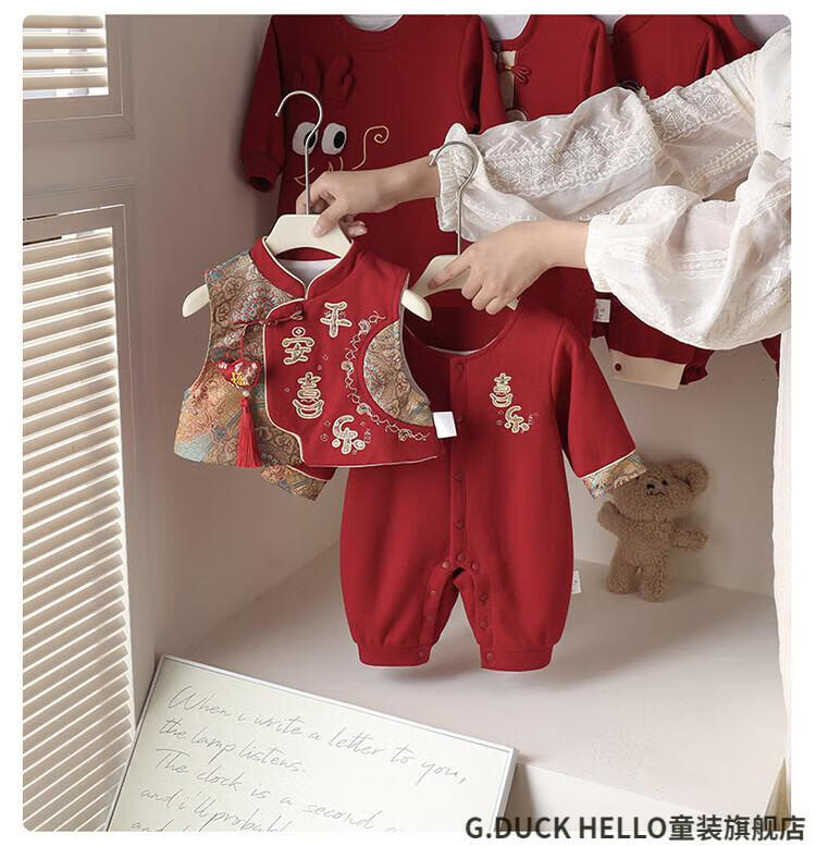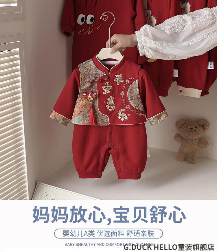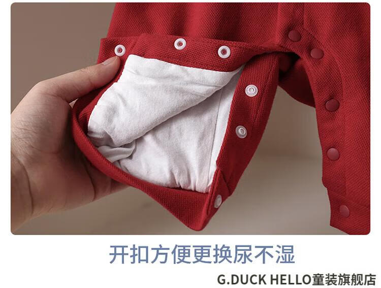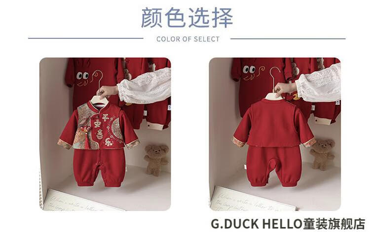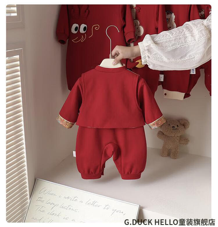 G.DUCKKIDS小黄鸭婴儿连体衣春秋中国风新生儿衣服满月百天男女宝宝周岁礼服 红色连体衣 66cm 66码0-3月建议宝宝4-6公斤
