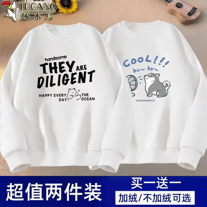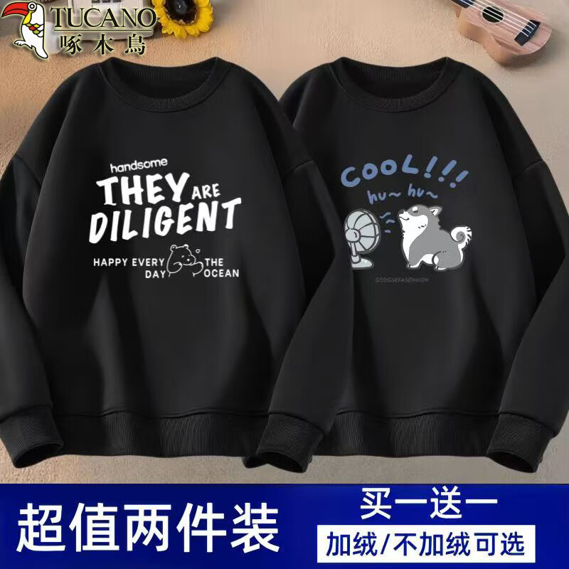 啄木鸟【2件装】卫衣男秋冬季宽松圆领打底衫青少年潮牌长袖T恤男装上衣 风扇狗白色+THE黑色 常规 XL