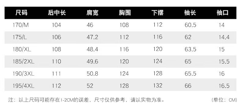 China (cm) 165 / 88-90 170 / 96-98 175 / 108-110 180 / 118-122 185 / 126-130
