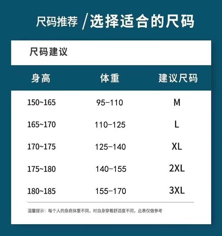 China (cm) 165 / 88-90 170 / 96-98 175 / 108-110 180 / 118-122 185 / 126-130