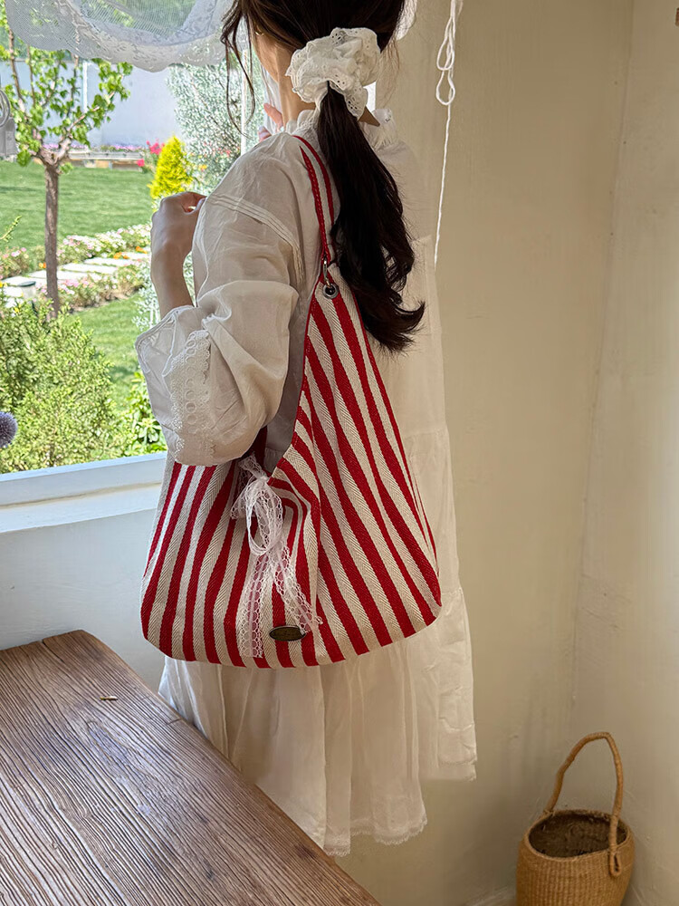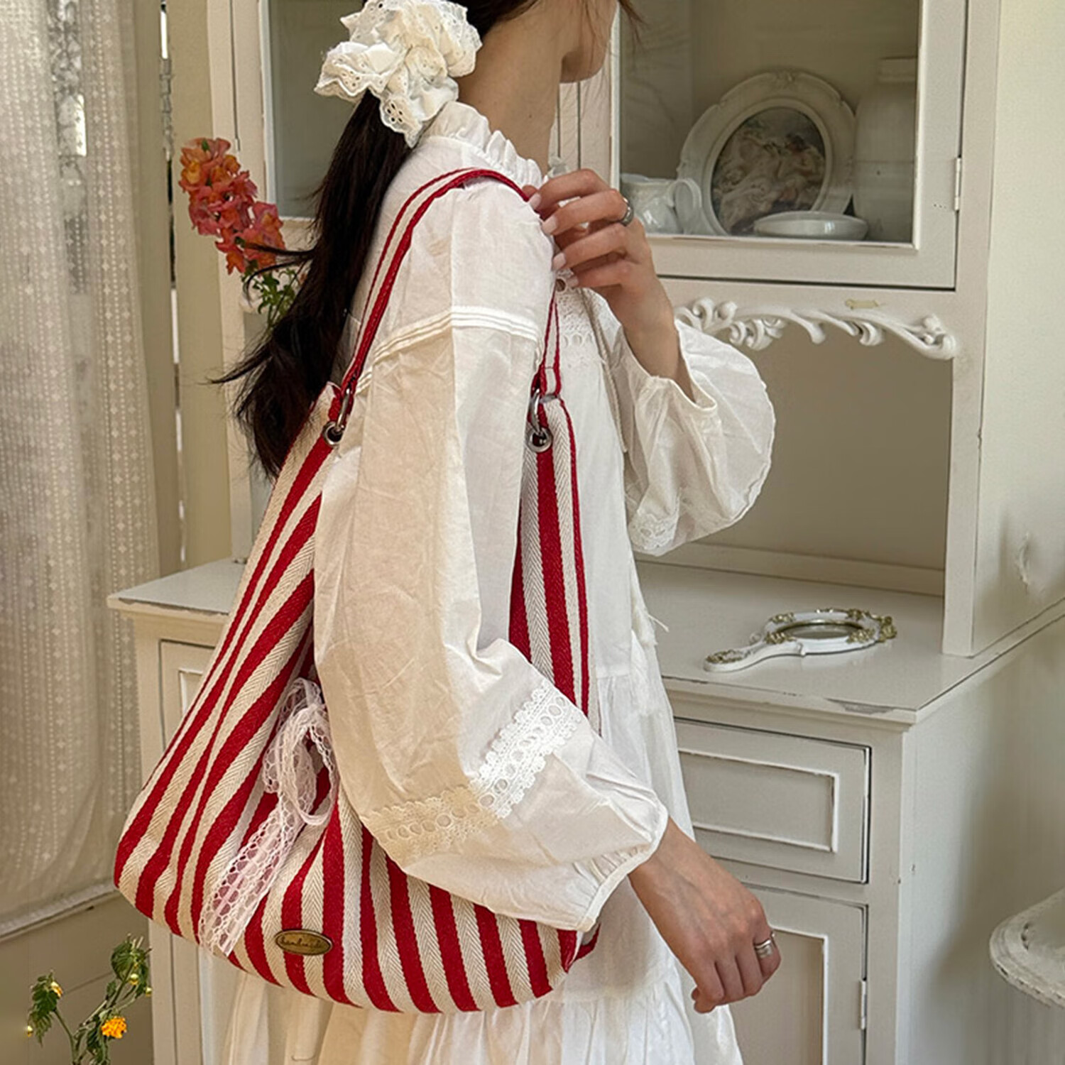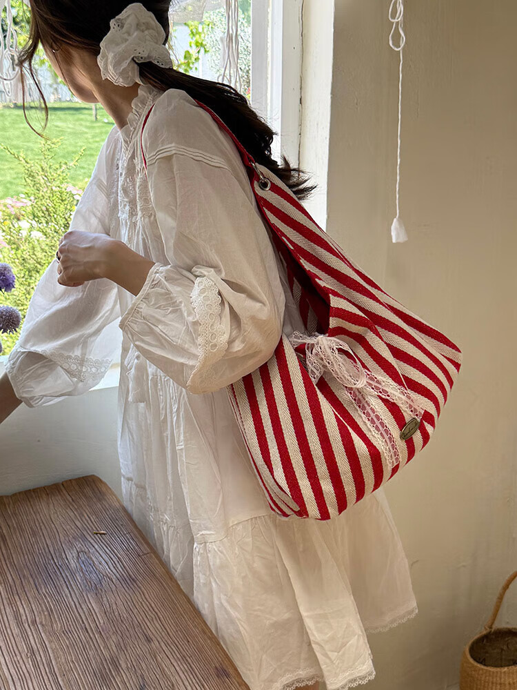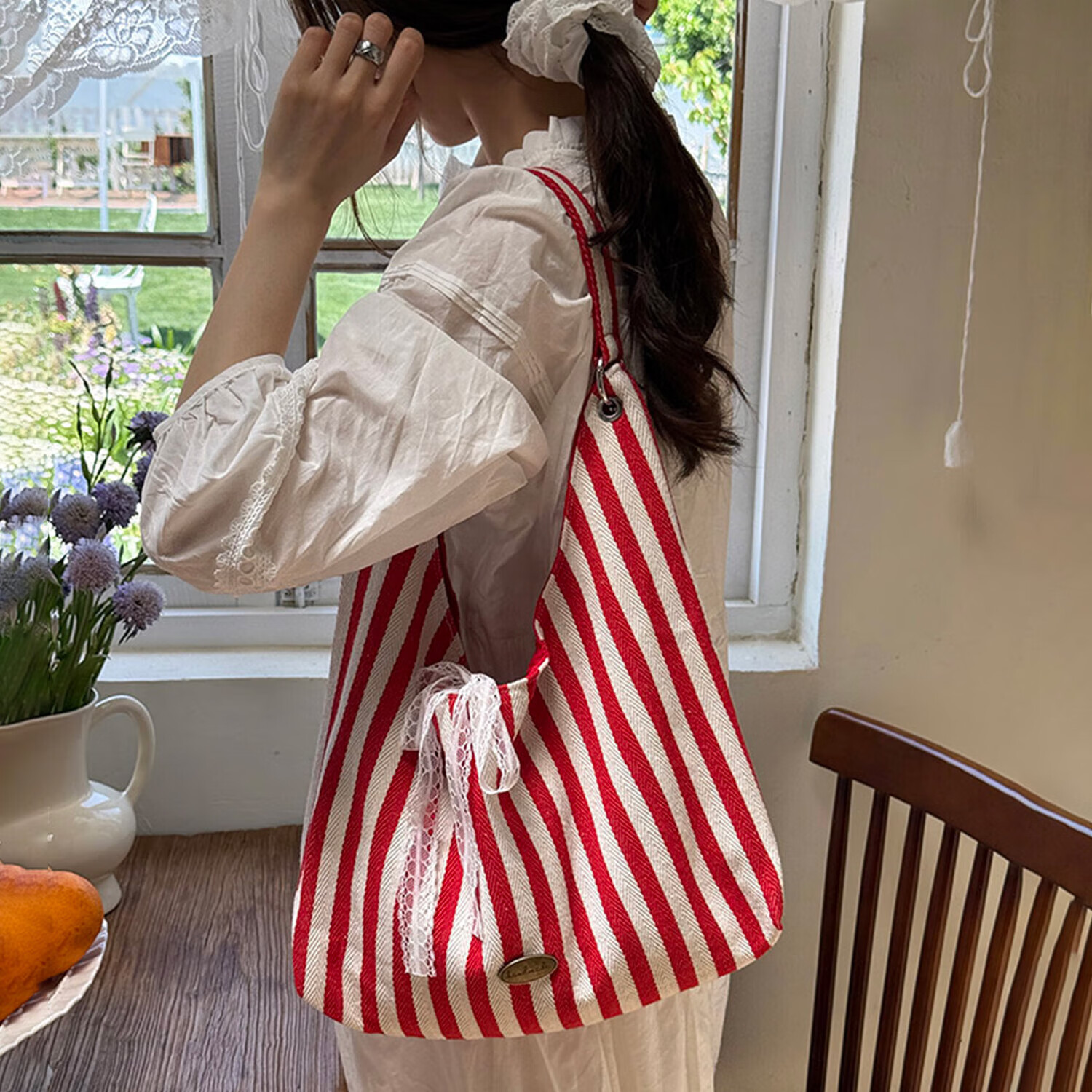 卡汐沐 条纹帆布包包女通勤斜挎包女韩国字母印花双面单肩包学生上课包 双面帆布包【红色条纹】