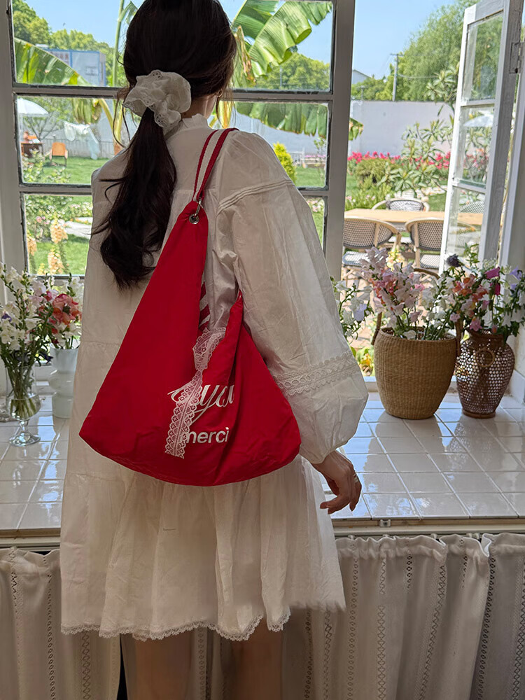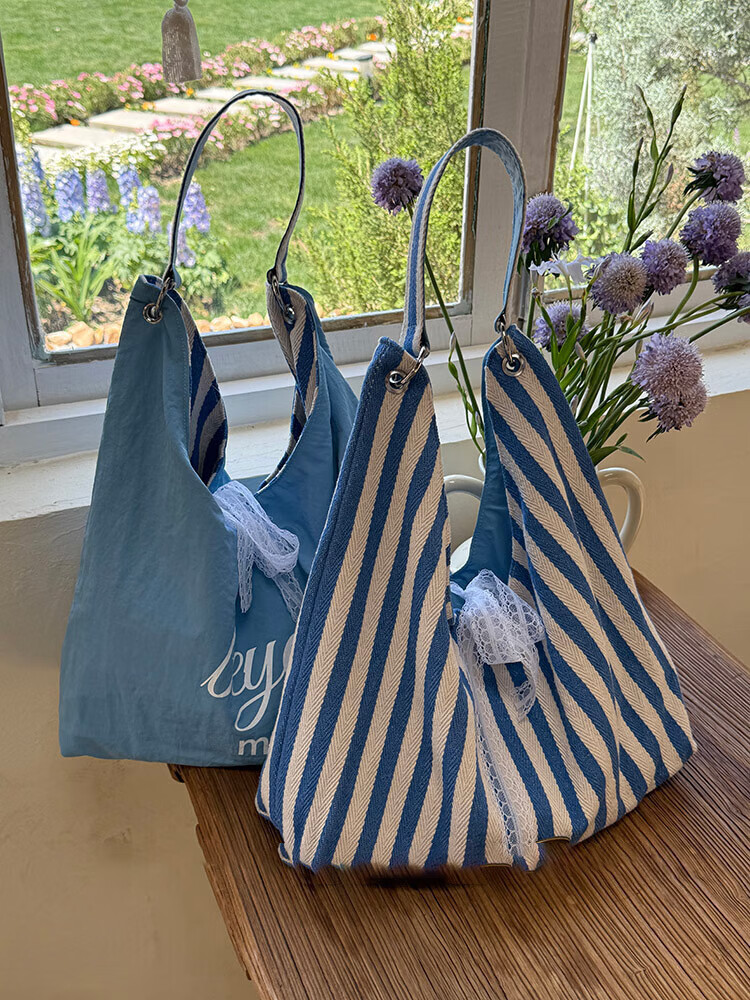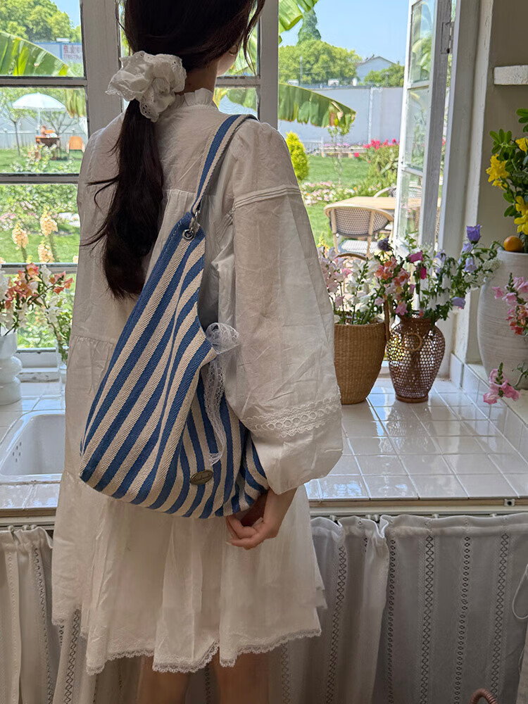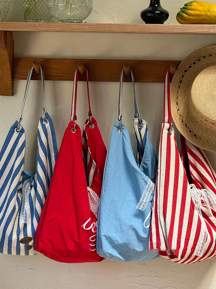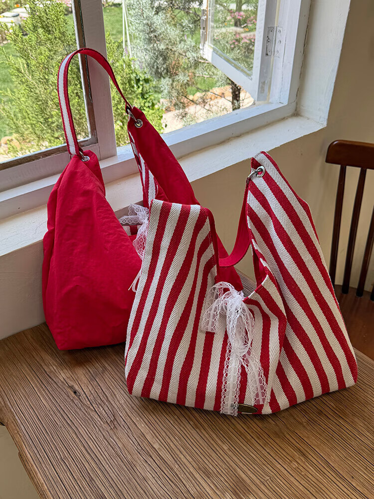 卡汐沐 条纹帆布包包女通勤斜挎包女韩国字母印花双面单肩包学生上课包 双面帆布包【红色条纹】