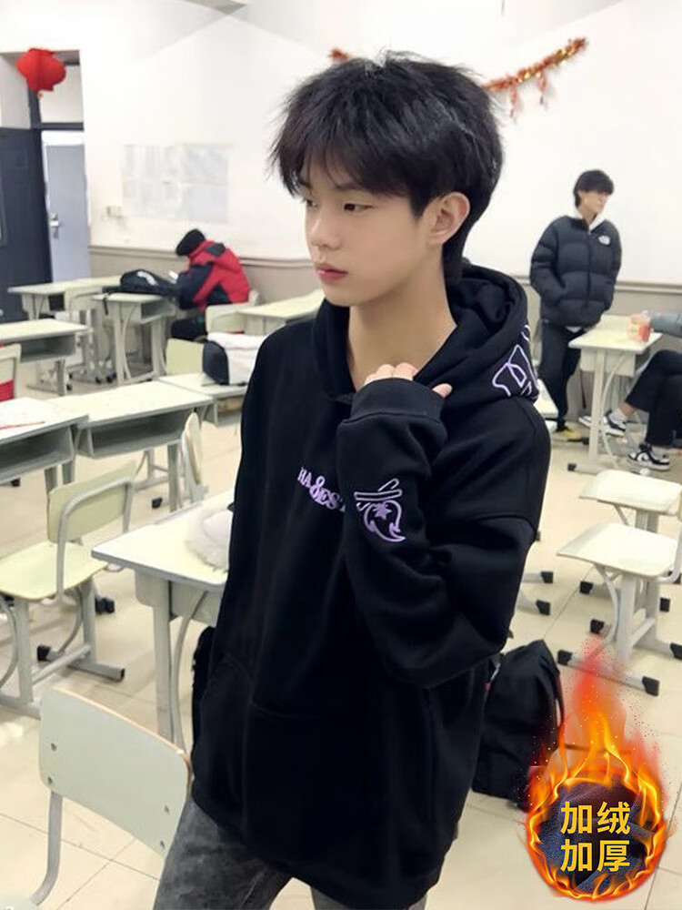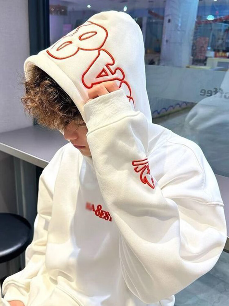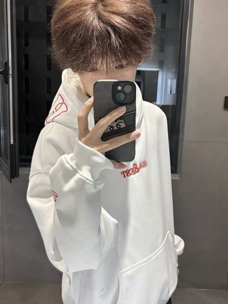 趣米乐美式高街硬挺连帽卫衣男秋冬季宽松潮流重磅慵懒上衣情侣外套帽衫 白色-加绒 L 【建议100-120斤】