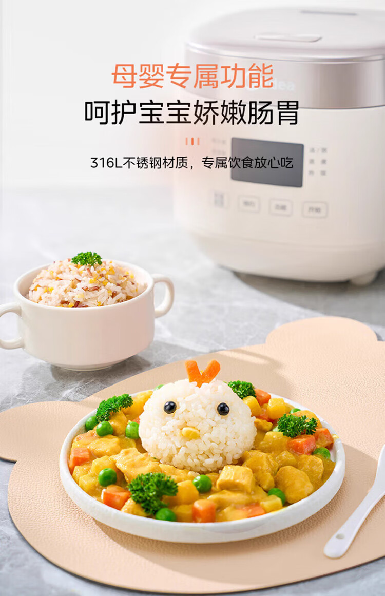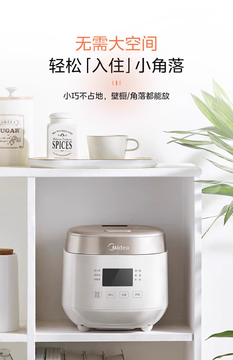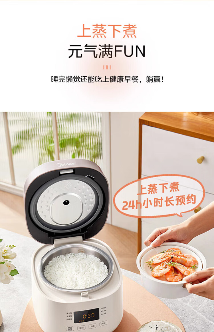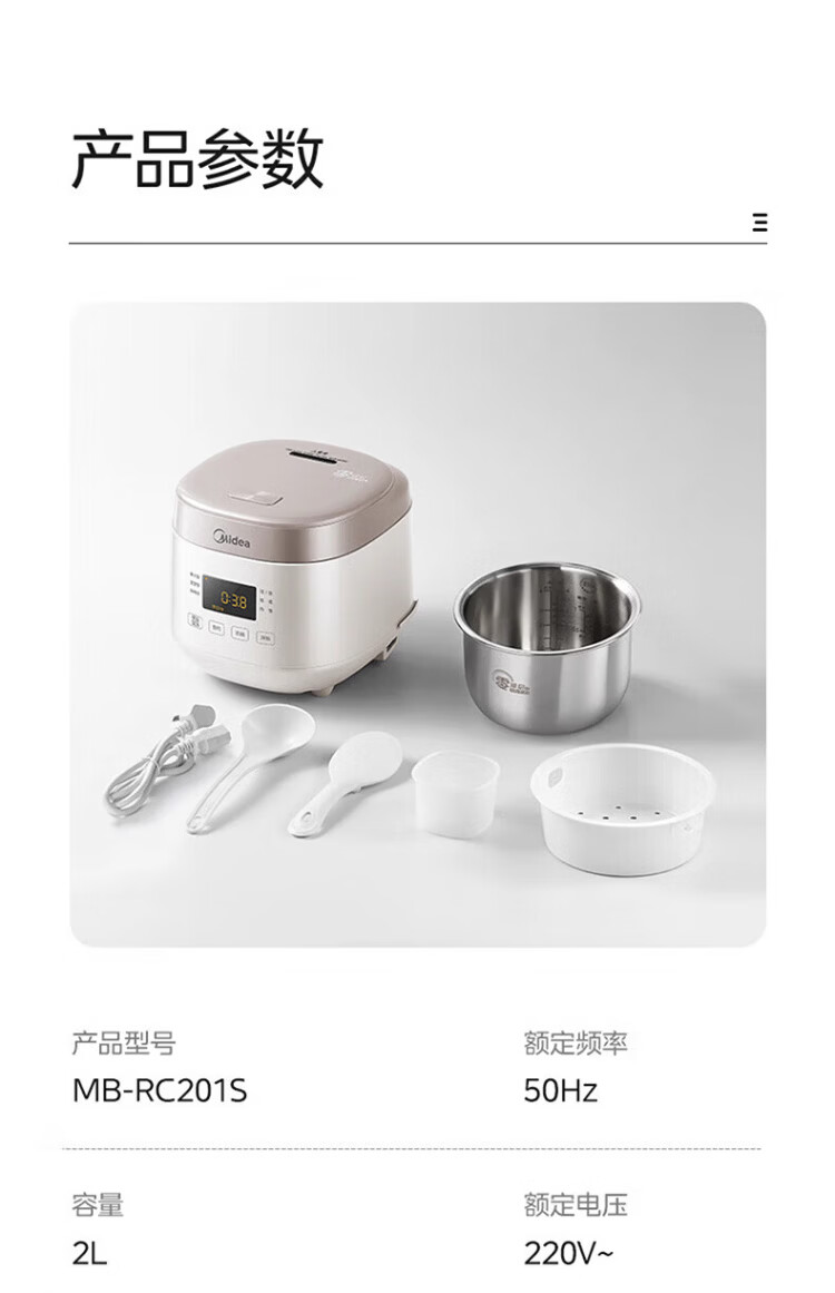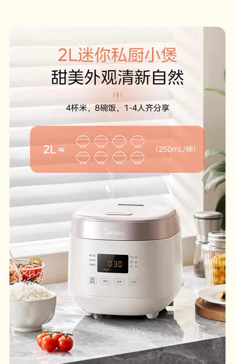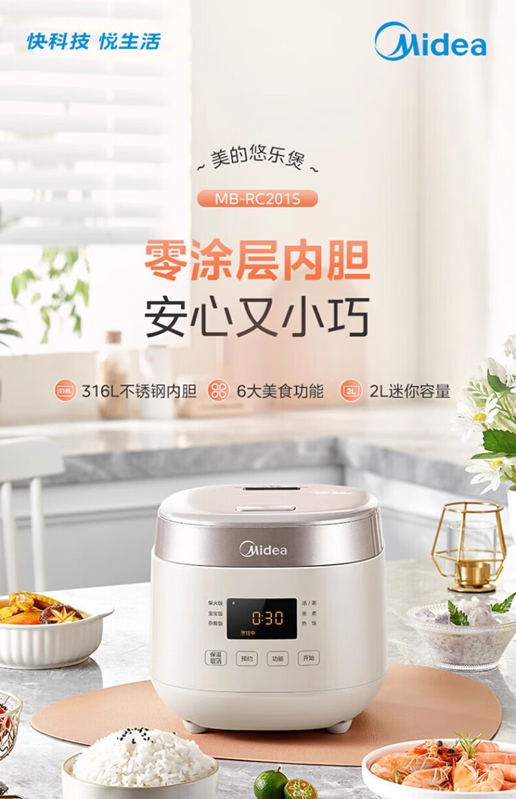 美的(Midea)电饭煲 无涂层家用小型1-2-3人智能电饭锅蒸煮炖一体多功能小电锅 RC201S【0涂层】更健康 2L