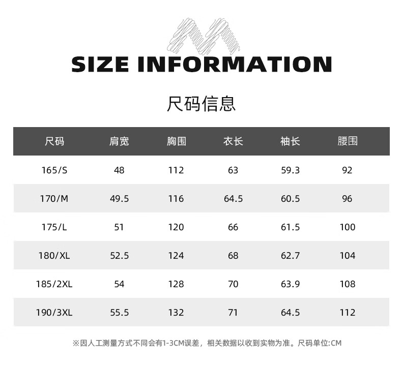 China (cm) 165 / 88-90 170 / 96-98 175 / 108-110 180 / 118-122 185 / 126-130
