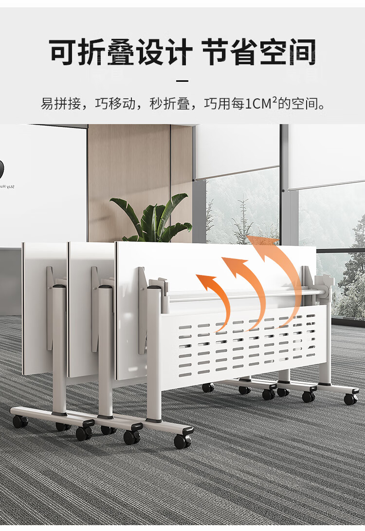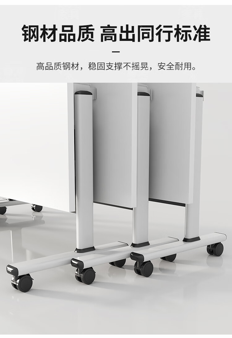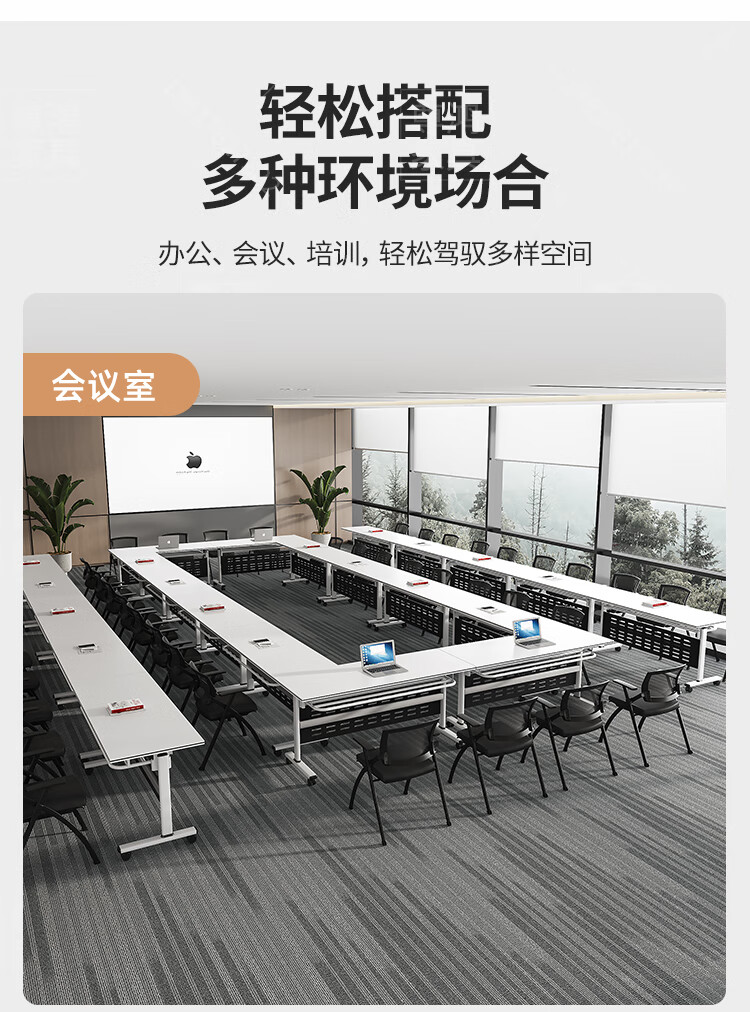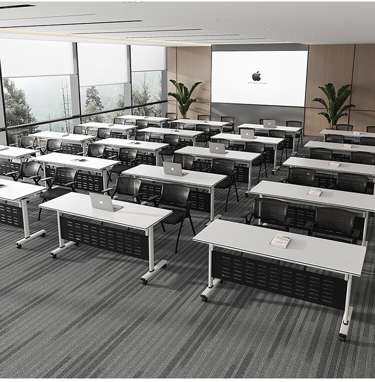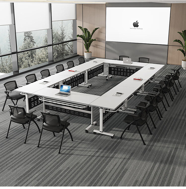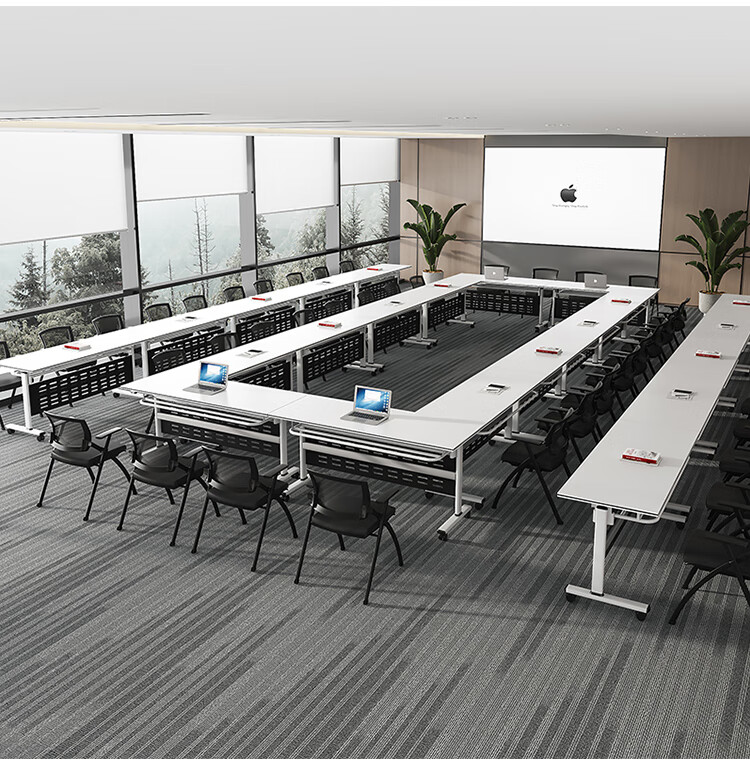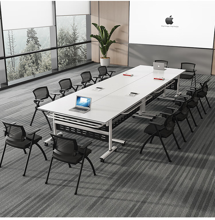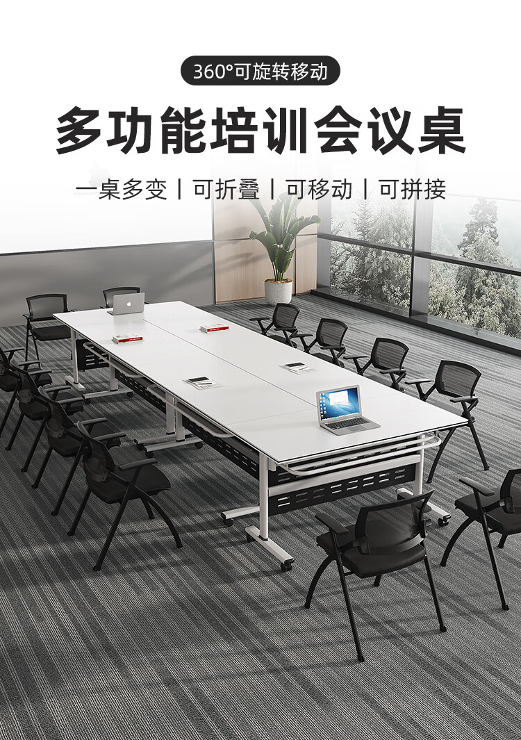 Folding conference table and chairs, removable splicing long table with wheels, multi-functional office desk, training desk and chair combination, length 1200*width 400*height 750-white, self-installation