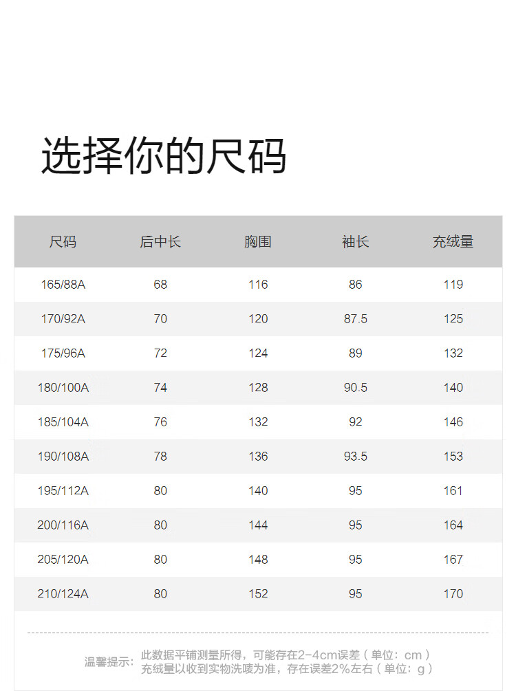 China (cm) 165 / 88-90 170 / 96-98 175 / 108-110 180 / 118-122 185 / 126-130