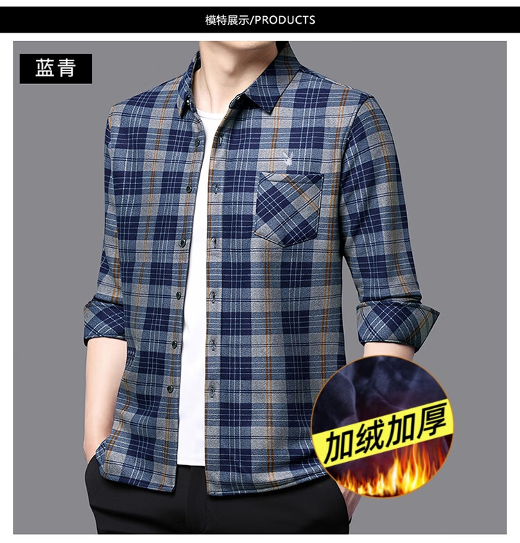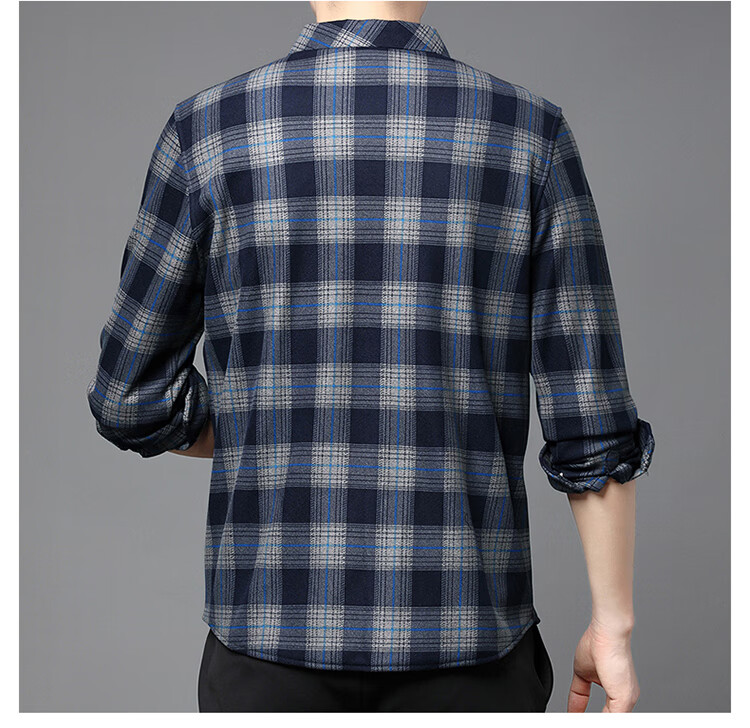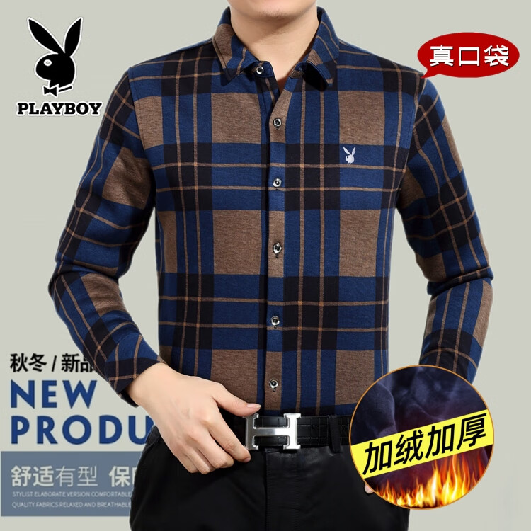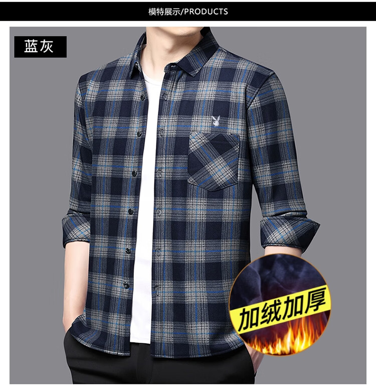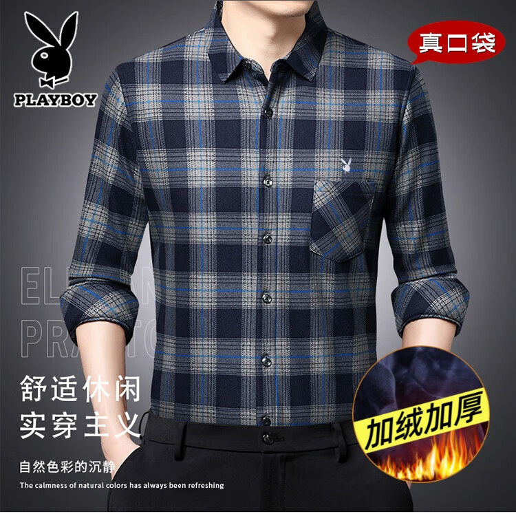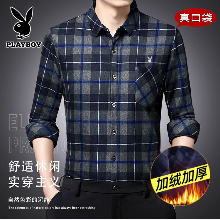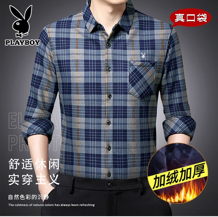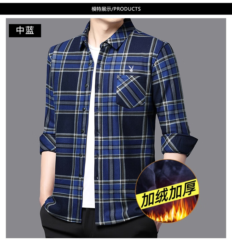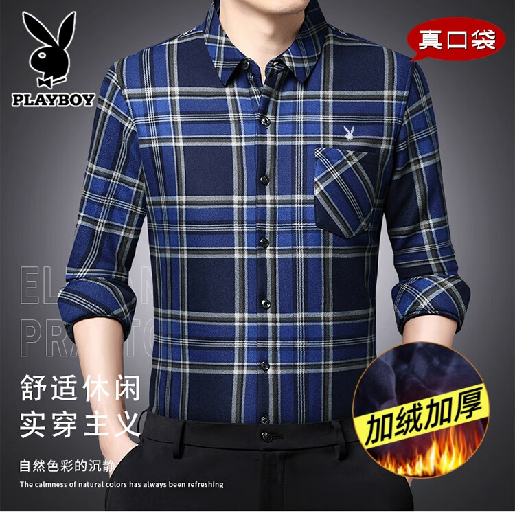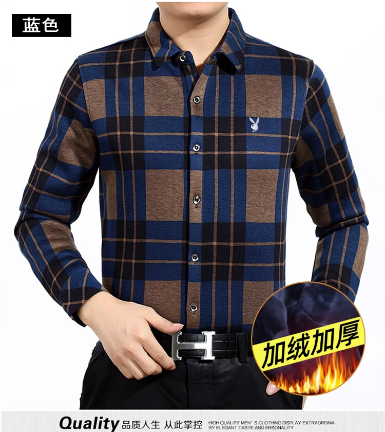花花公子中年男士保暖衬衫加绒加厚格子长袖纯棉大码爸爸冬装衬衣 蓝色 XL 175【建议130-148斤】