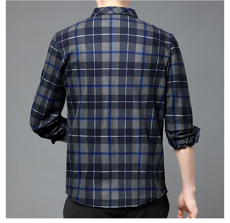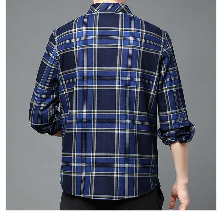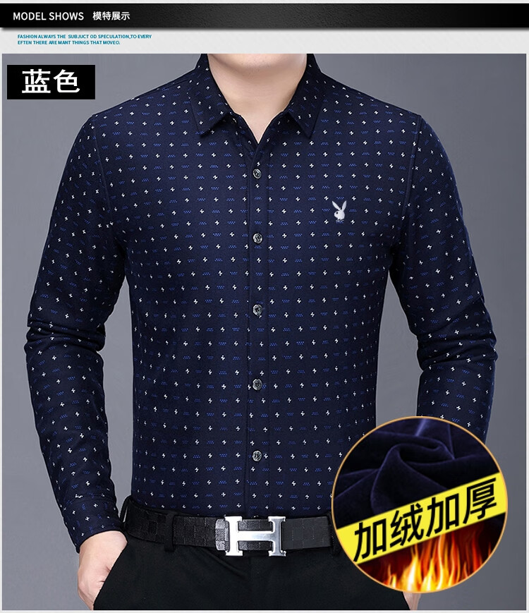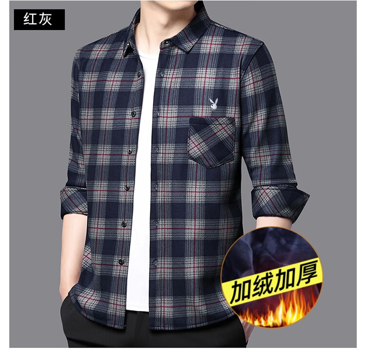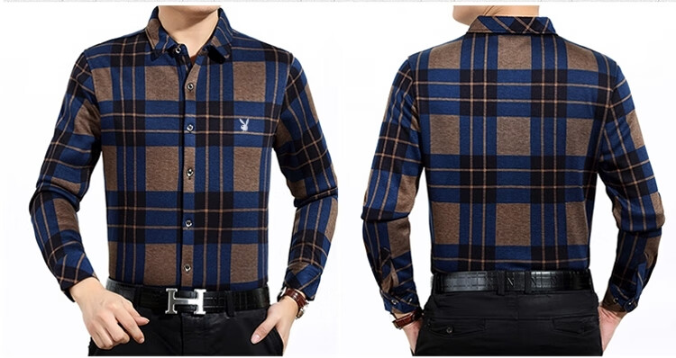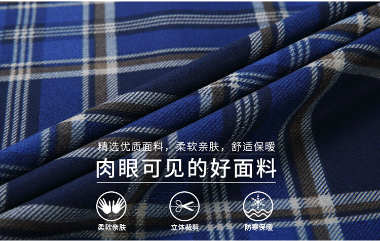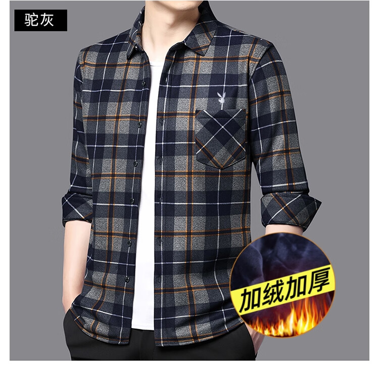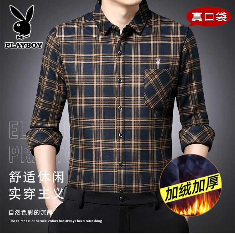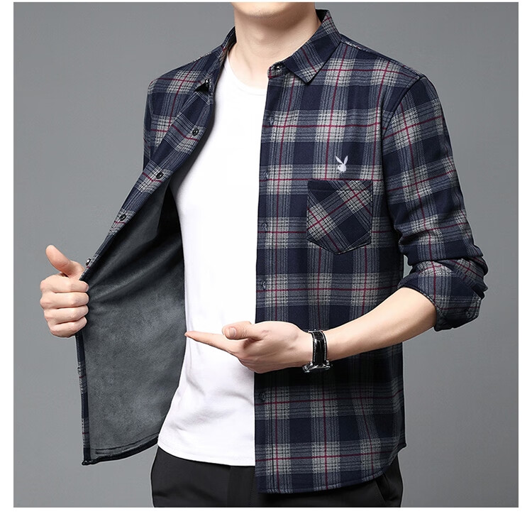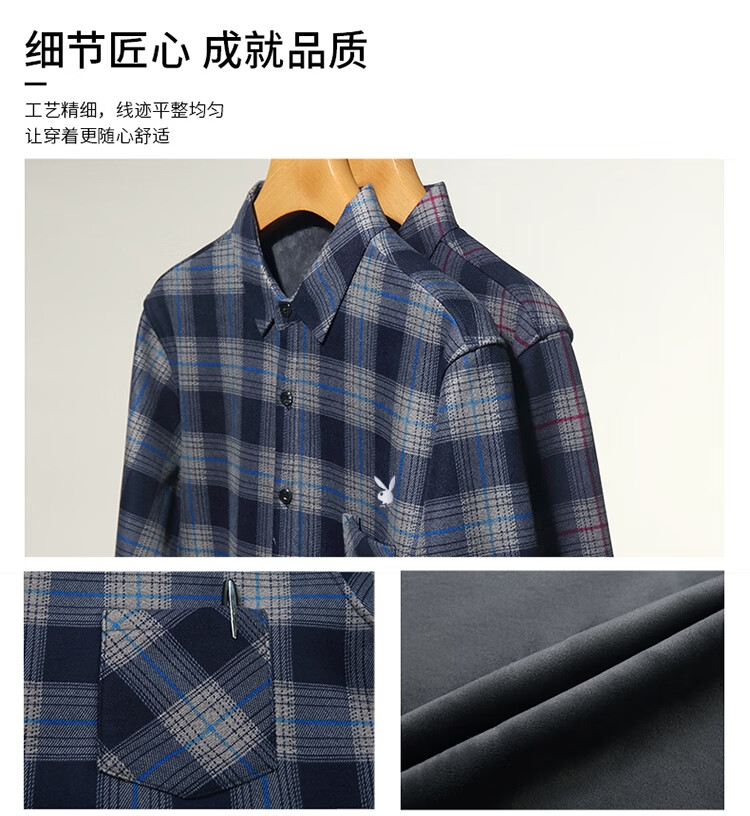 花花公子中年男士保暖衬衫加绒加厚格子长袖纯棉大码爸爸冬装衬衣 蓝色 XL 175【建议130-148斤】