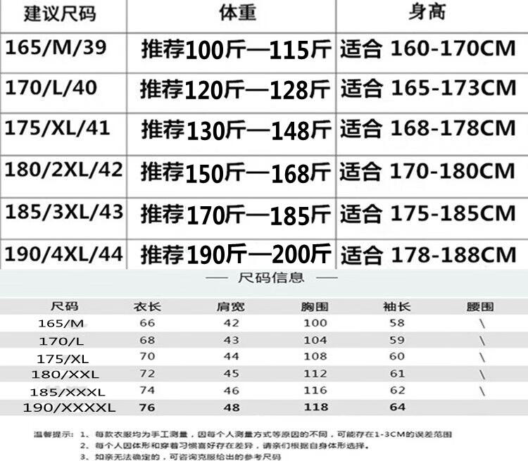 China (cm) 165 / 88-90 170 / 96-98 175 / 108-110 180 / 118-122 185 / 126-130