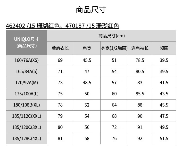 China (cm) 160-165/84-86 165-170 / 88-90 167-172 / 92-96 168-173 / 98-102 170-176 / 106-110