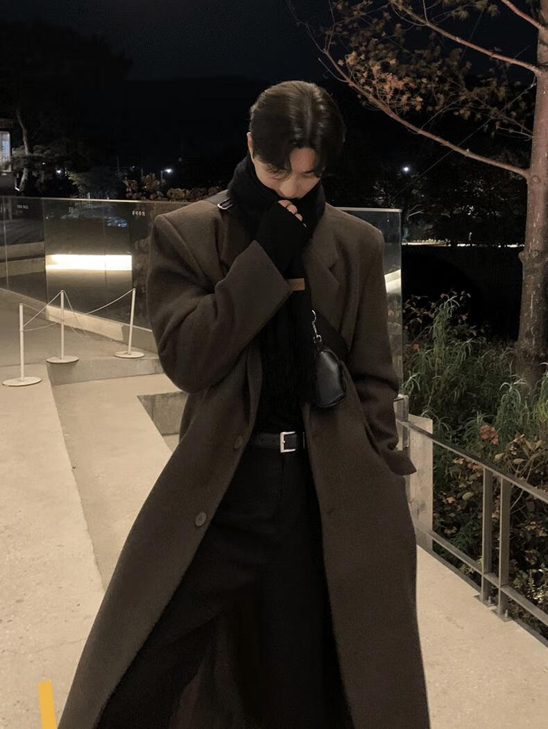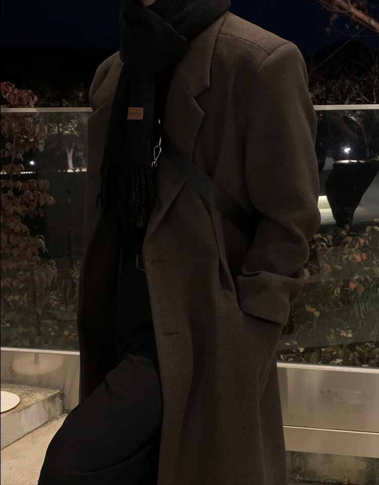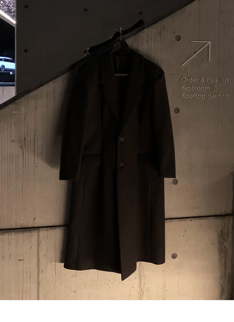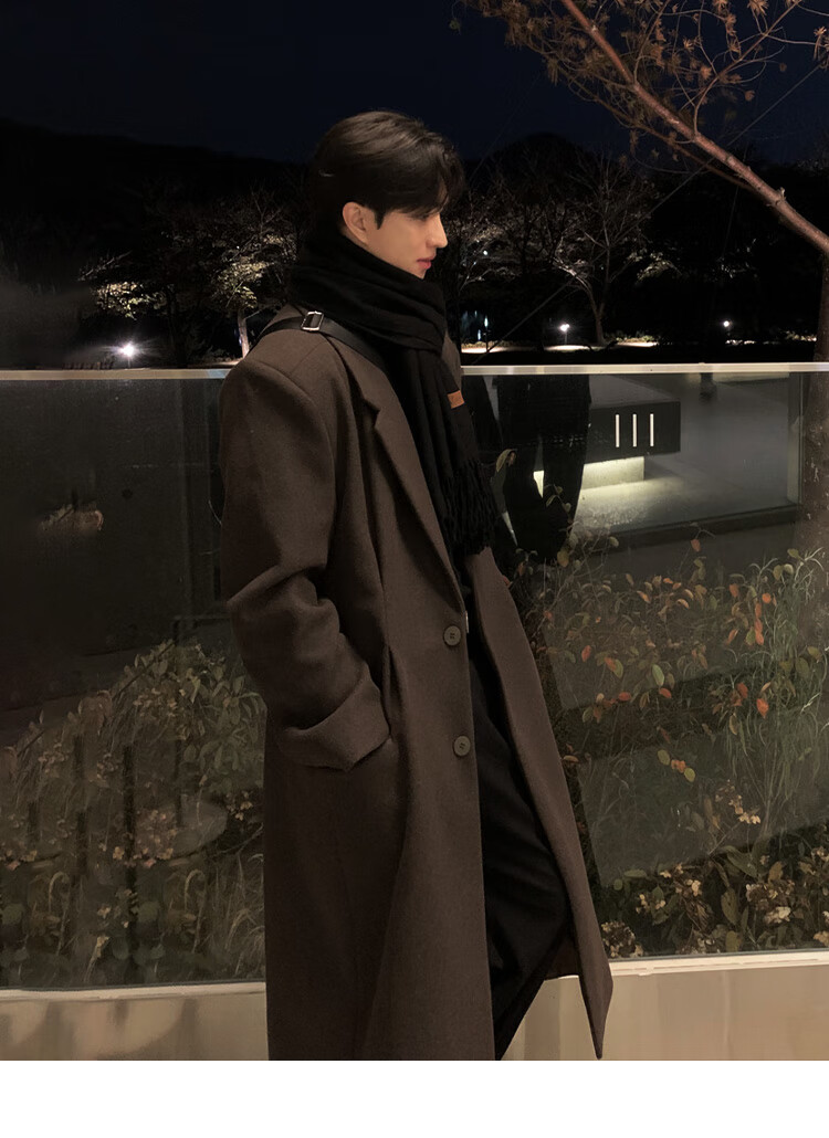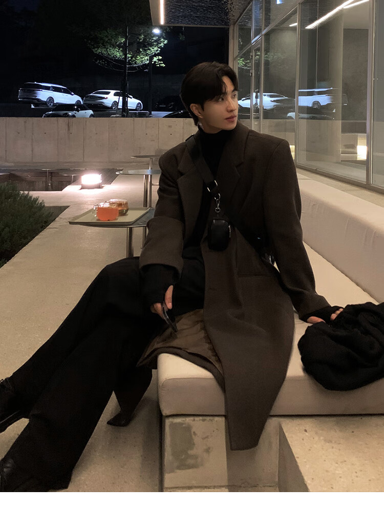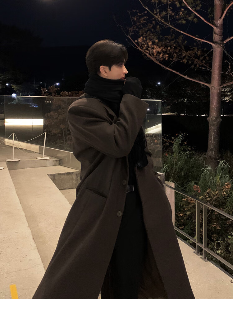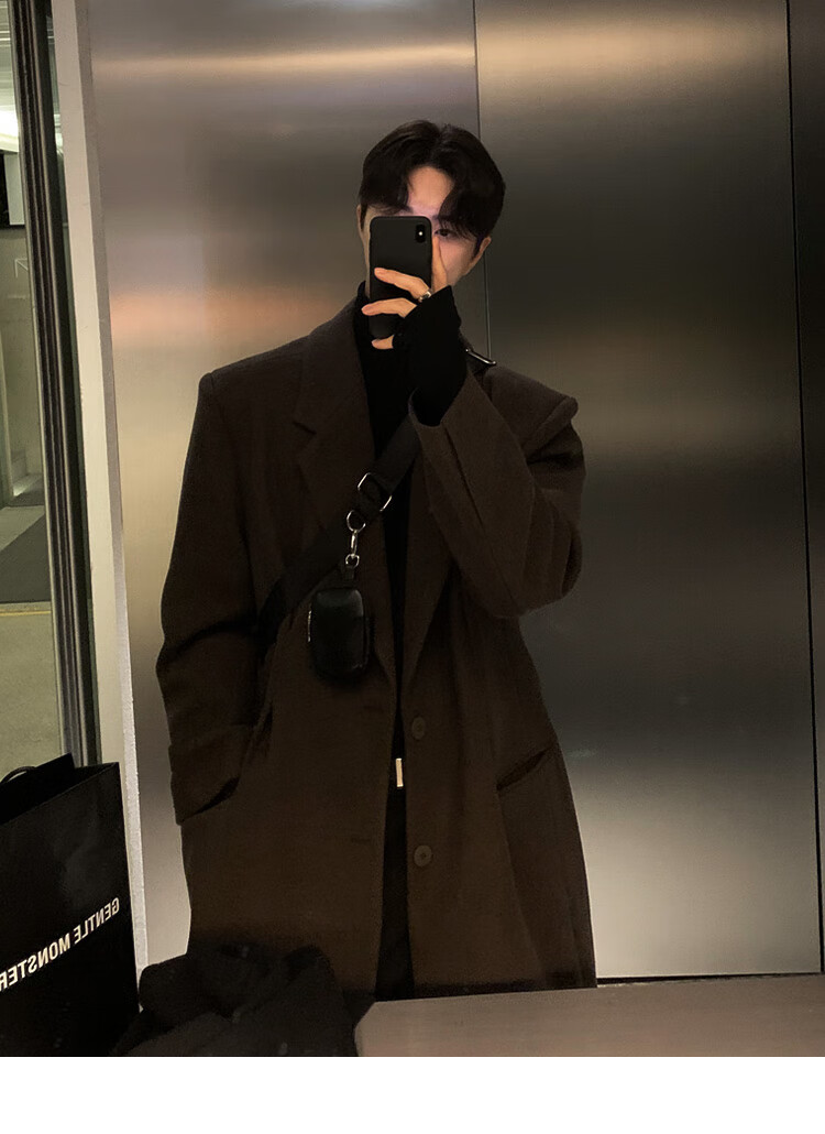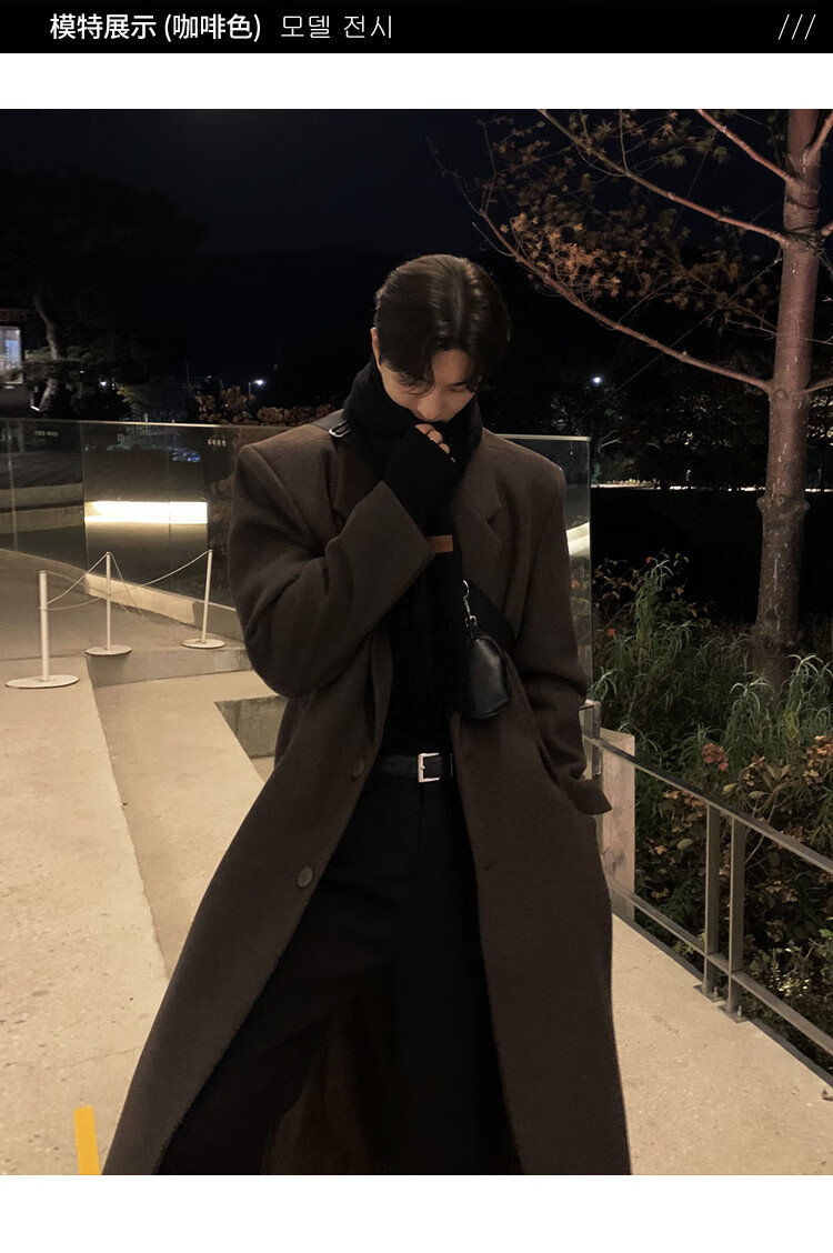 皮尔卡丹(pierre cardin)春秋韩版美拉德毛呢大衣男感中长款垫肩风衣过膝宽松呢子外套 咖啡色(加棉里衬) XL