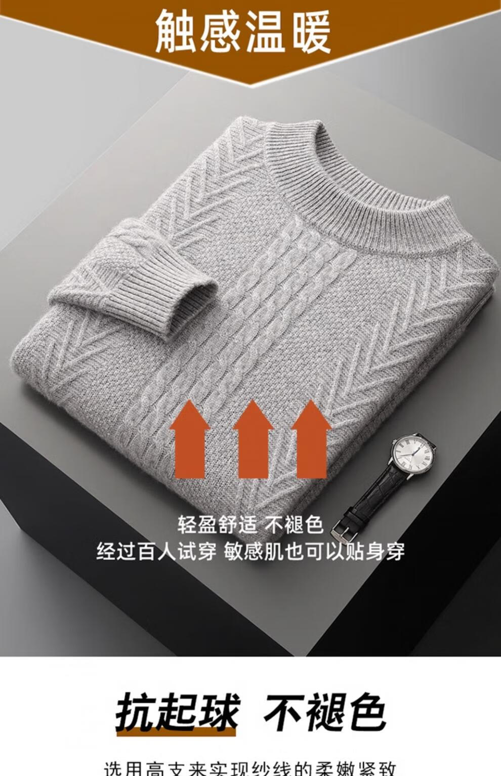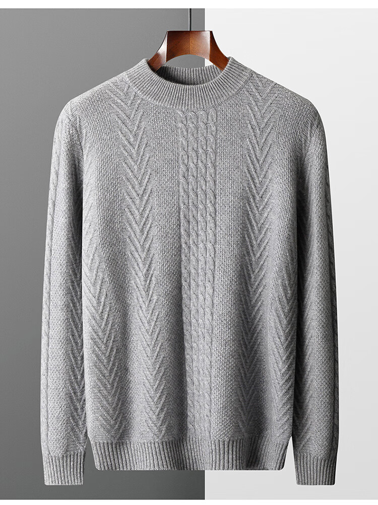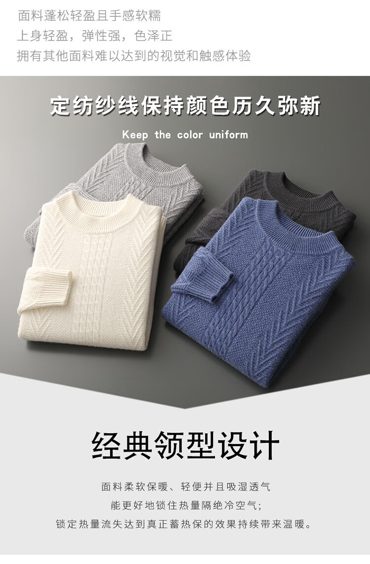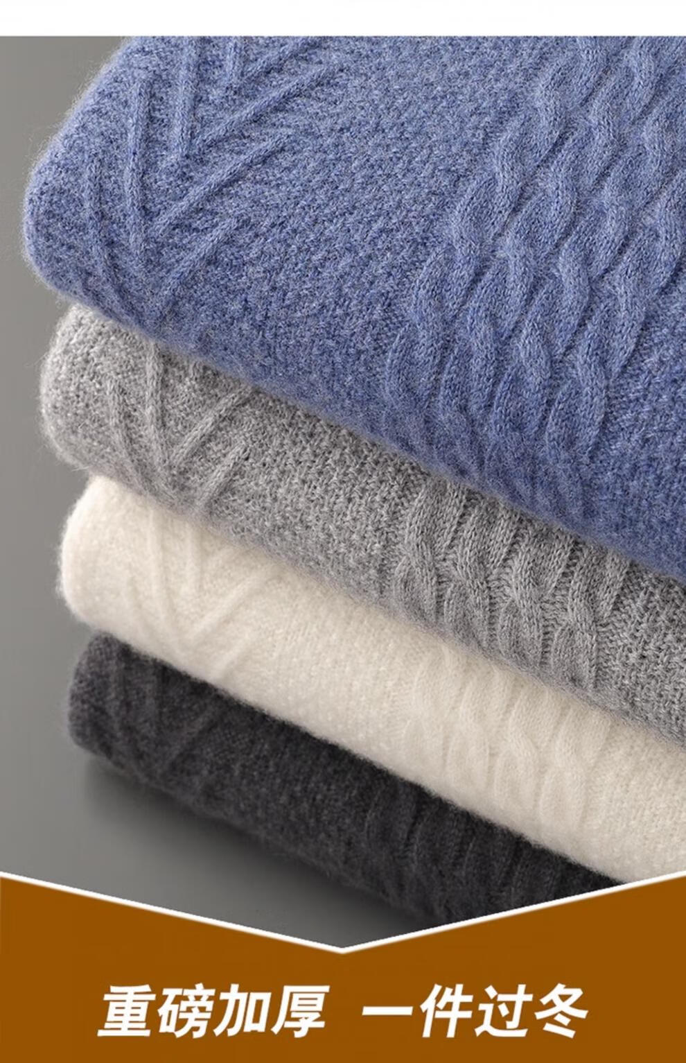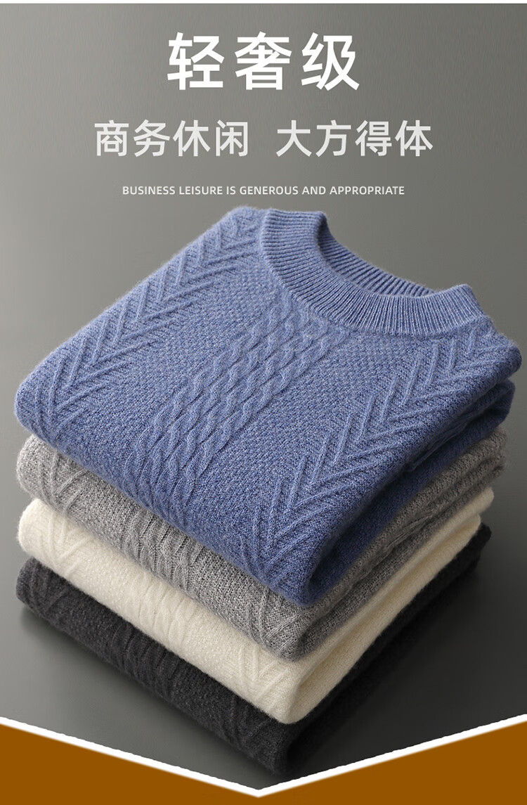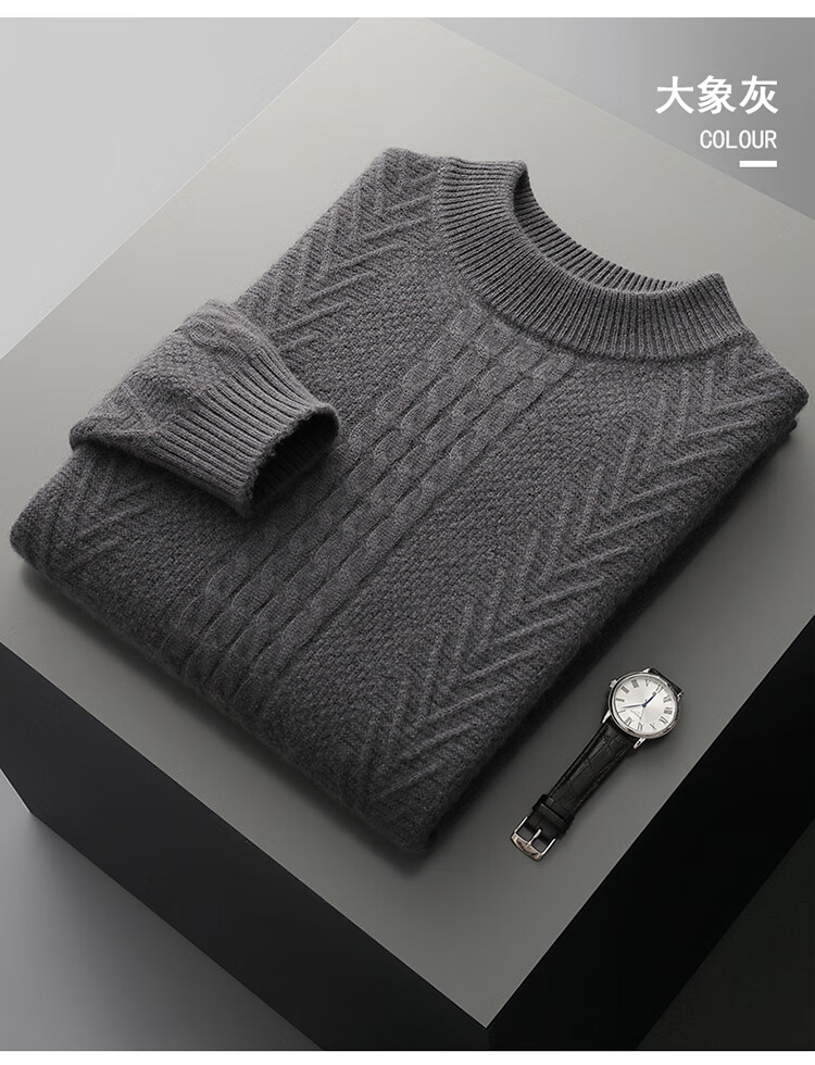 鄂尔多斯市产纯羊毛衫双股加厚男圆领针织毛衣商务休闲内搭扭花打 大象灰 XL
