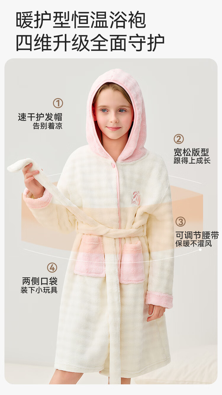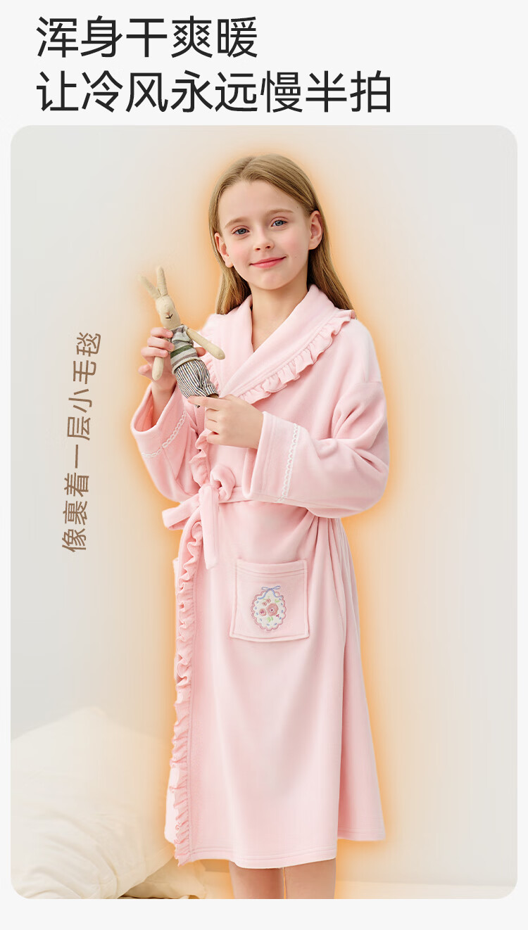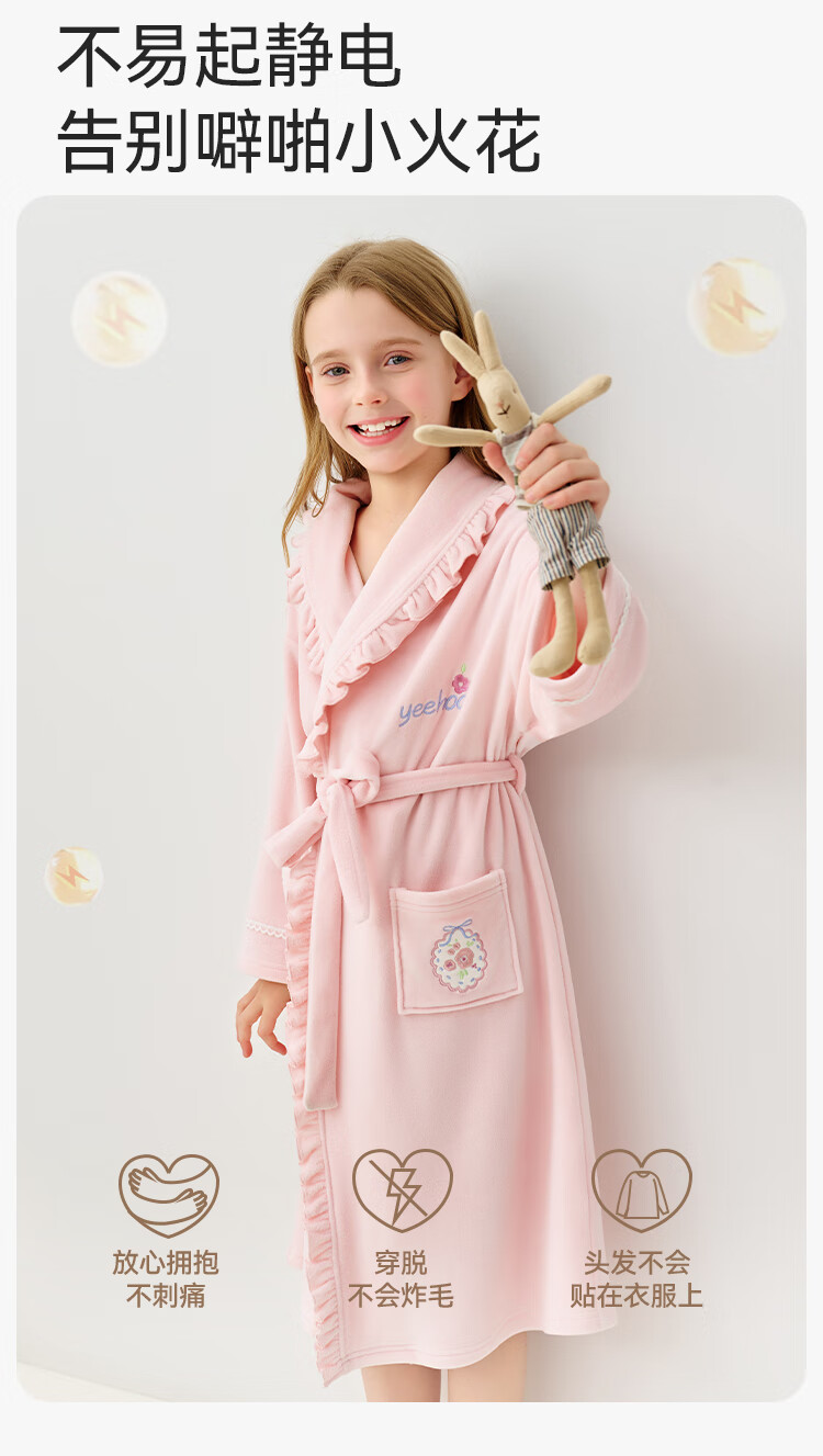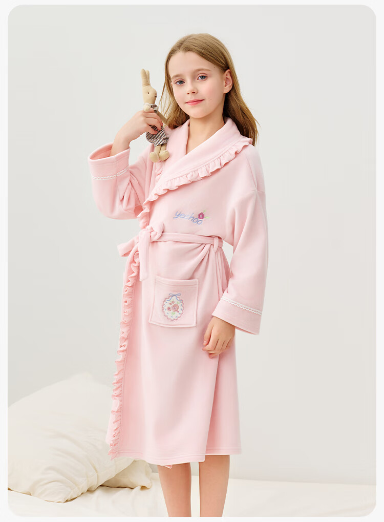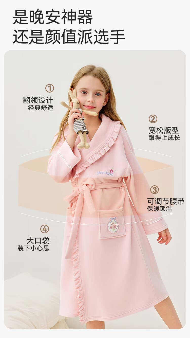 英氏(YEEHOO)儿童睡袍男女童秋冬聚热锁温【速干吸湿】不易掉毛连帽睡衣 马卡龙粉 【320g】 140