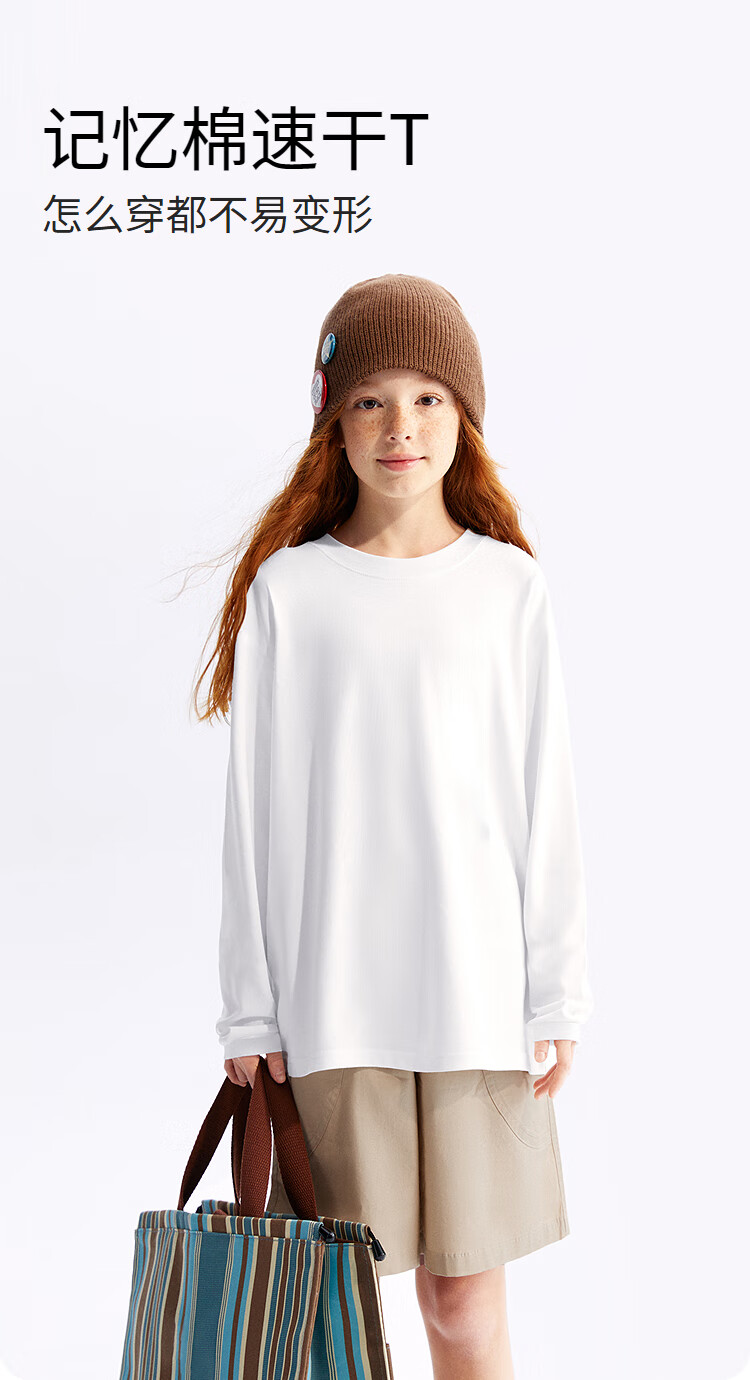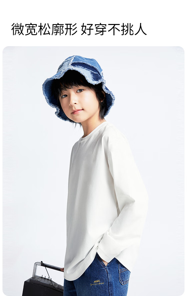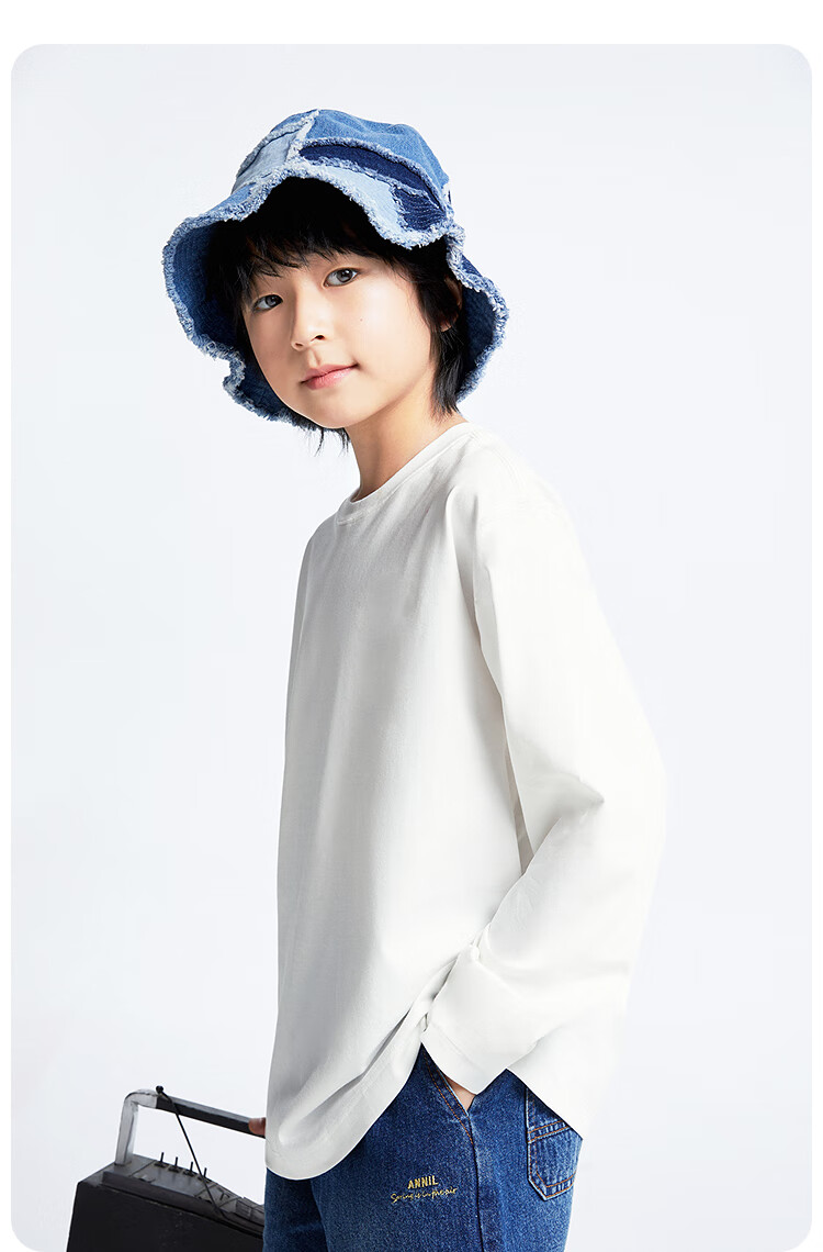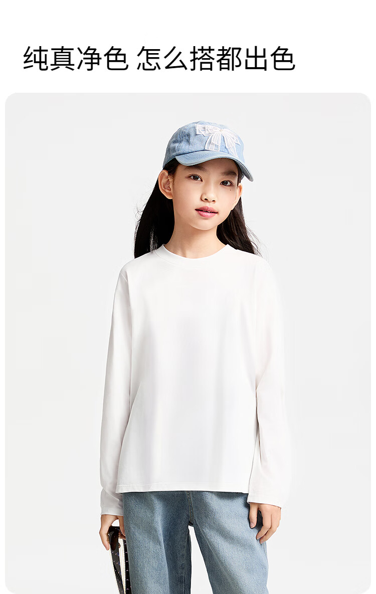 安奈儿速干小白T男女童长袖T恤针织衫2025新款宽松弹力抑菌亲子装 米白 110