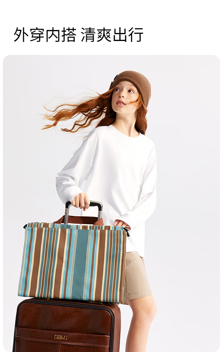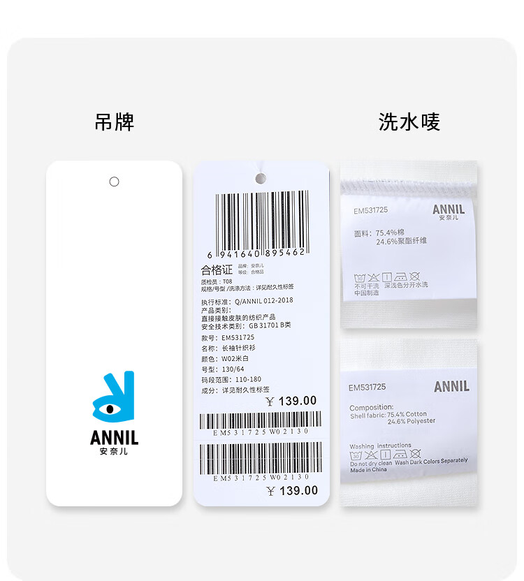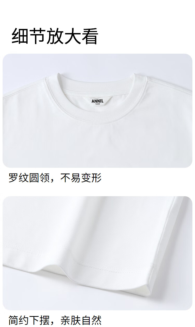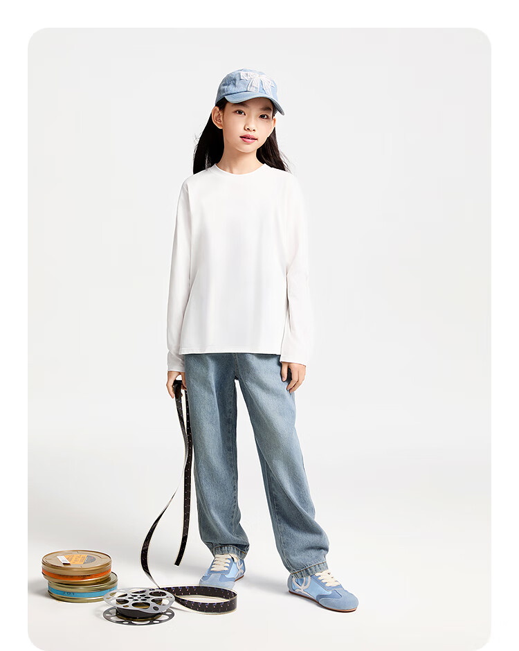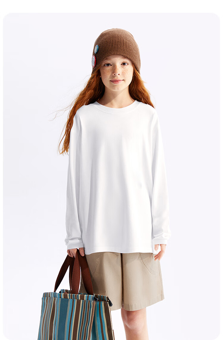 安奈儿速干小白T男女童长袖T恤针织衫2025新款宽松弹力抑菌亲子装 米白 110