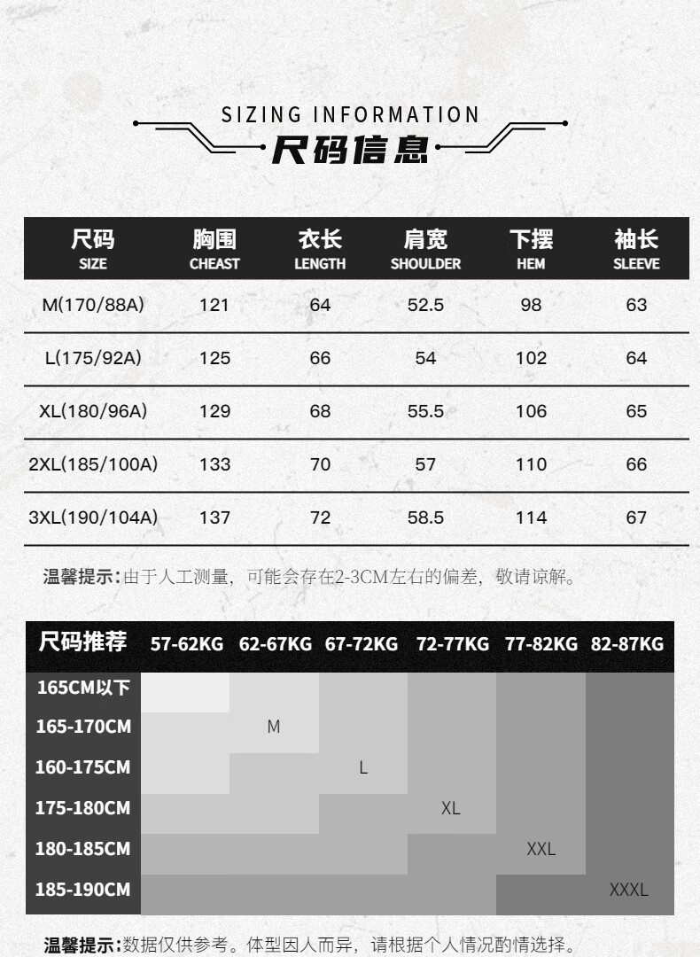China (cm) 165 / 88-90 170 / 96-98 175 / 108-110 180 / 118-122 185 / 126-130
