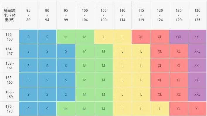 China (cm) 160-165/84-86 165-170 / 88-90 167-172 / 92-96 168-173 / 98-102 170-176 / 106-110