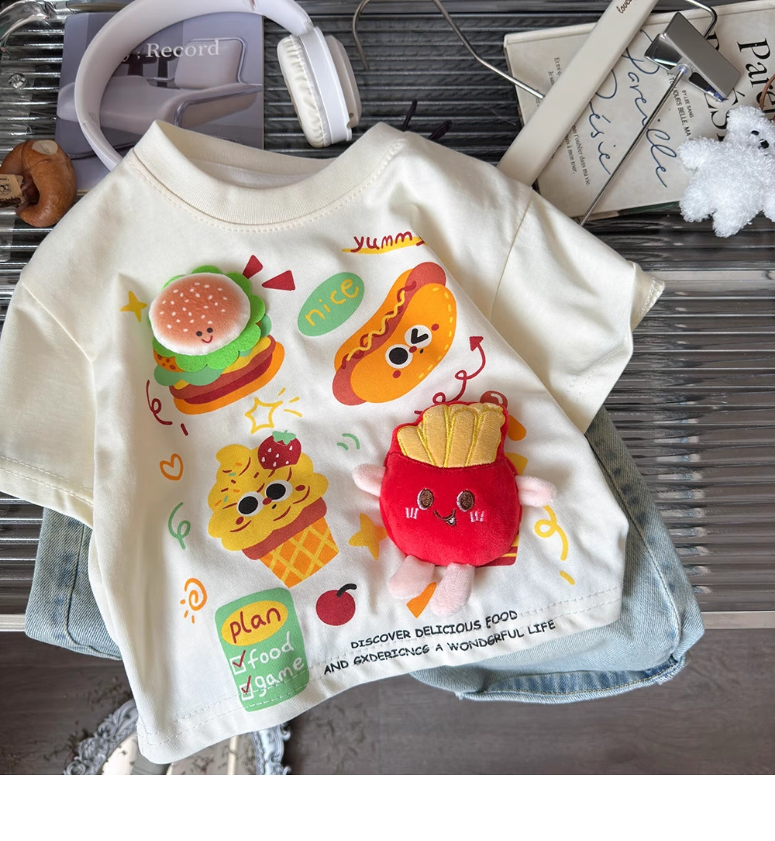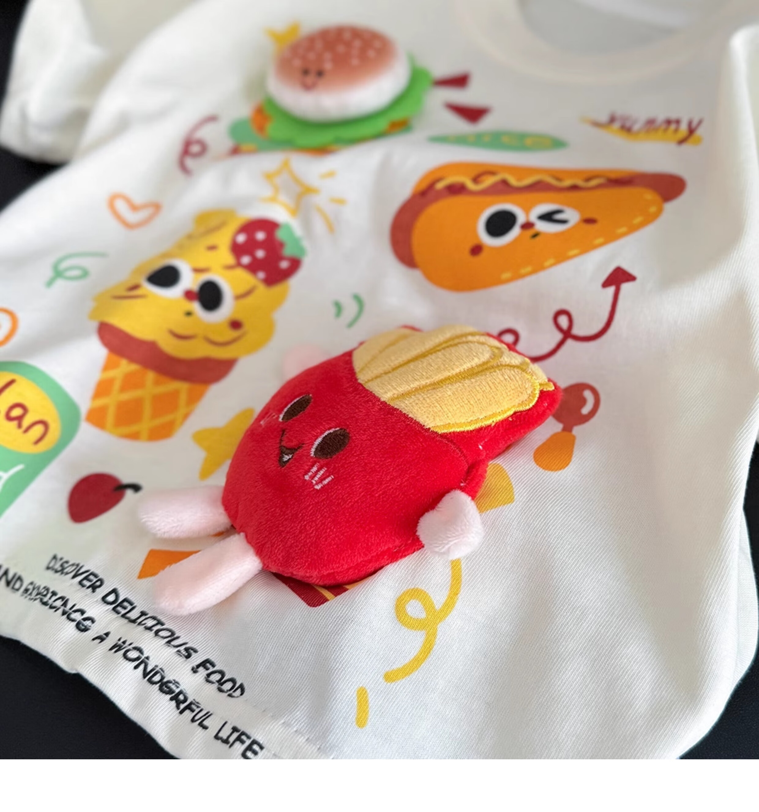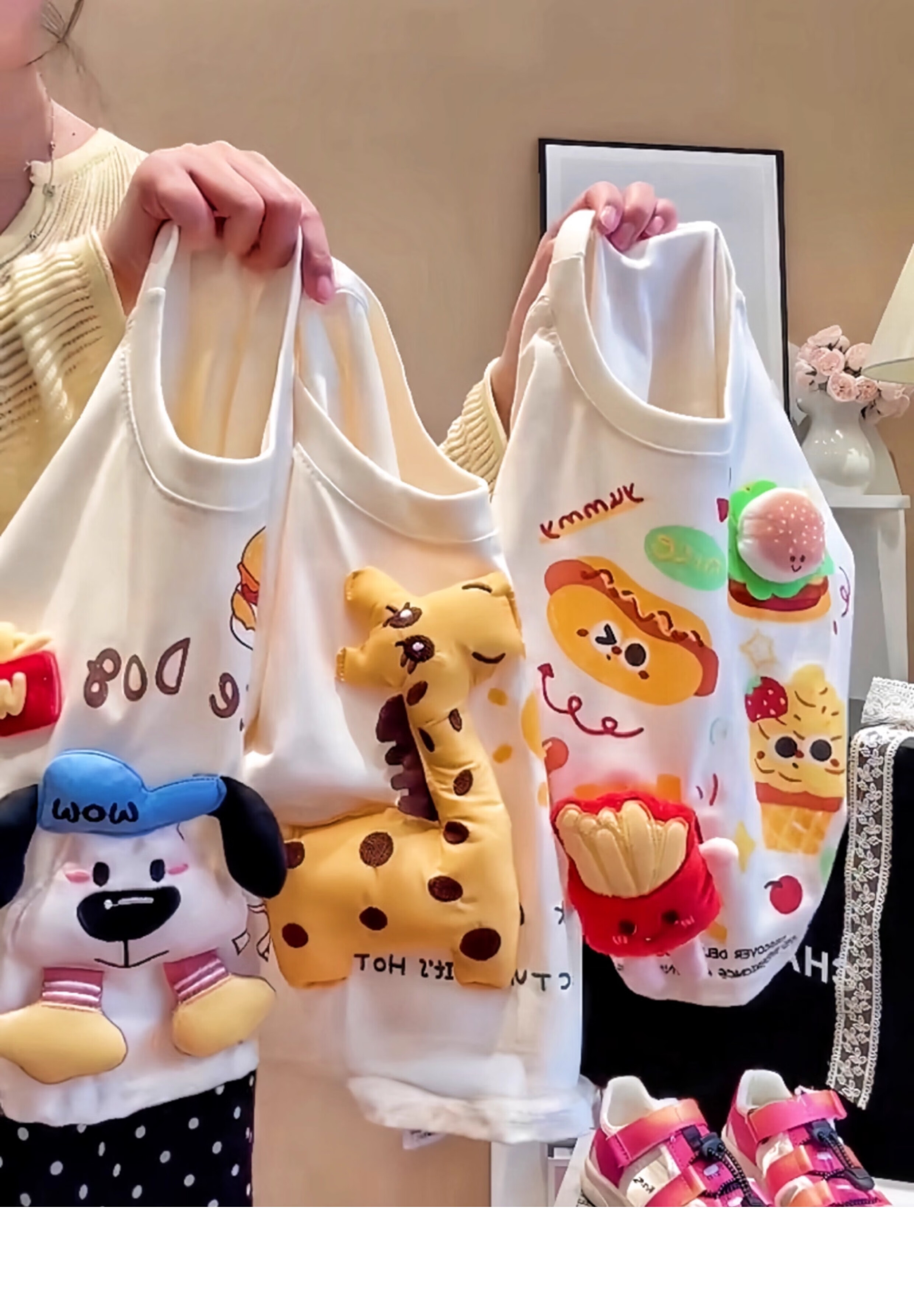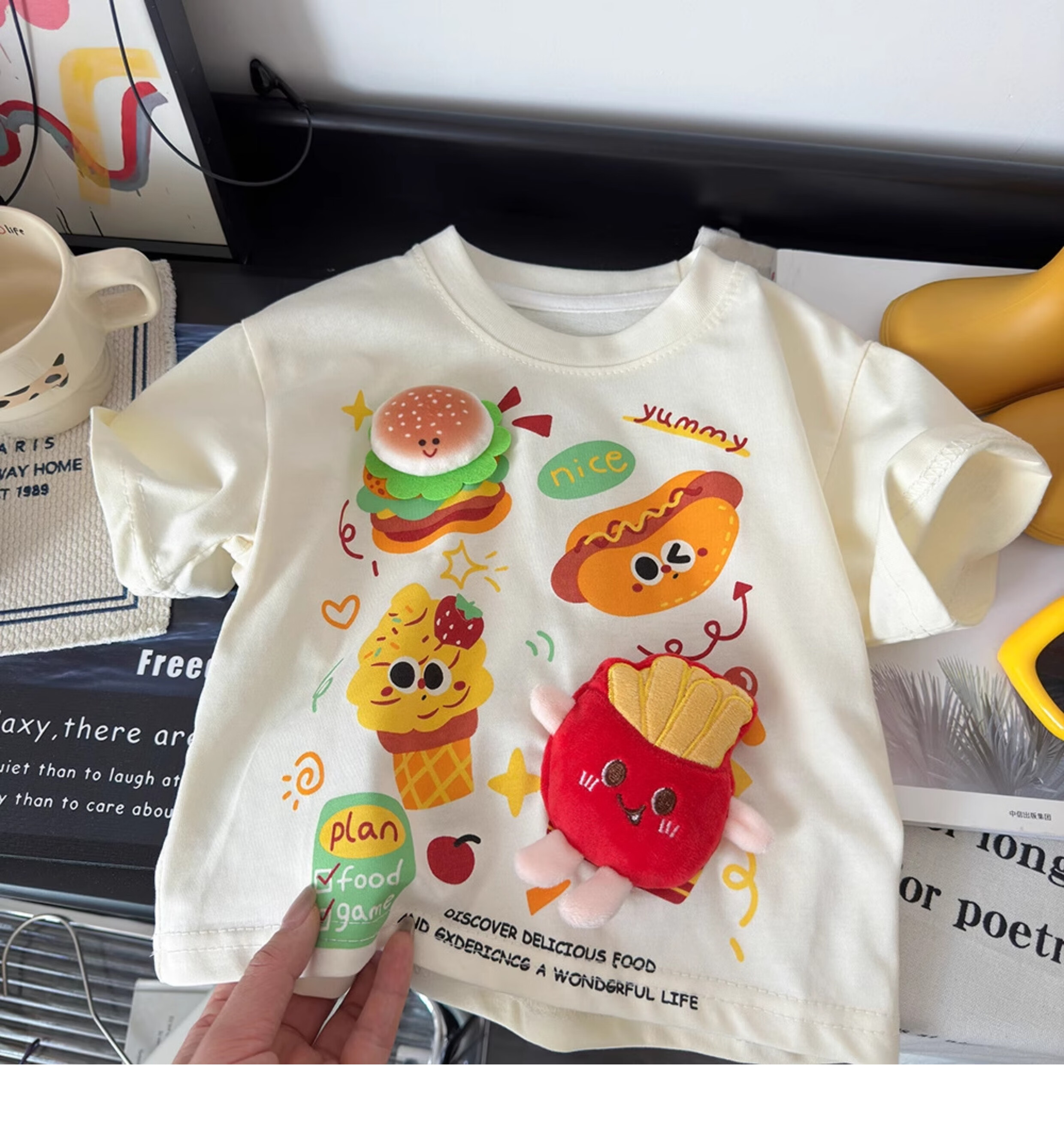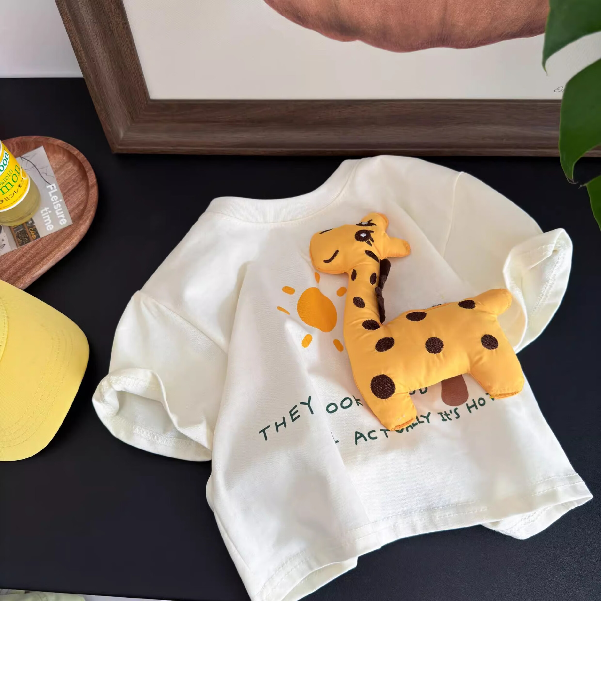 儿童纯棉短袖T恤子款立体玩偶卡通印花趣味可爱汉堡男女童薄款 阳光长颈鹿短袖 90 cm