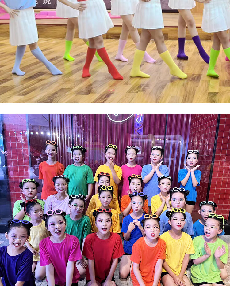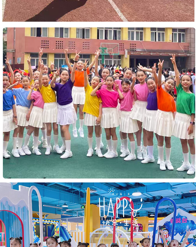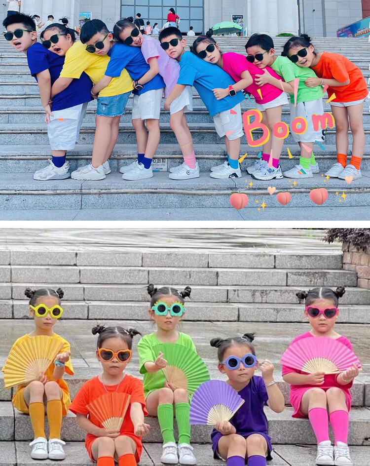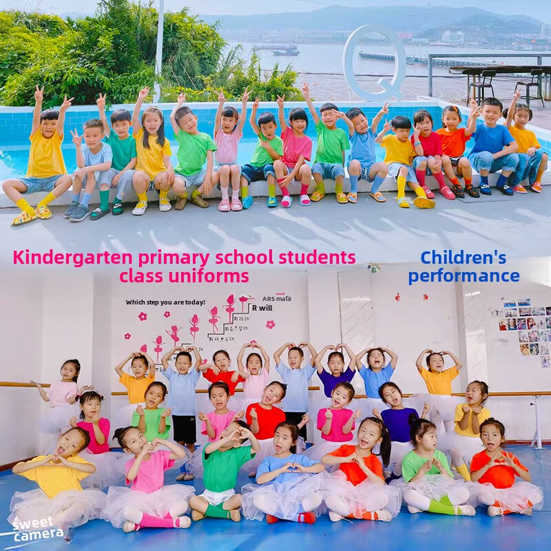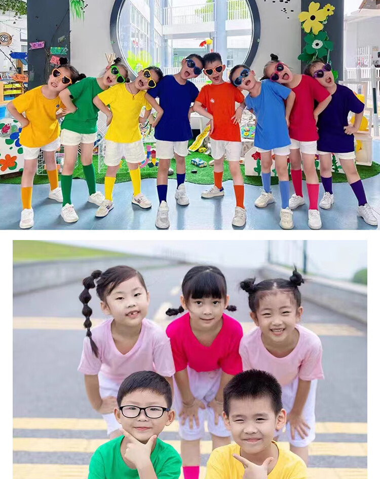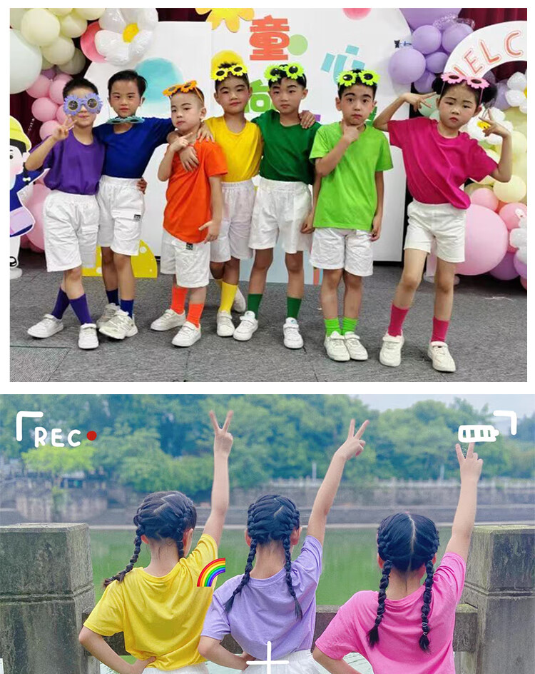 采购产品儿童彩色t恤小学生表演服运动会班服幼儿园糖果色 杜鹃花色+袜子短裤 100 cm[高90/20斤以b