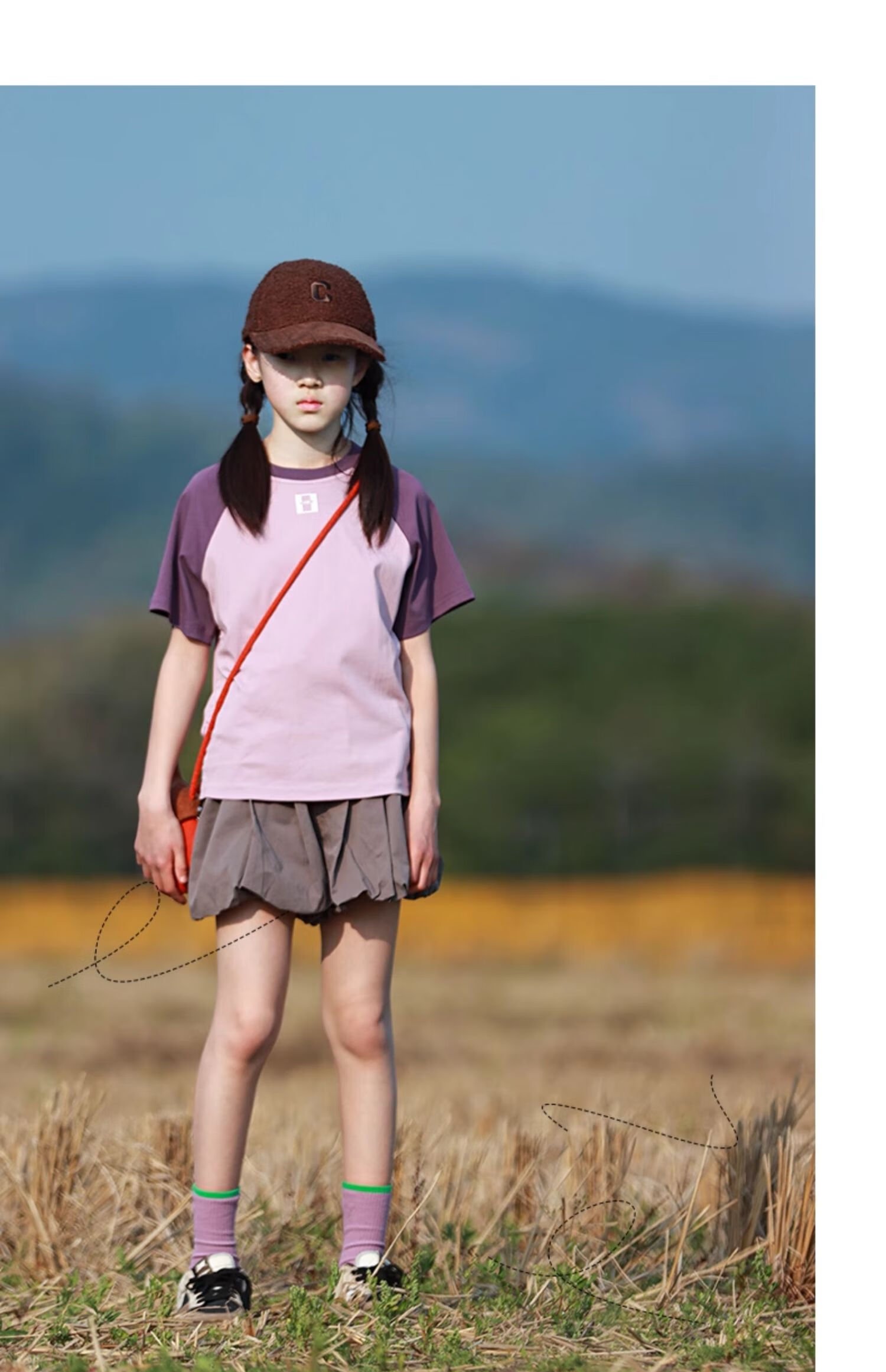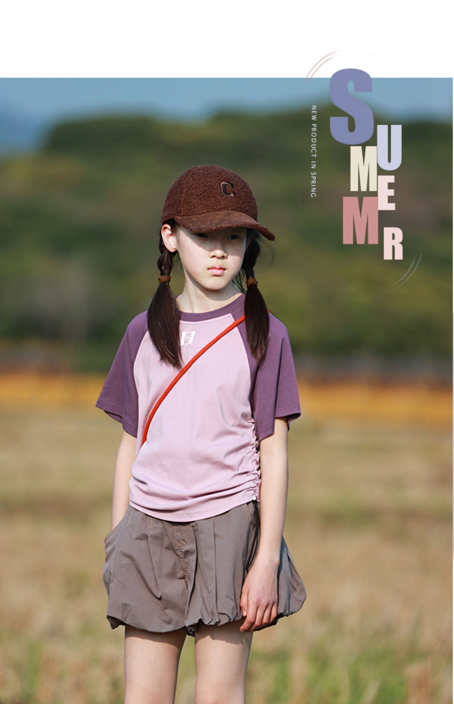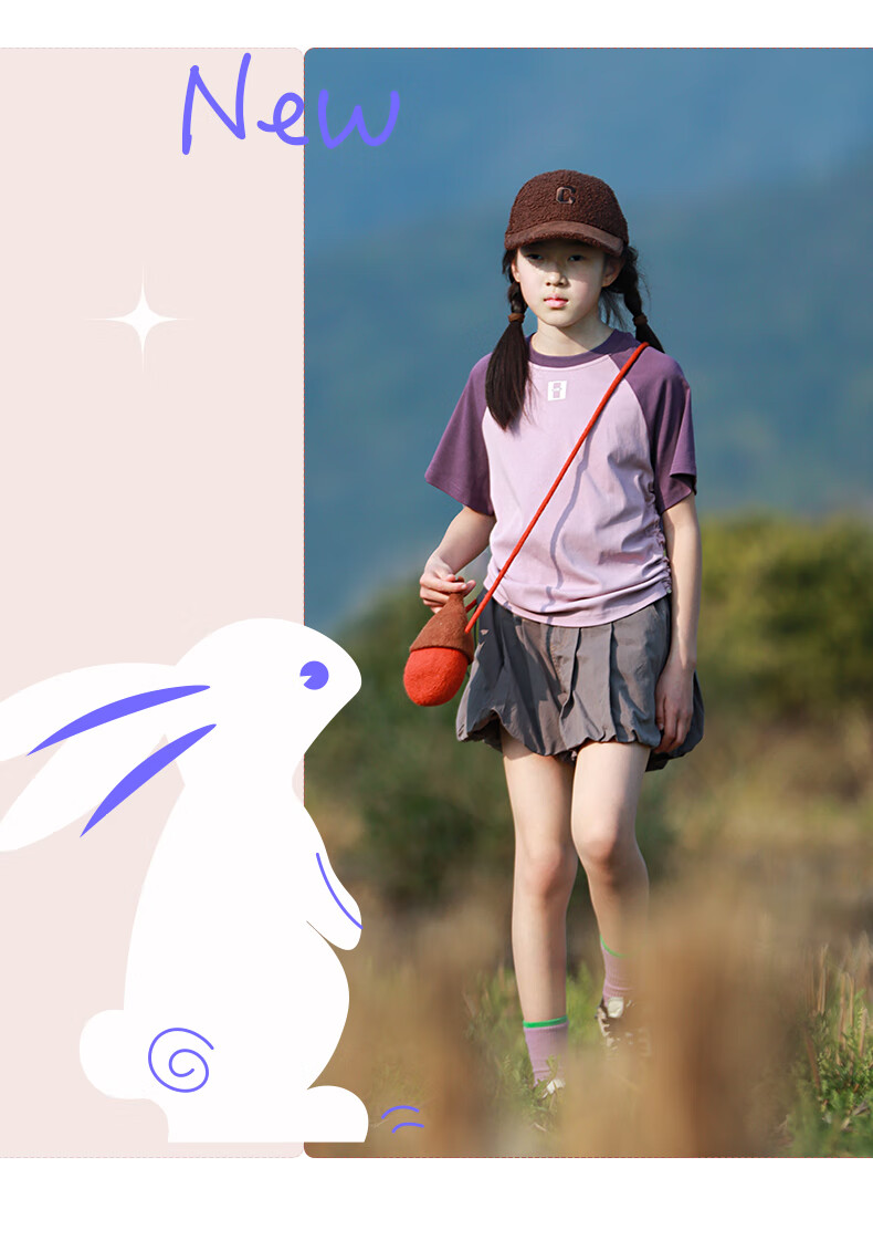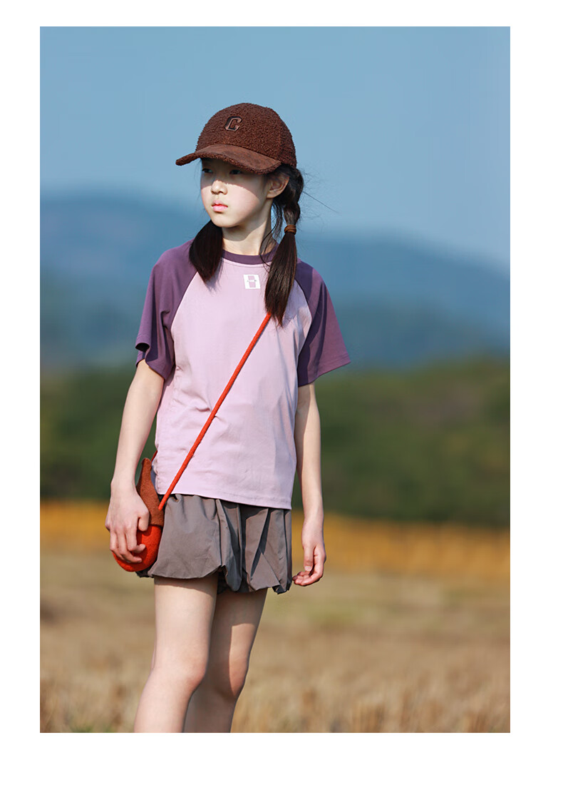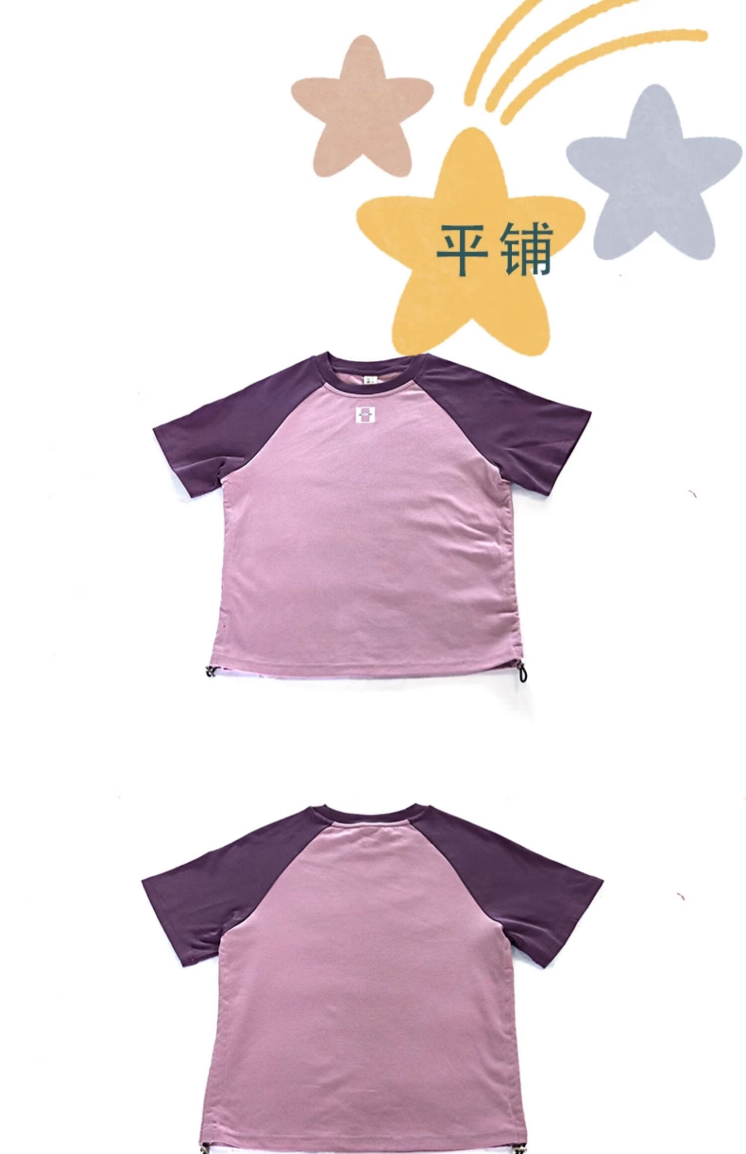 涂碟幽女童短袖T恤夏季中大童气质甜美套头百搭子装插肩袖拼接上衣 芋紫(短袖)ANT50206YZ抽绳短袖T 130 cm