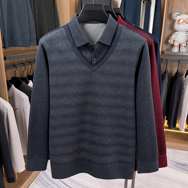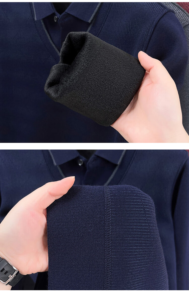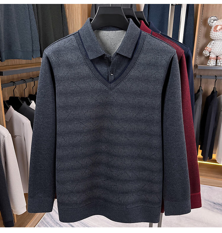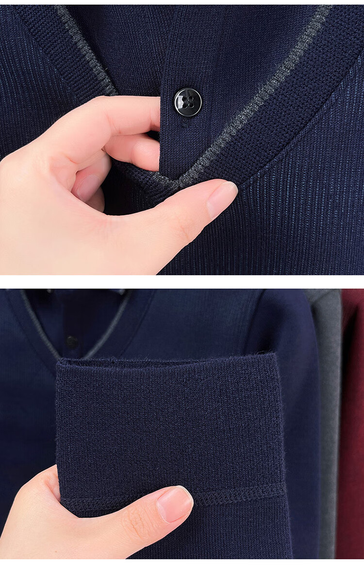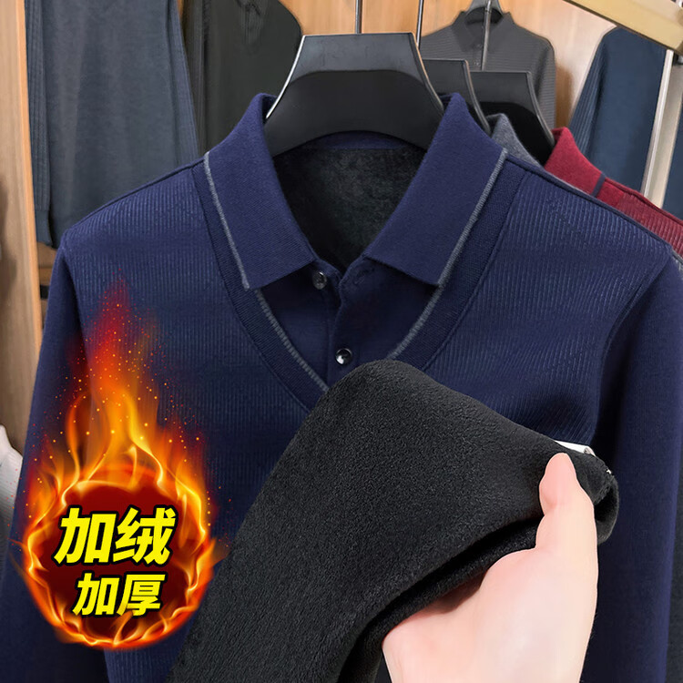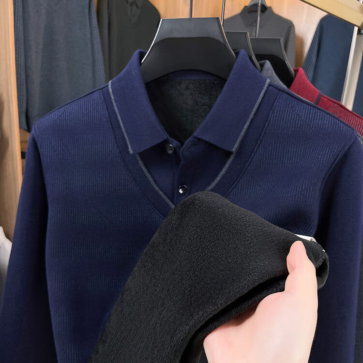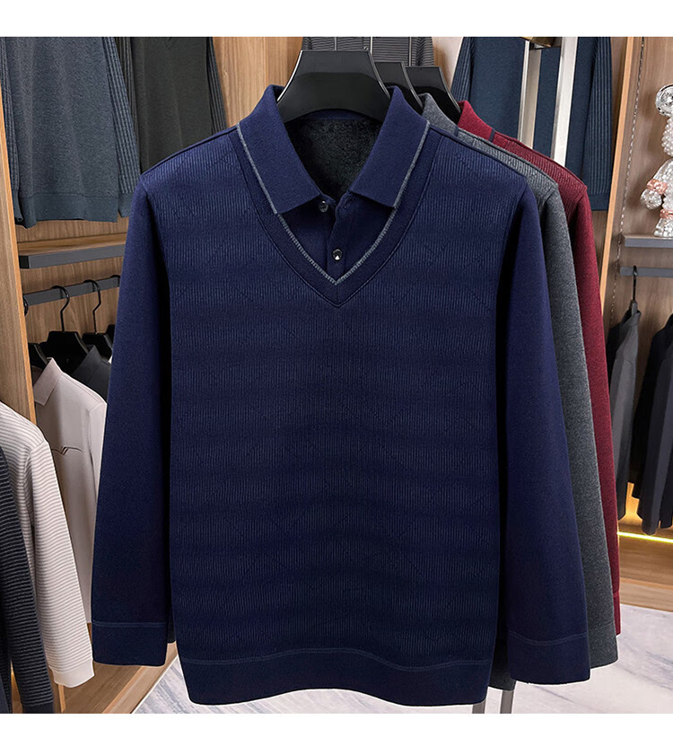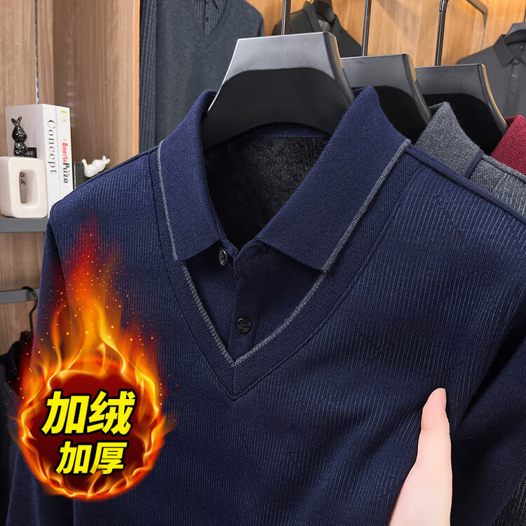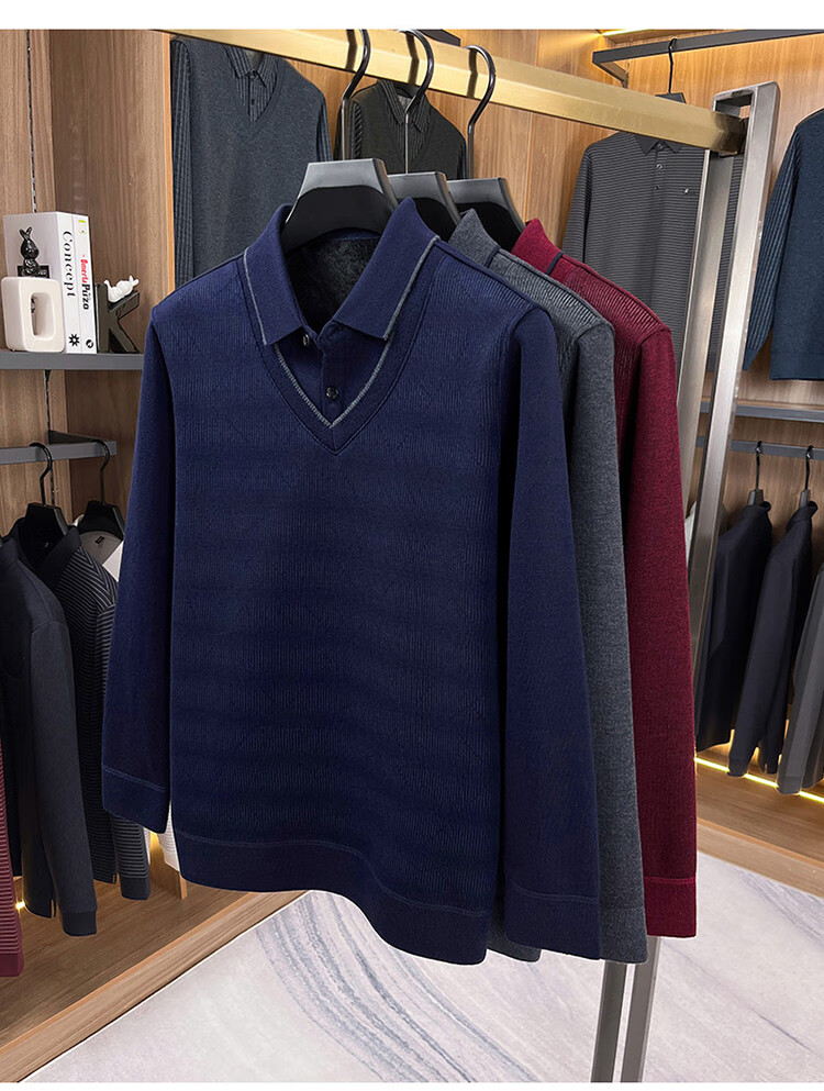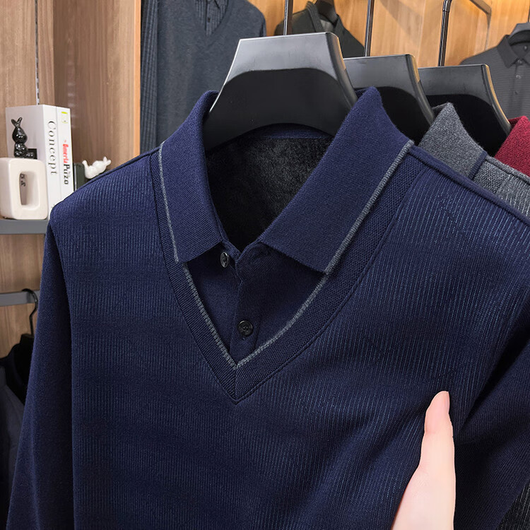 Nasawassup light luxury men's middle-aged and elderly fake two-piece sweatshirt shirt collar plus velvet thickening warm dad sweater base sweater navy blue XL 52