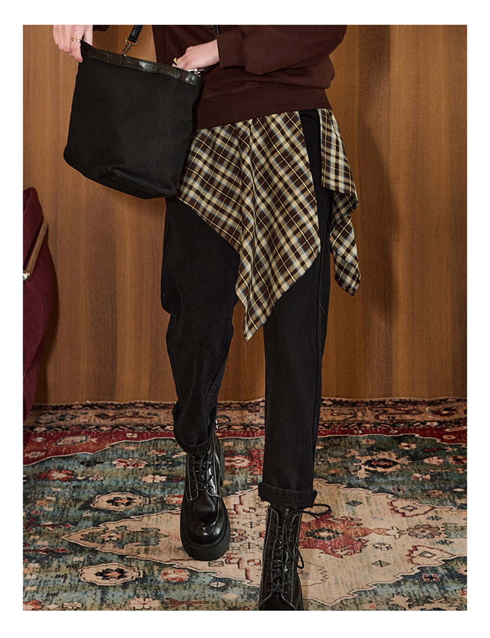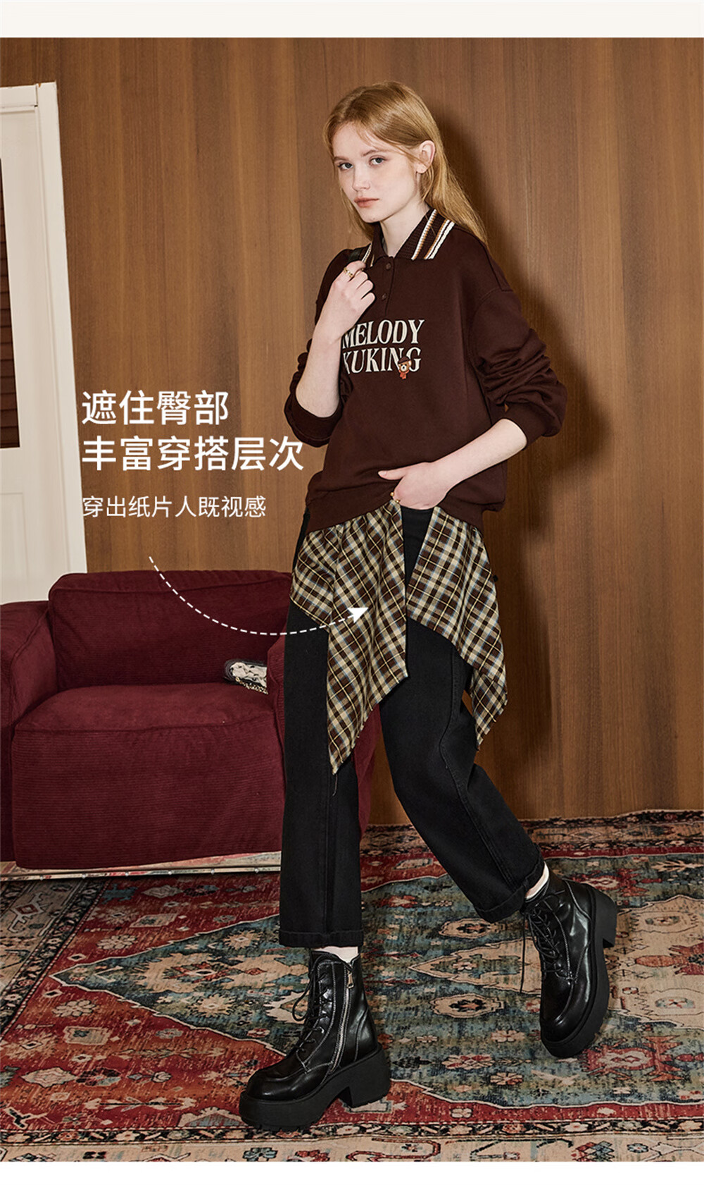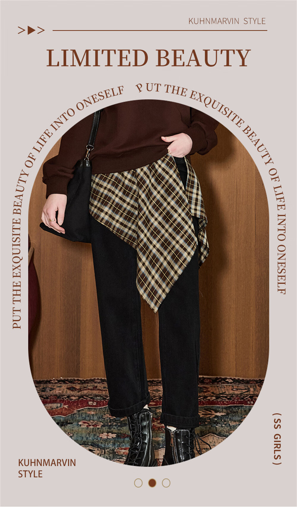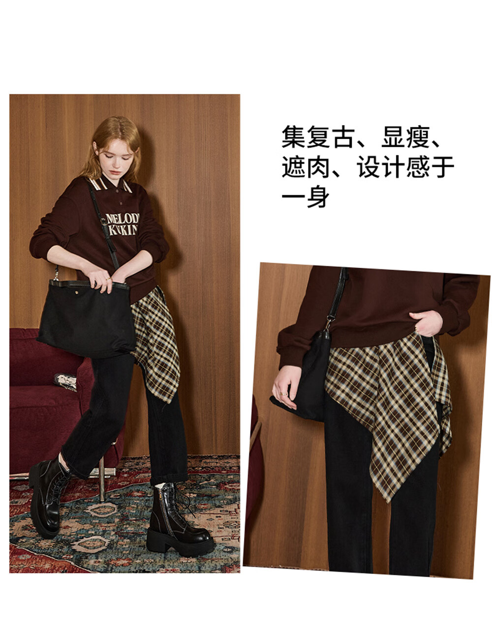 库恩玛维(KUHNMARVIN)咖色格纹一片式系带半身裙女2025年冬季新款叠穿不规则裙K20751 咖色格纹 均码