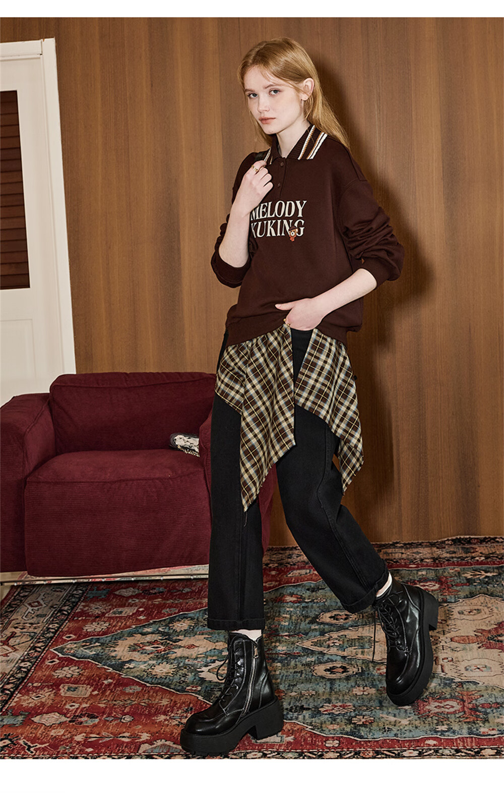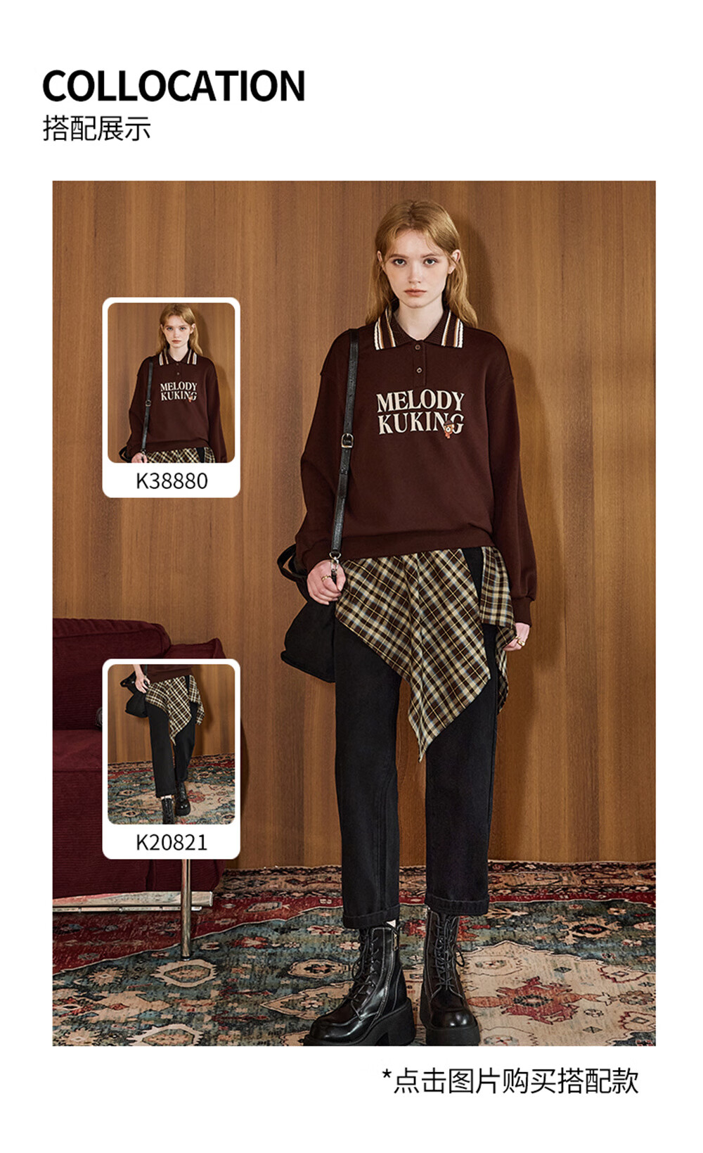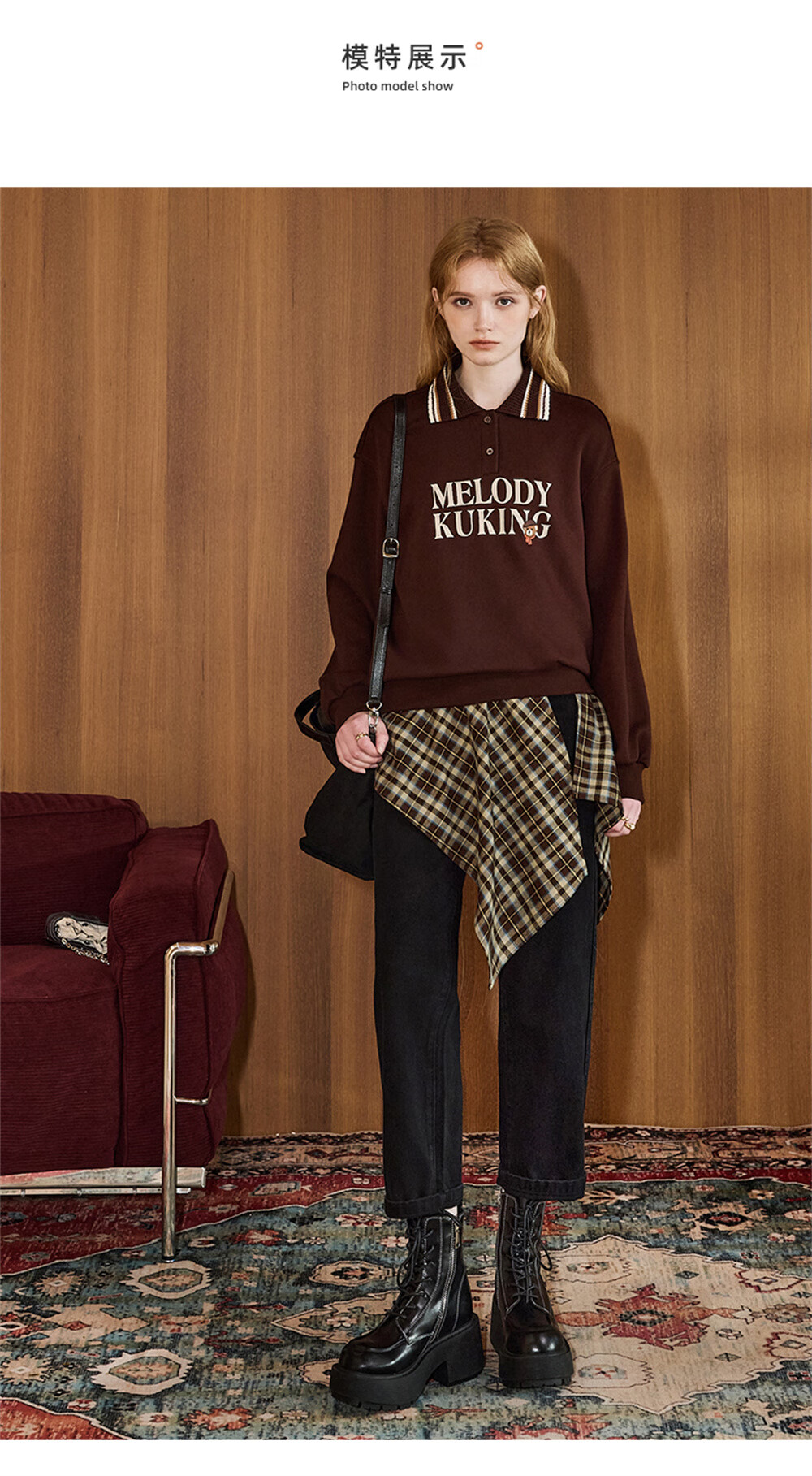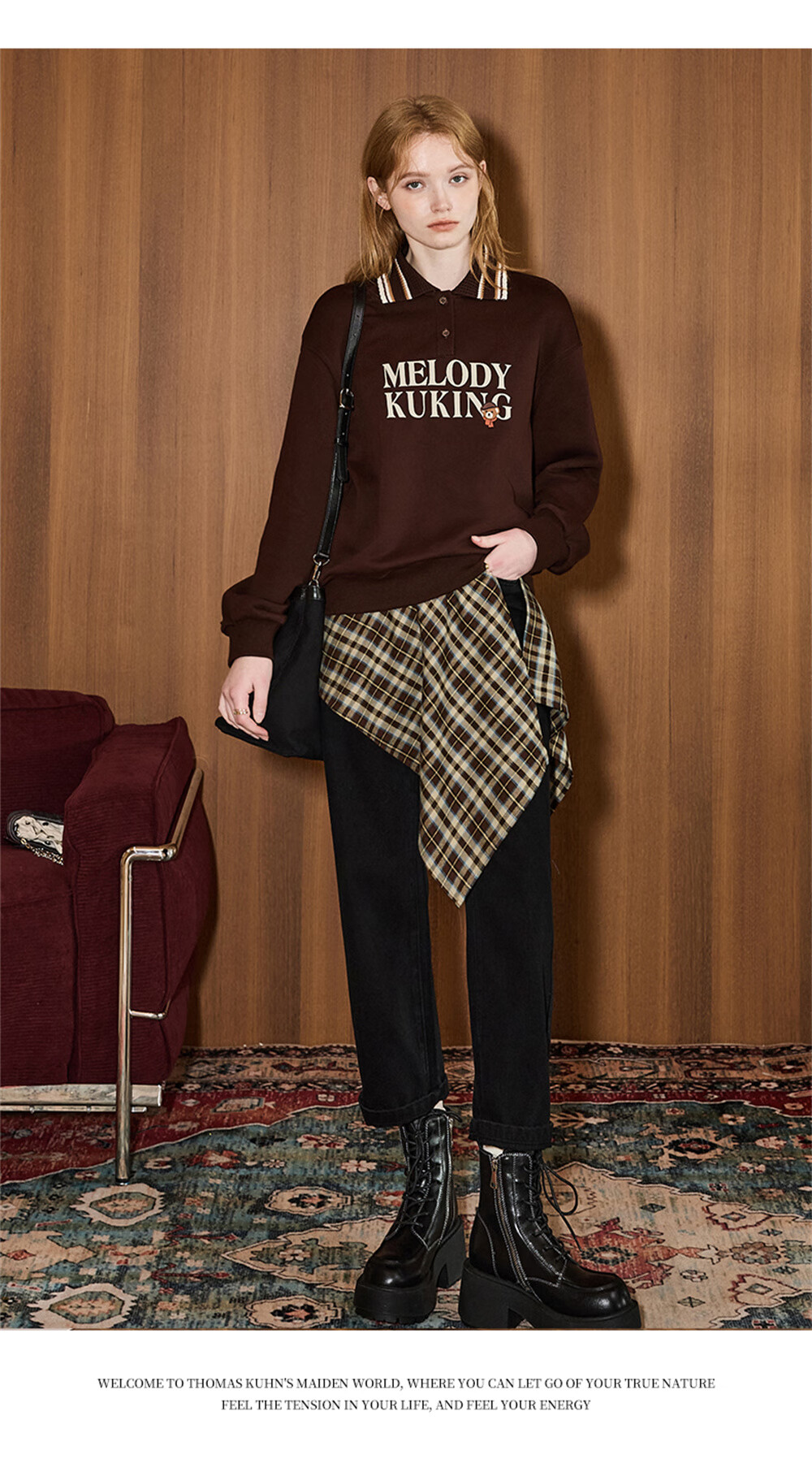库恩玛维(KUHNMARVIN)咖色格纹一片式系带半身裙女2025年冬季新款叠穿不规则裙K20751 咖色格纹 均码