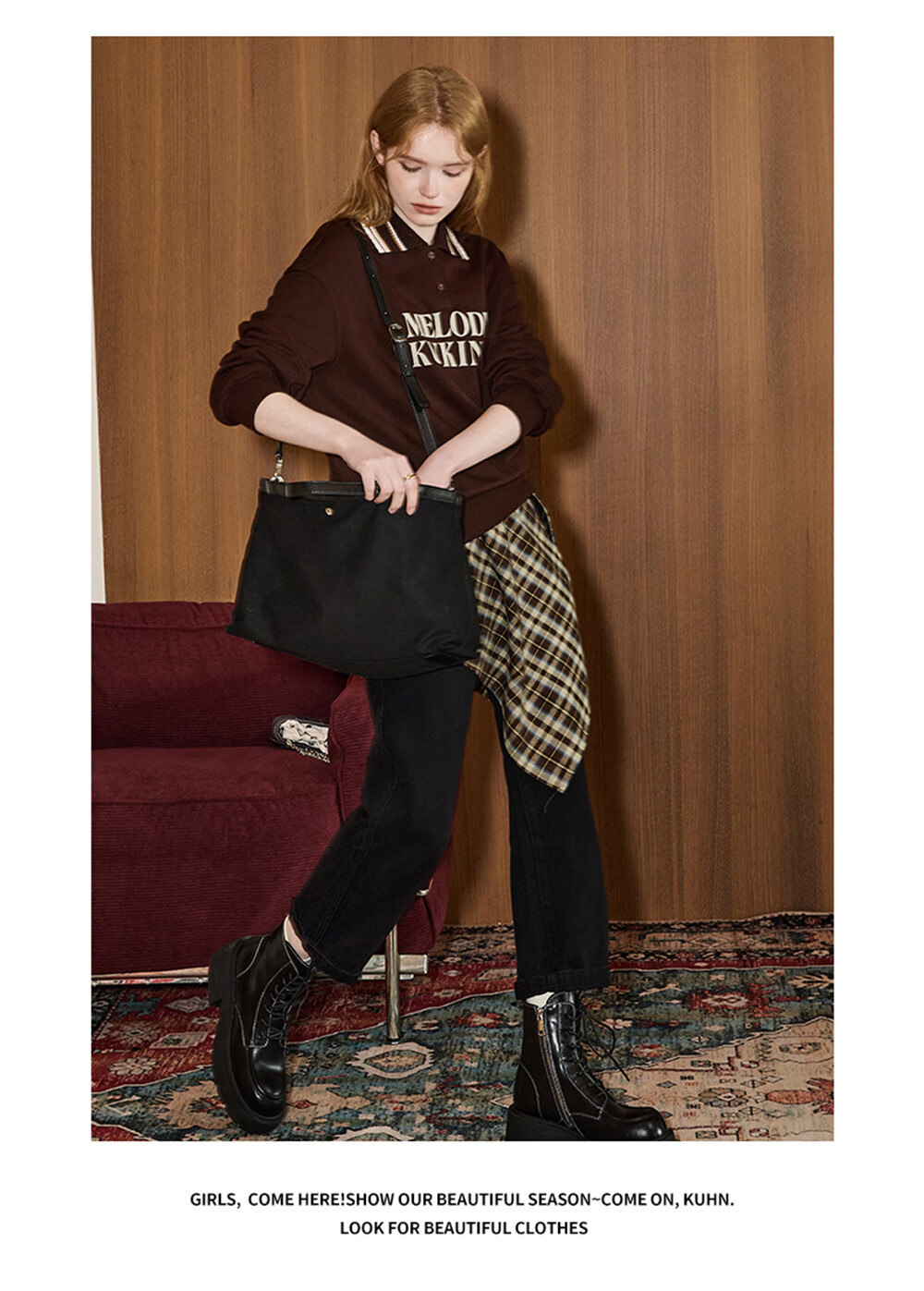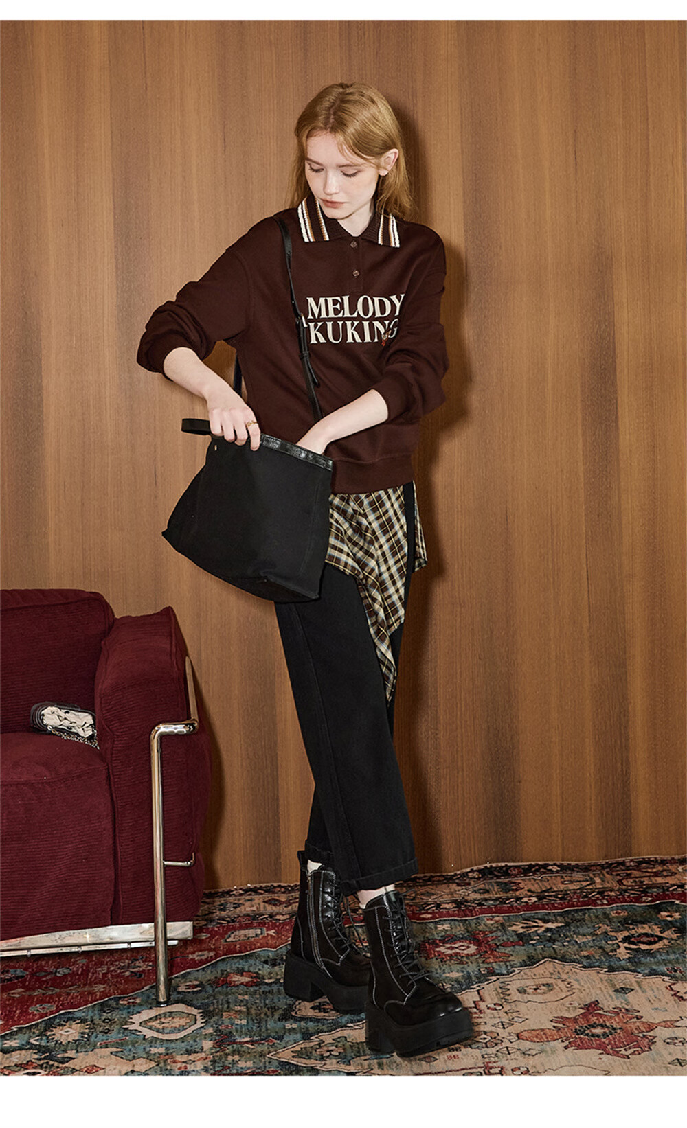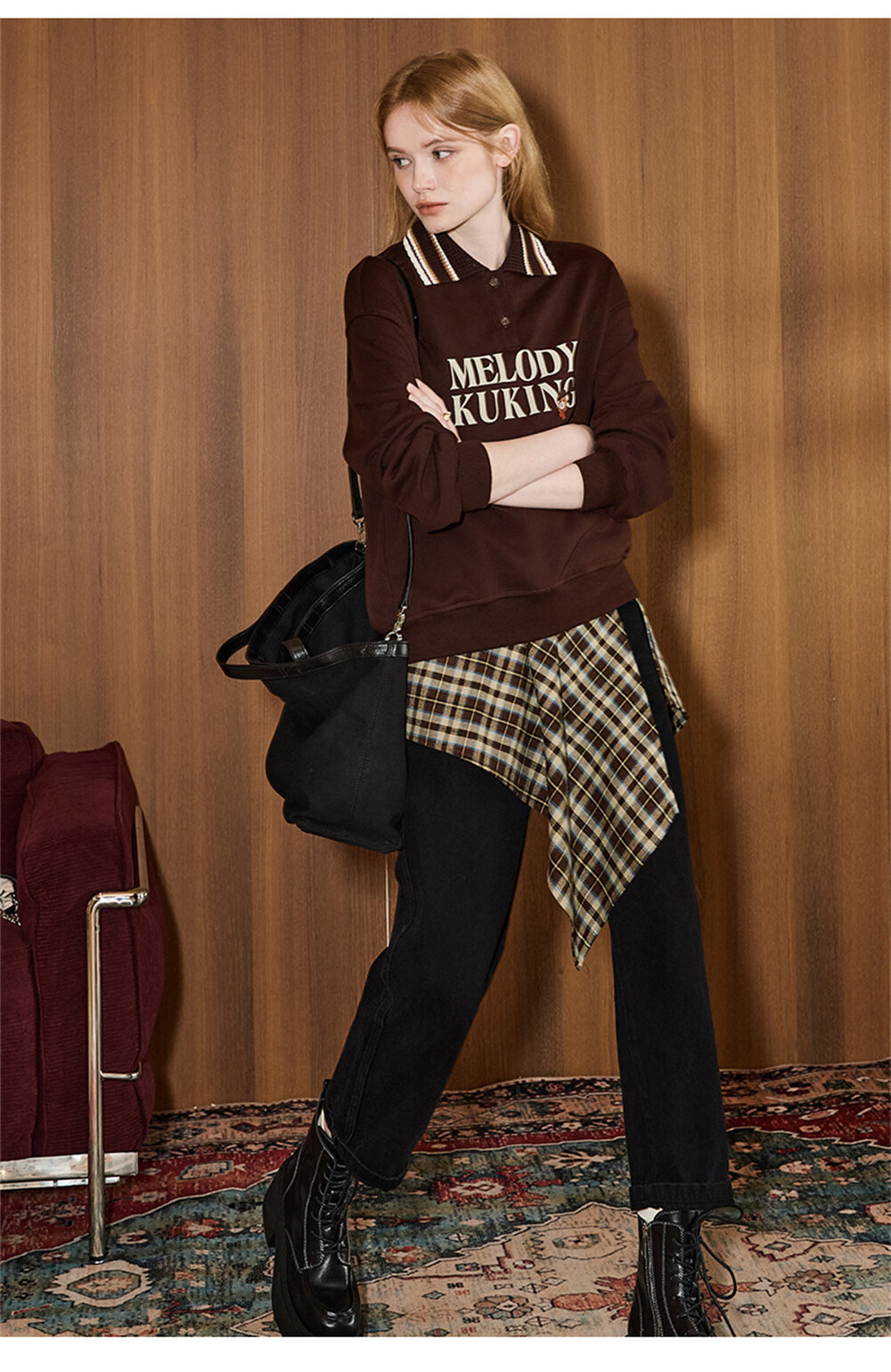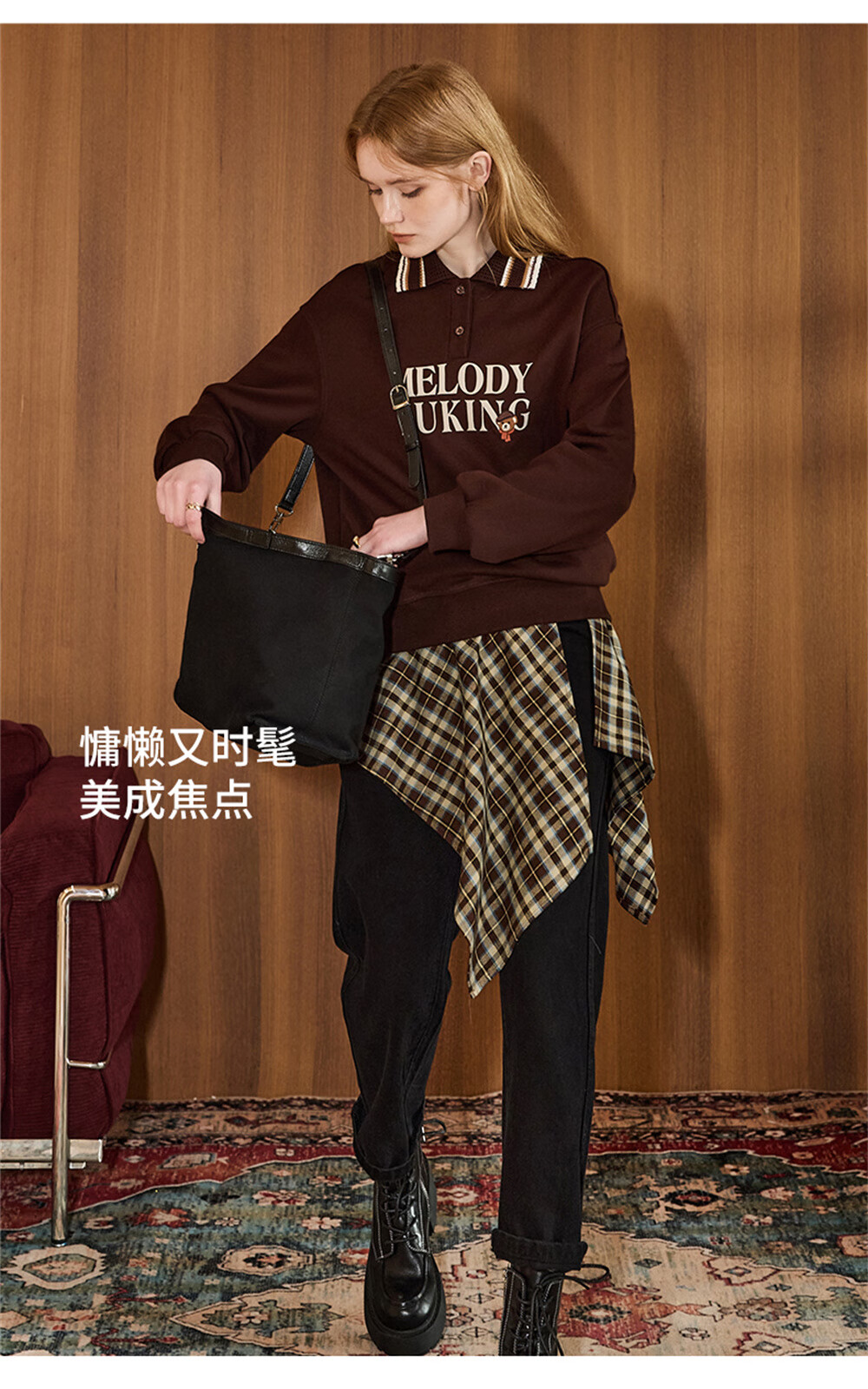 库恩玛维(KUHNMARVIN)咖色格纹一片式系带半身裙女2025年冬季新款叠穿不规则裙K20751 咖色格纹 均码