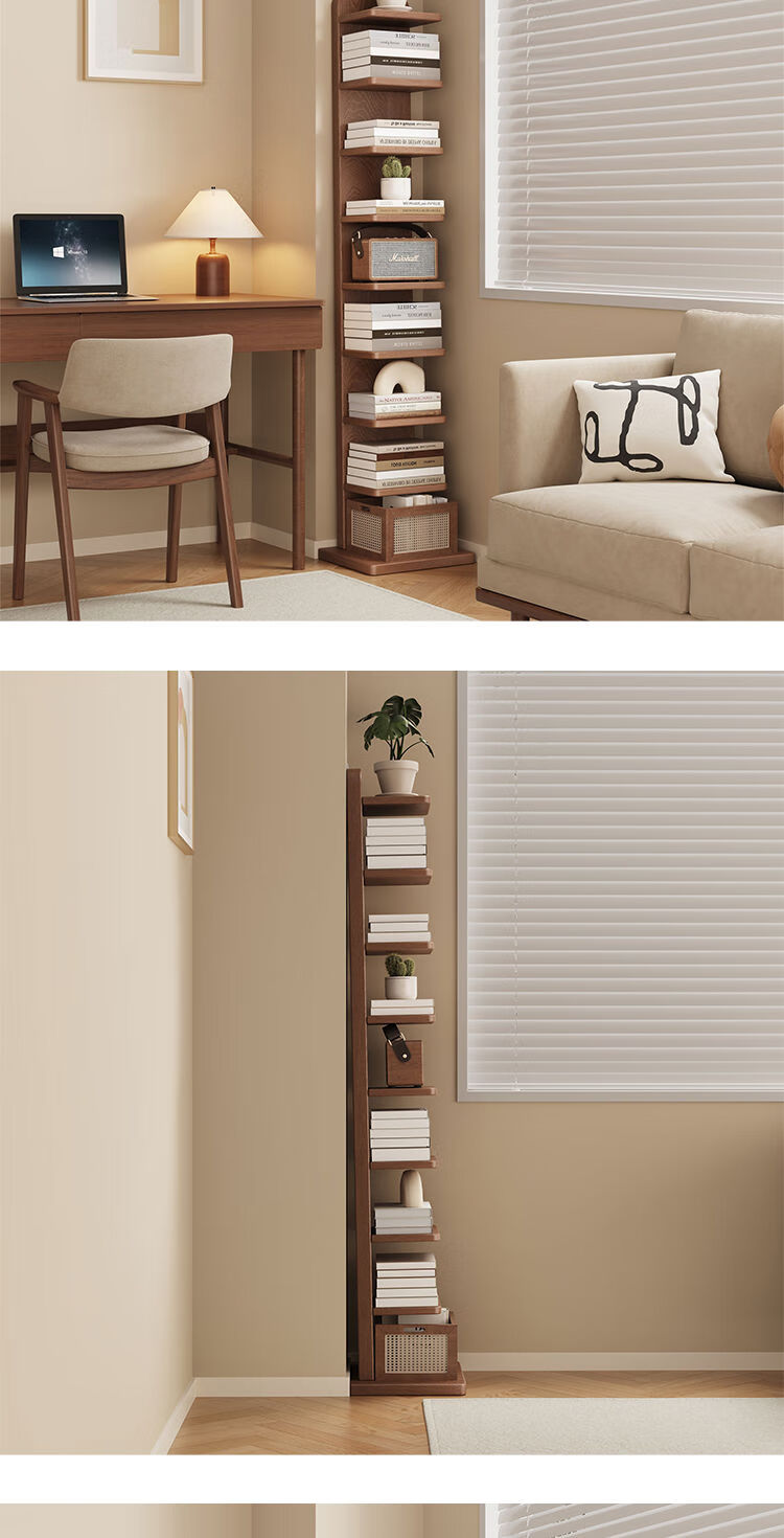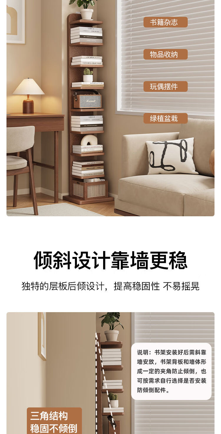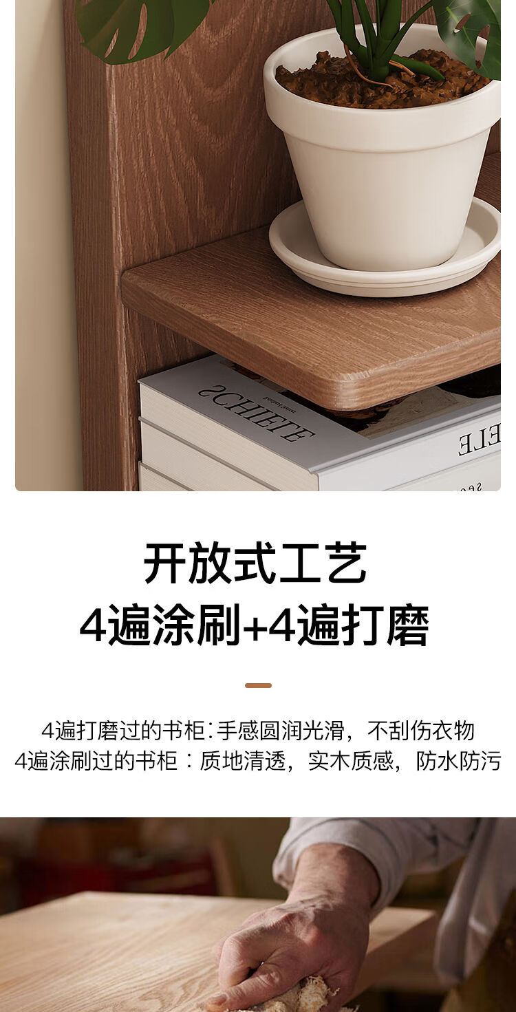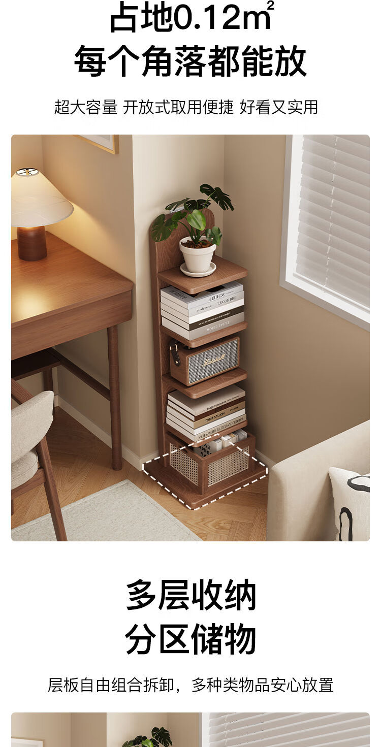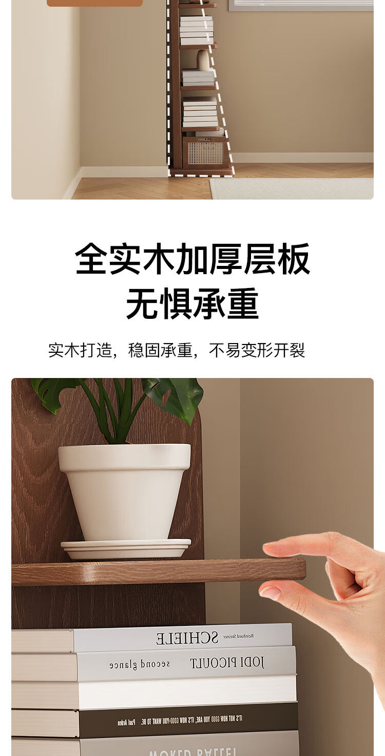 语森忆实木书架落地防倾倒窄书柜隐形置物架立式客厅家用转角学生小书架 胡桃色5层原木加厚