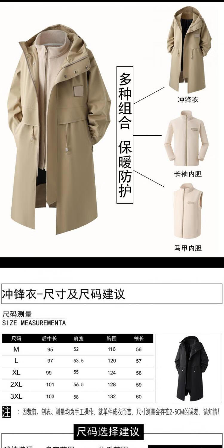 锡曼尘杭州意法风衣男中长款羊羔绒内胆三合一男款冬季加厚保暖加绒连帽 长袖内胆卡其 M 适合体重 100-115