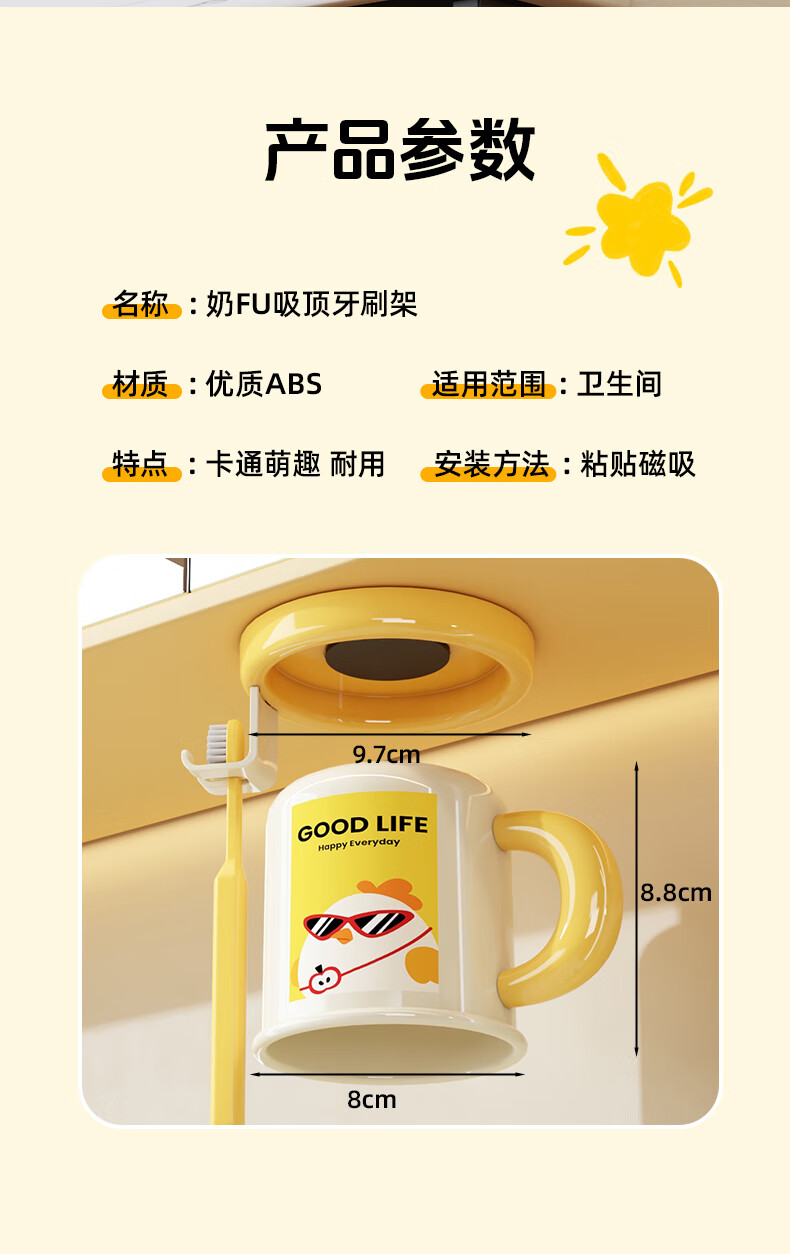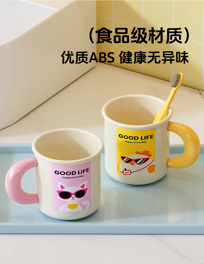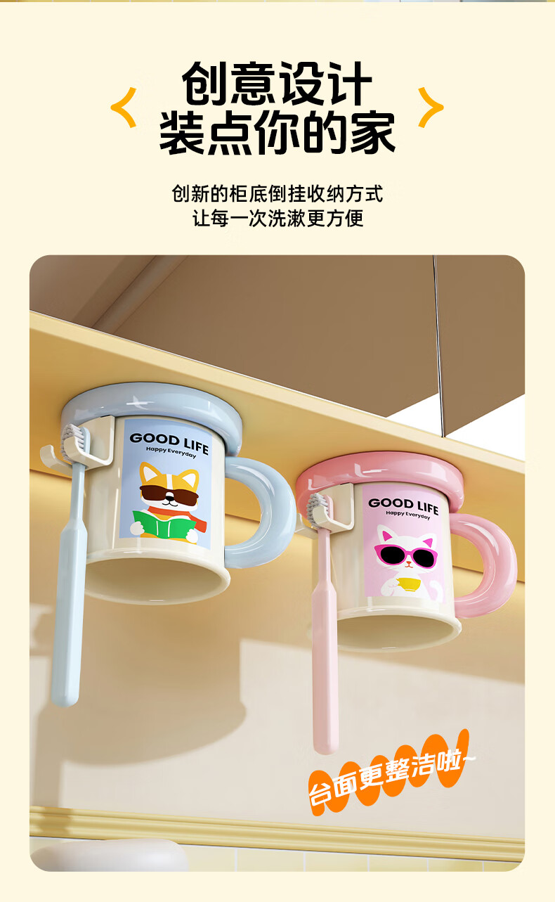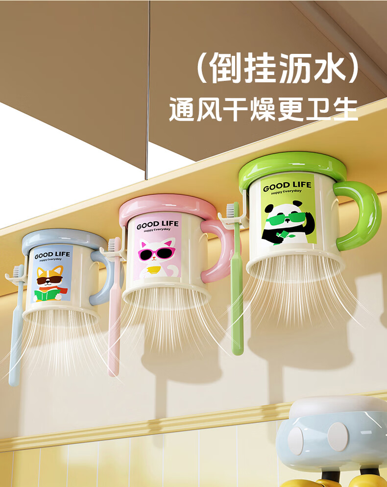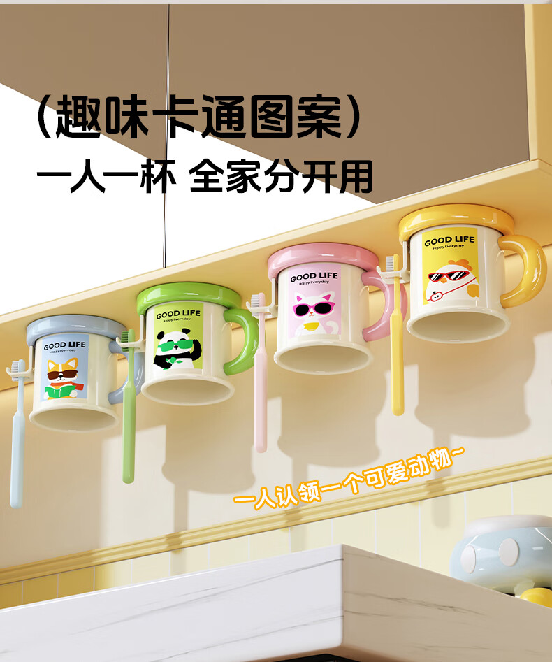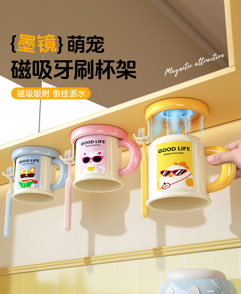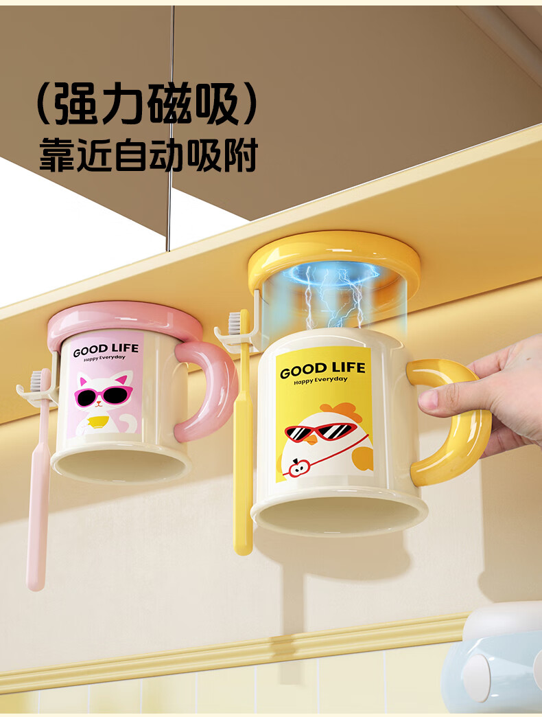 Iosn dopamine mirror cabinet magnetic handle mouthwash cup storage rack without punching for a family of four hanging upside down to drain water for washing and storage puppy + chick cartoon illustration + hanging upside down to drain water